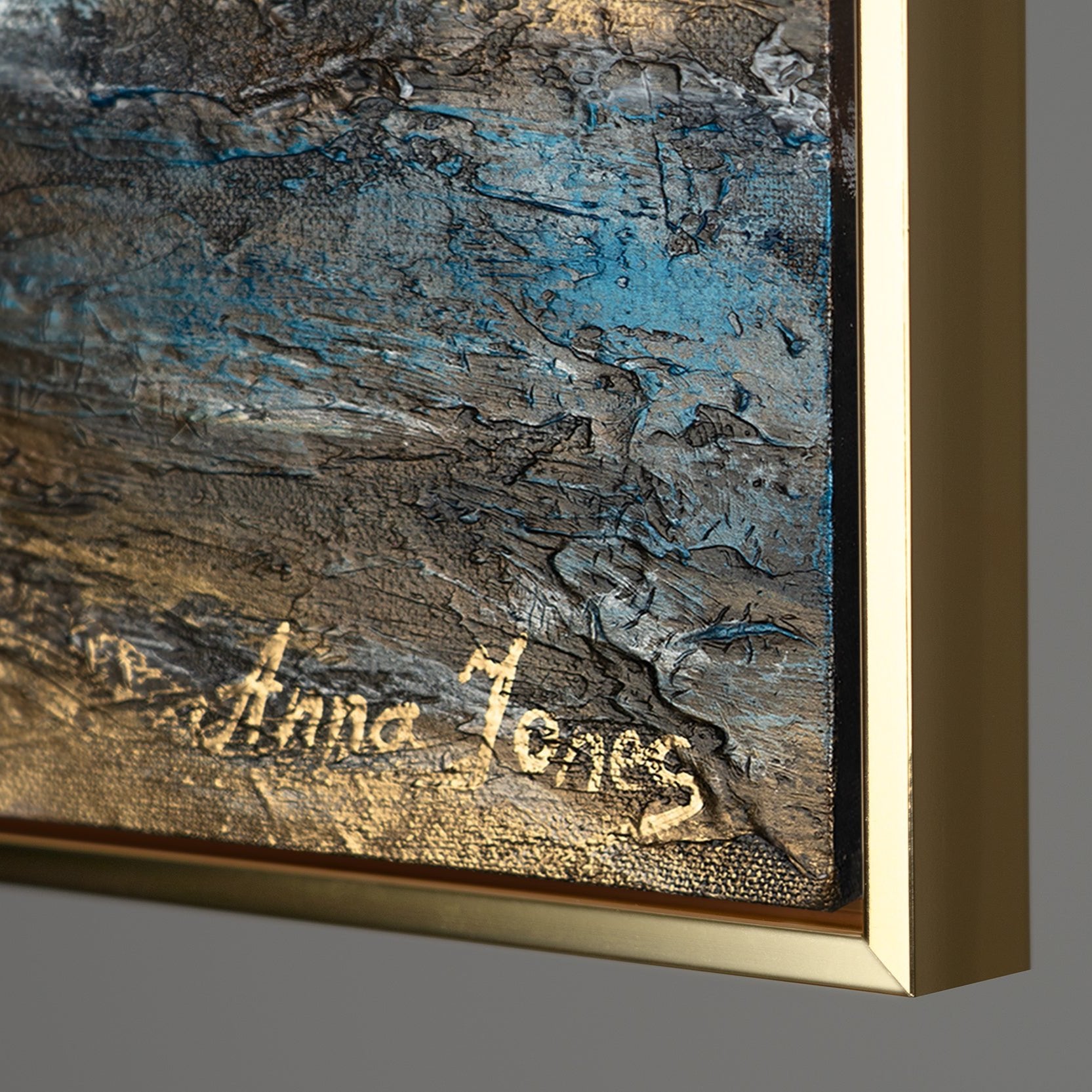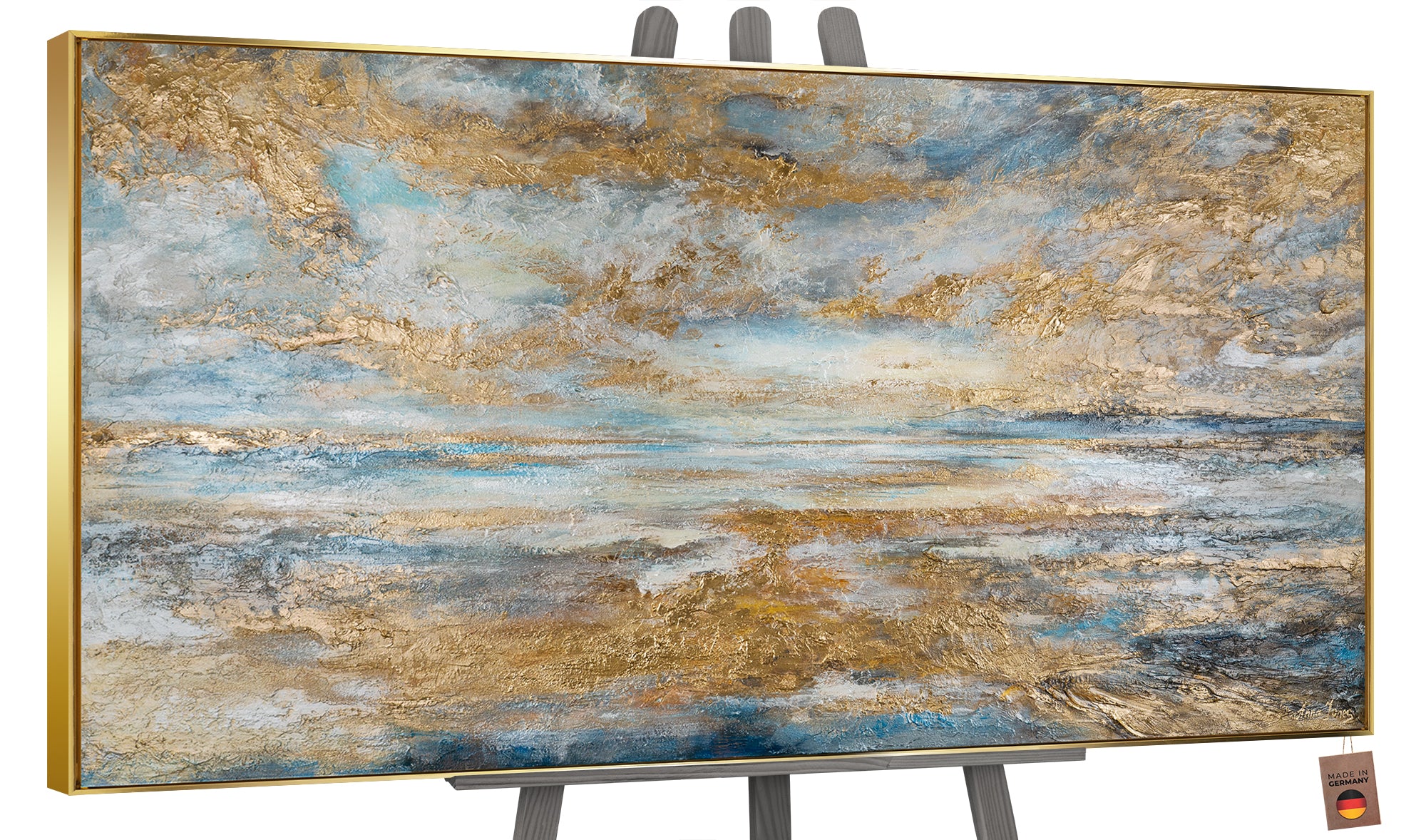 Handgemalte Acryl Abstrakte Malerei im Querformat mit Goldakzenten mit Rahmen Goldene Bucht