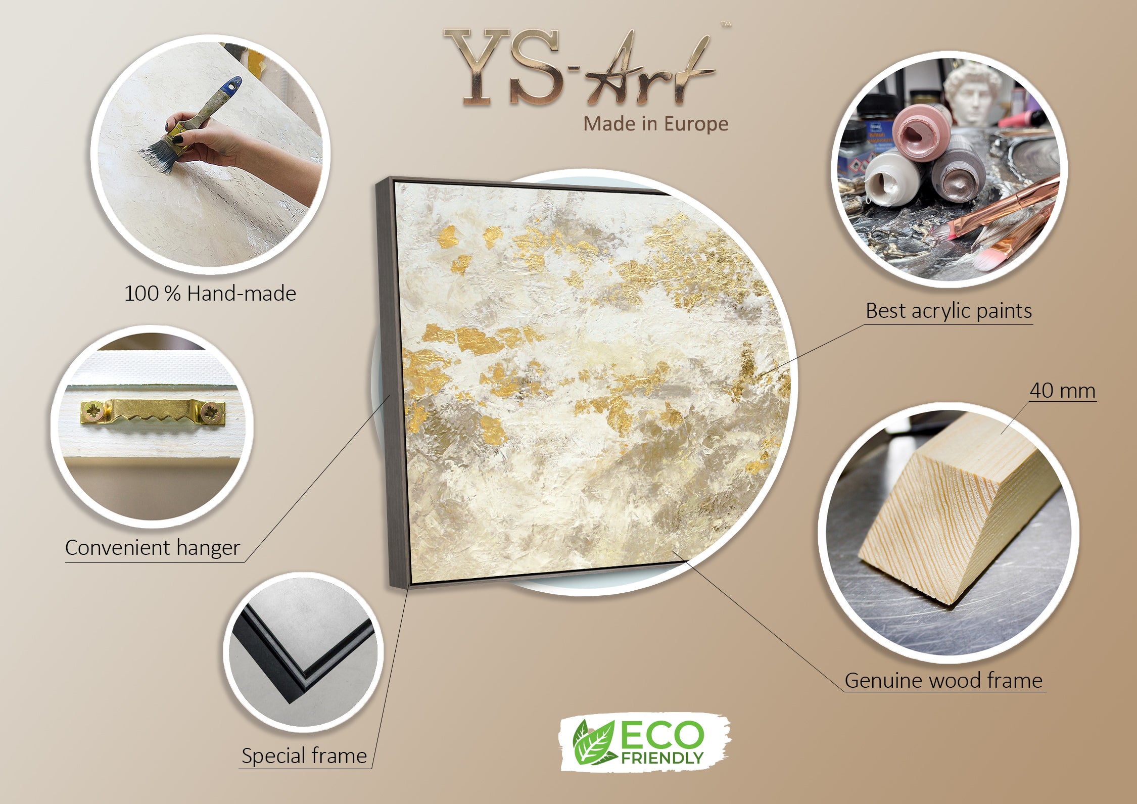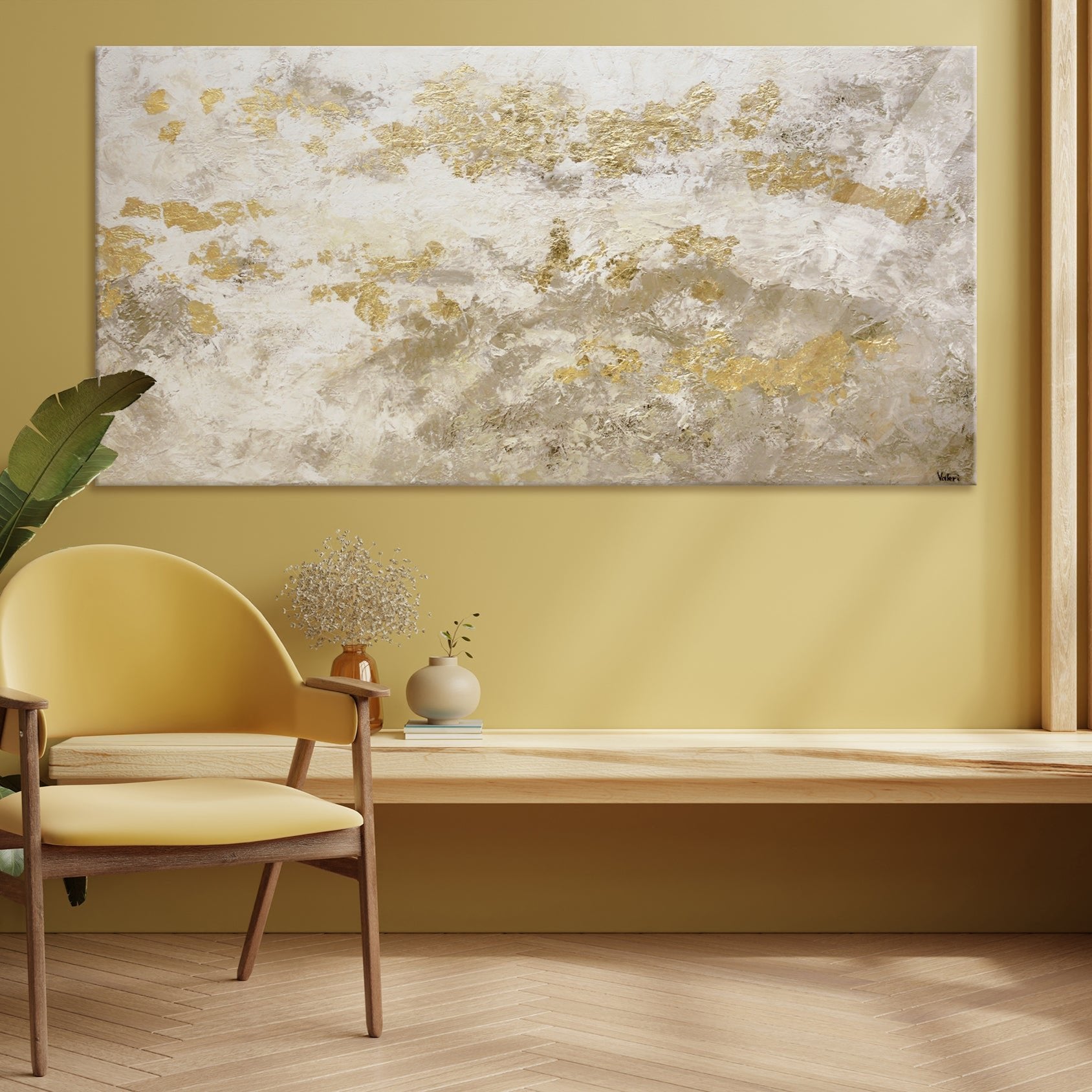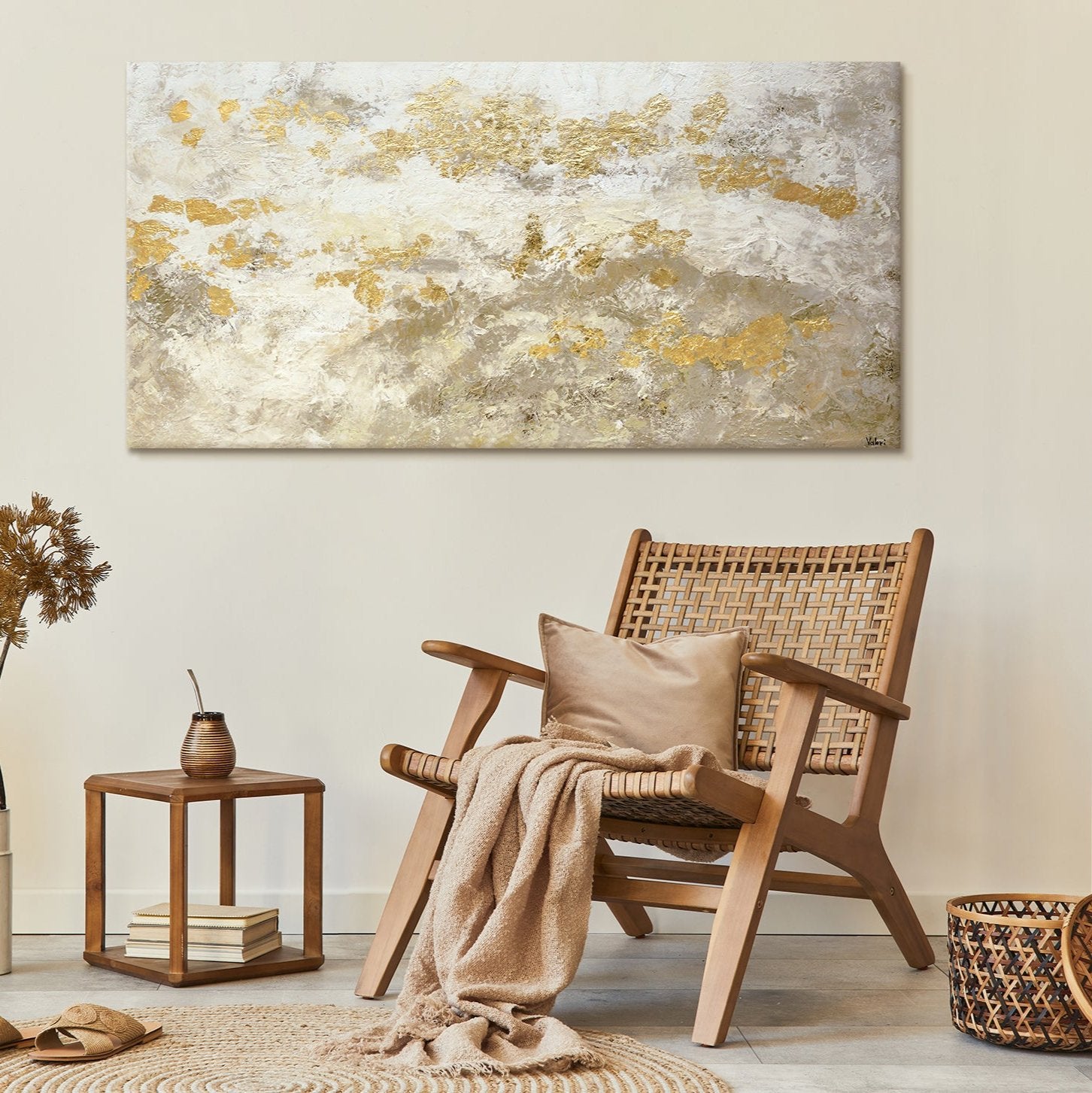 Tauchen Sie ein in die Welt der modernen abstrakten Kunst mit diesem handgemalten Acrylbild auf Leinwand. Die harmonische Kombination aus warmen Beige- und Weißtönen mit strahlenden Goldakzenten verleiht Ihrem Raum eine luxuriöse und zeitlose Atmosphäre. Dieses Kunstwerk eignet sich perfekt als Wanddekoration für Wohnzimmer, Büros oder andere Wohnbereiche, die einen Hauch von Eleganz benötigen.