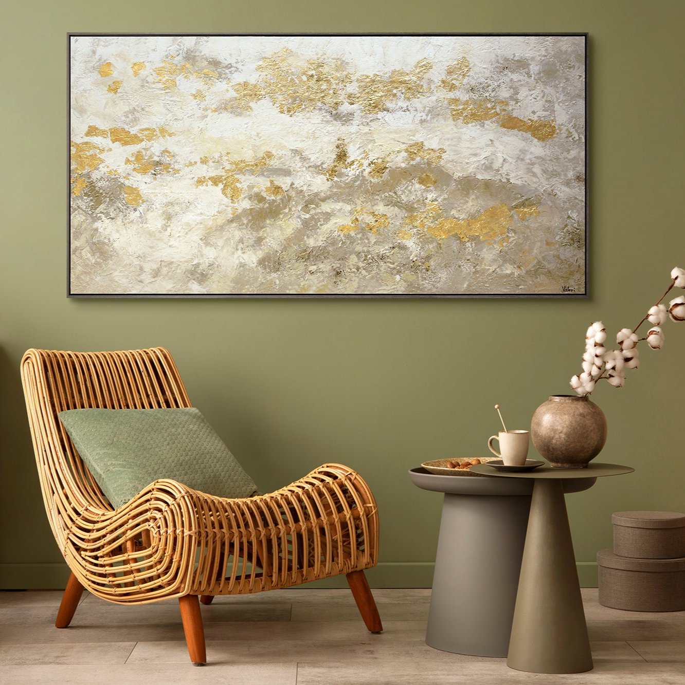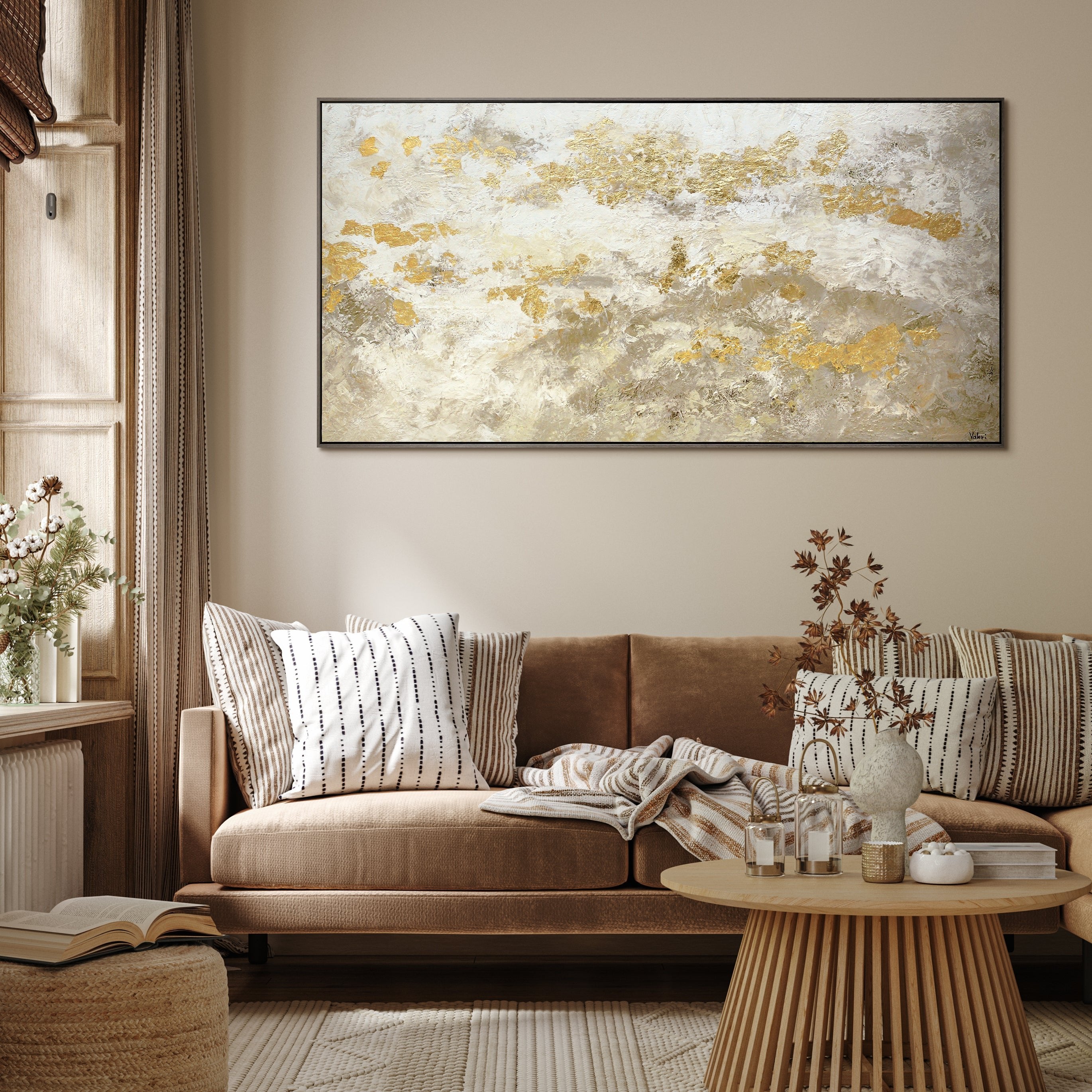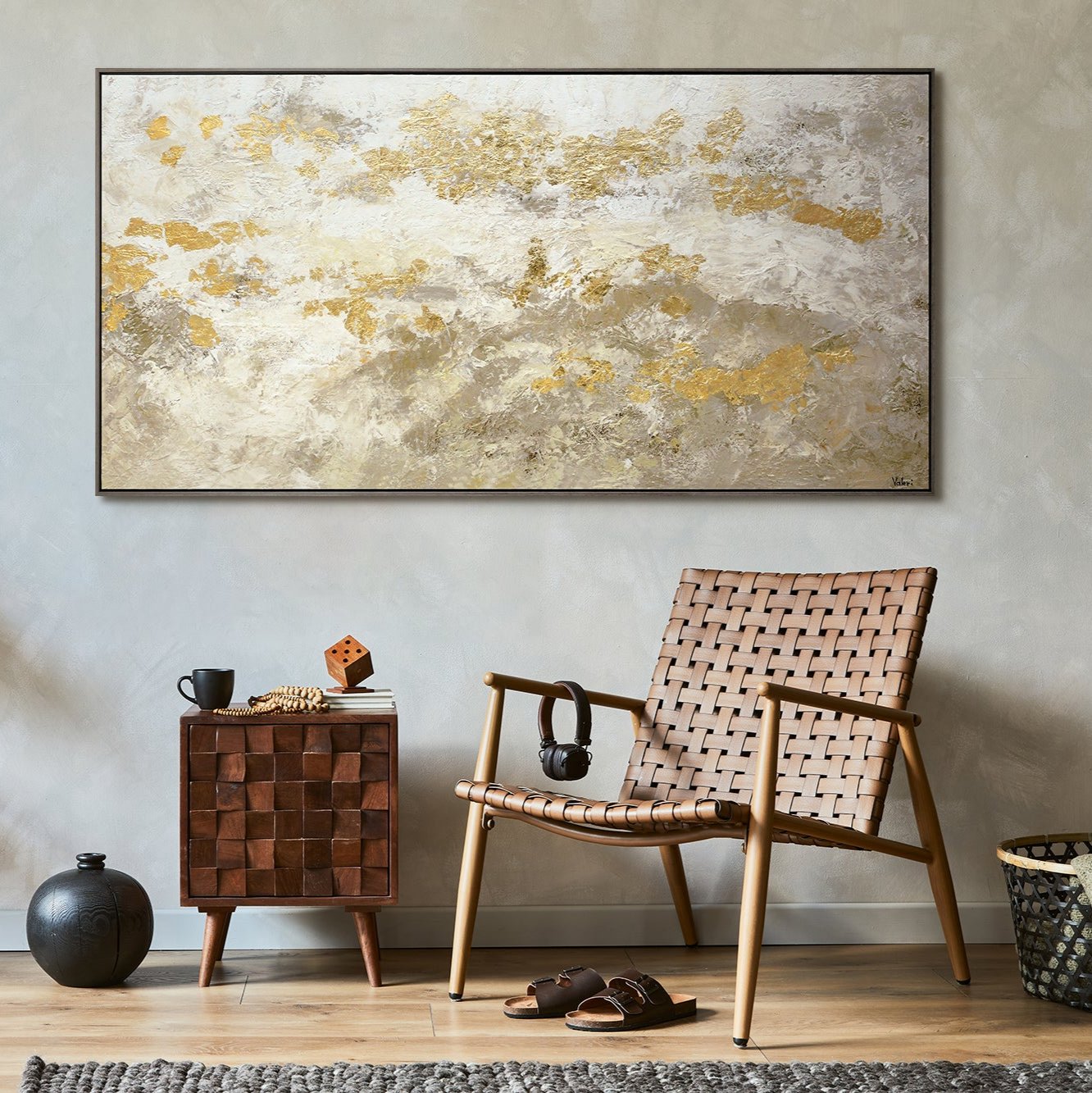 Dieses beeindruckende Gemälde ist ein Meisterwerk moderner abstrakter Kunst, das mit luxuriösen Goldakzenten veredelt wurde. Die geschickte Kombination von zarten Creme- und Goldtönen verleiht dem Bild eine elegante und zugleich zeitlose Ästhetik.