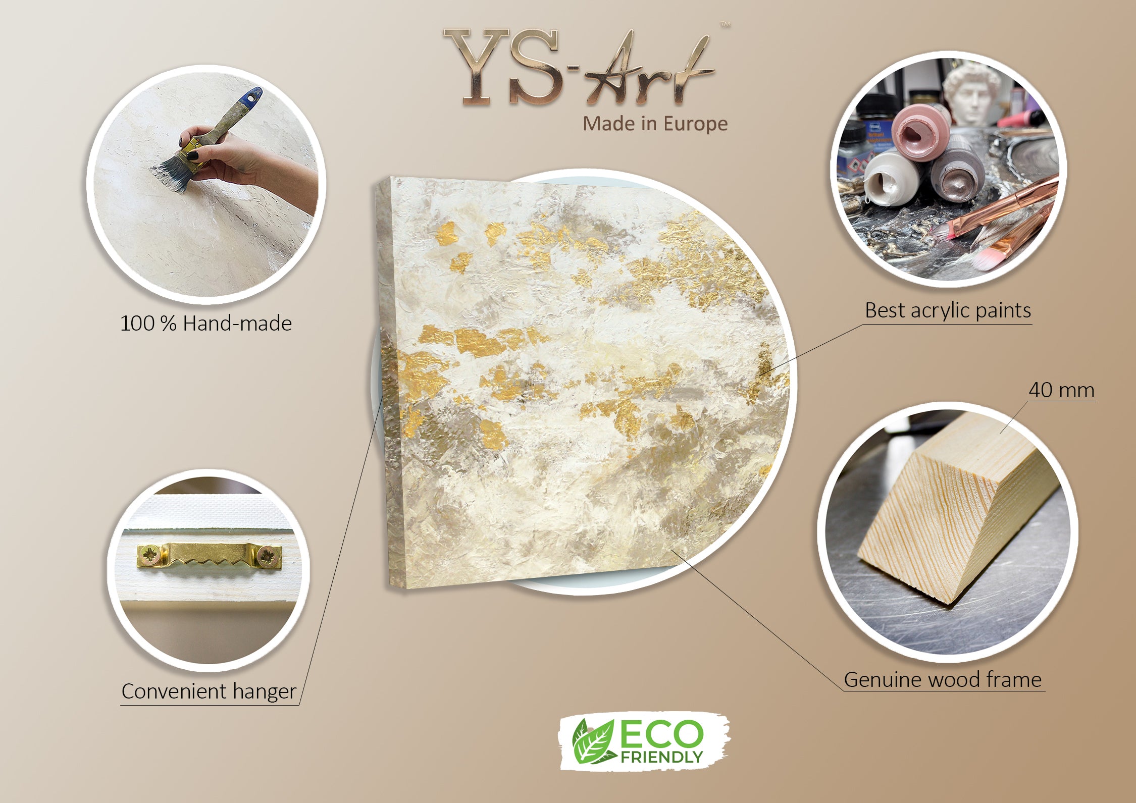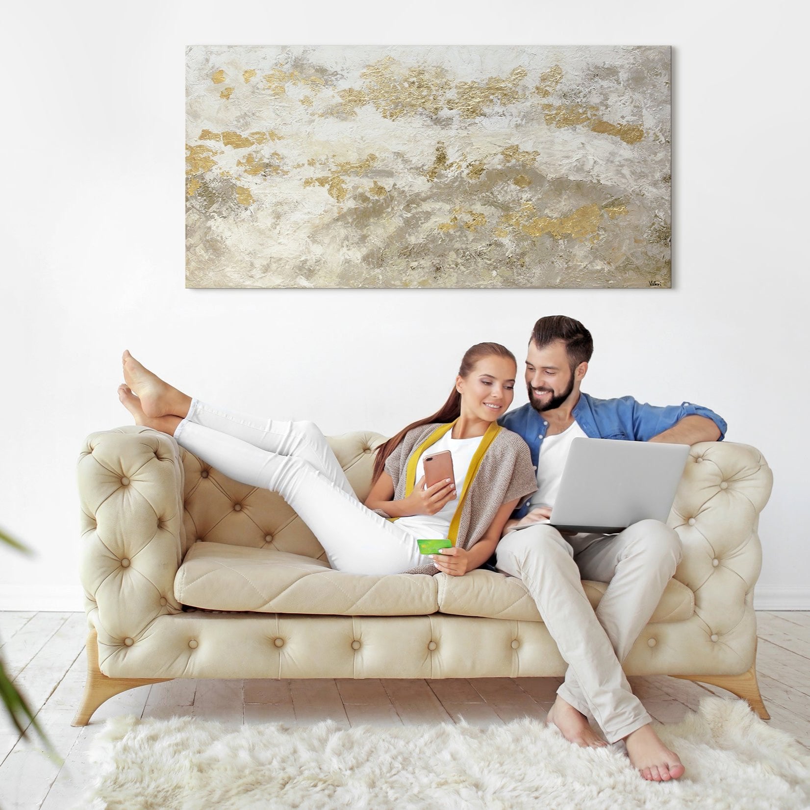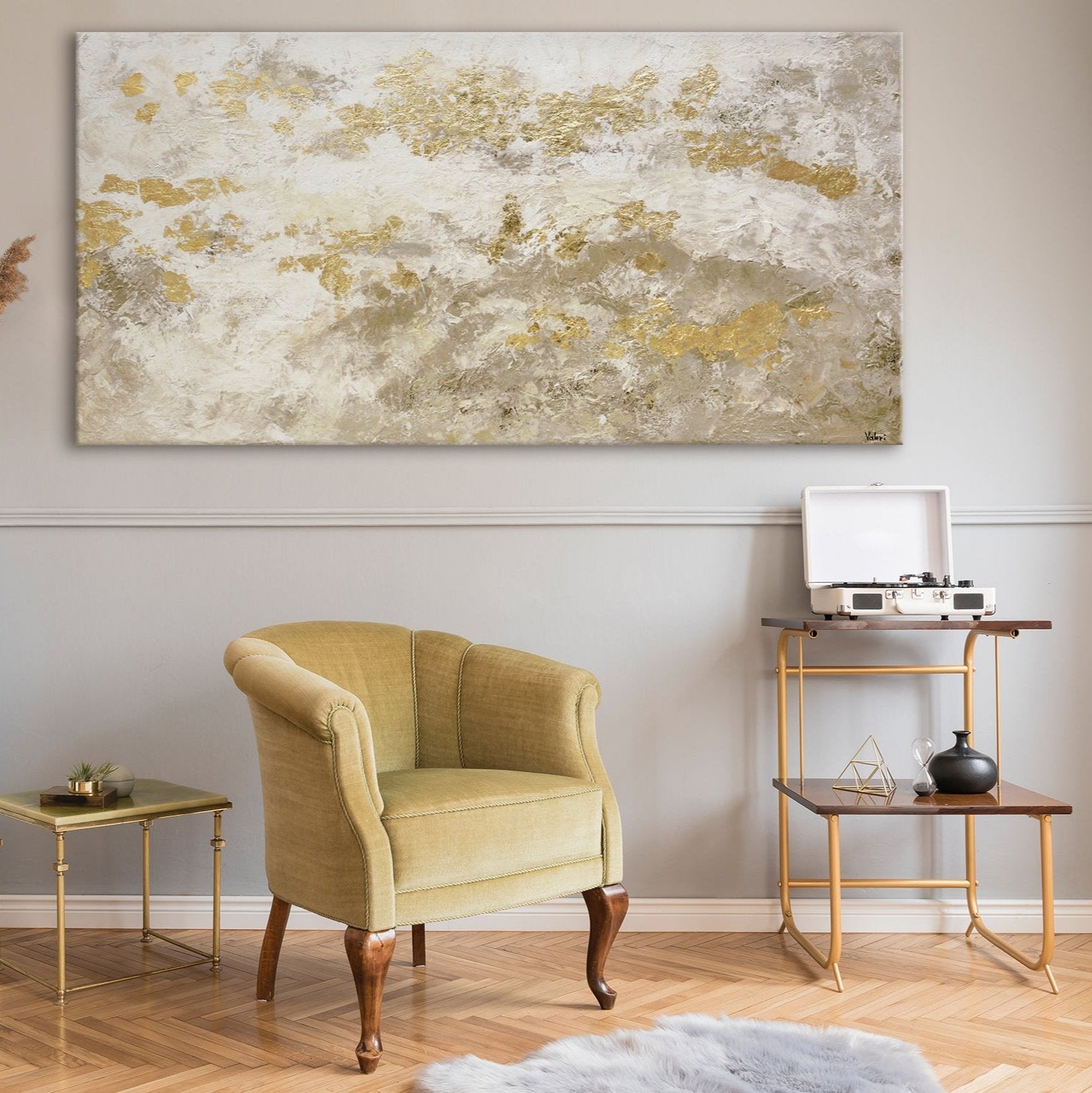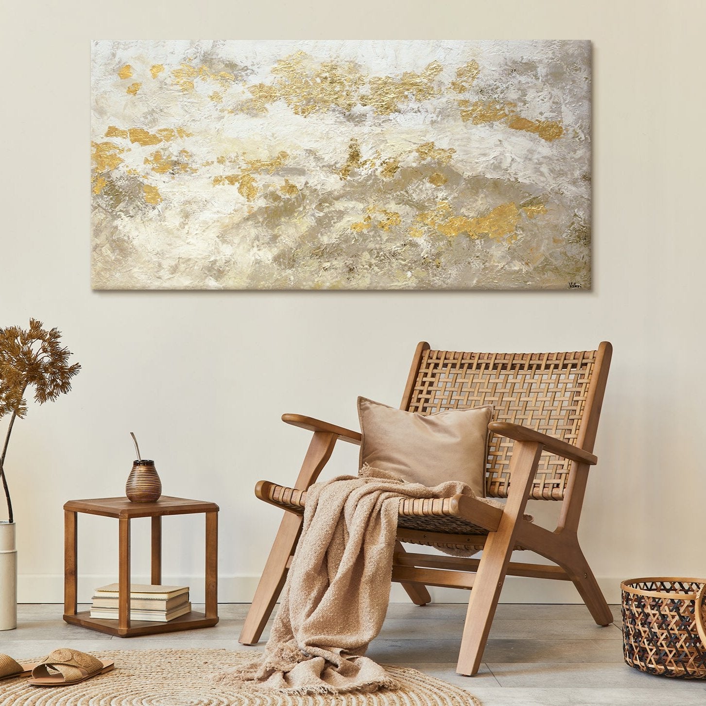 Dieses beeindruckende Gemälde ist ein Meisterwerk moderner abstrakter Kunst, das mit luxuriösen Goldakzenten veredelt wurde. Die geschickte Kombination von zarten Creme- und Goldtönen verleiht dem Bild eine elegante und zugleich zeitlose Ästhetik.