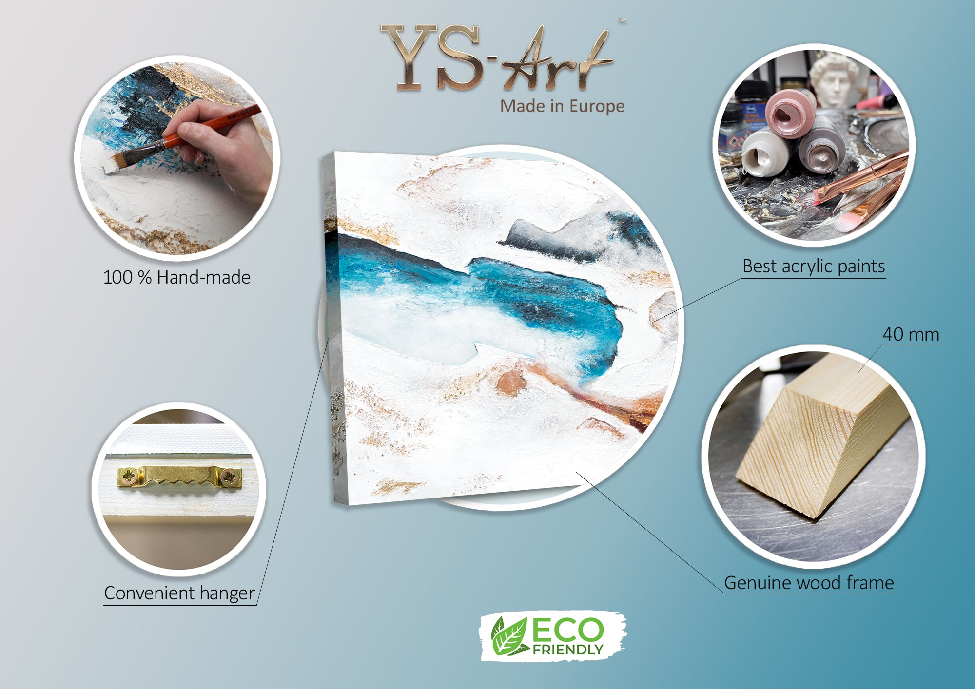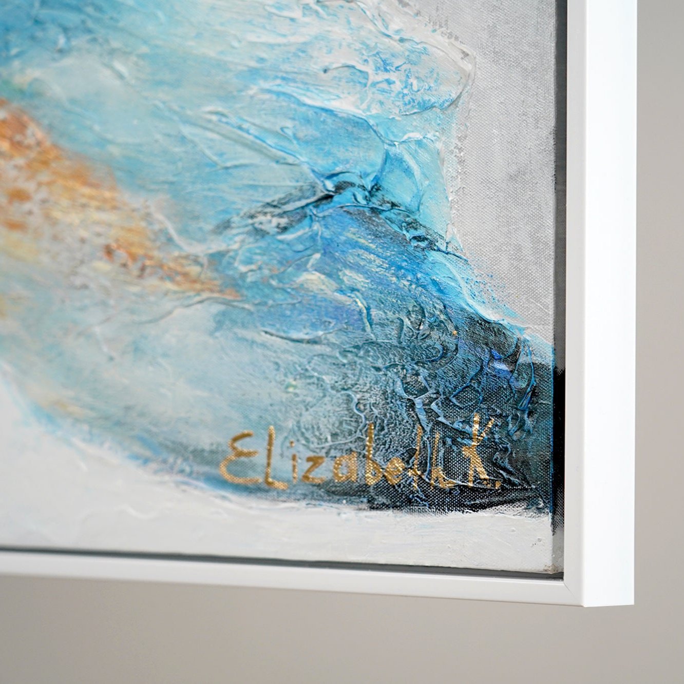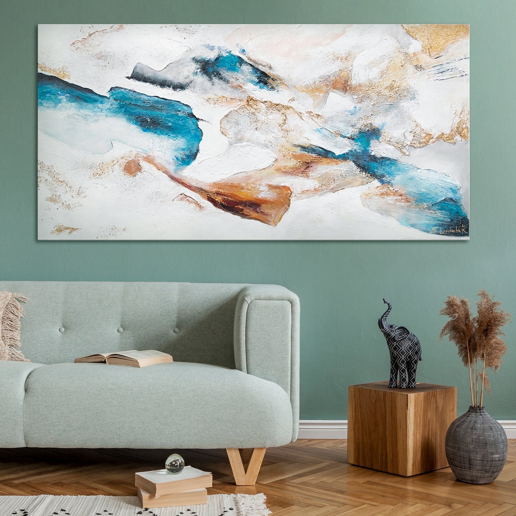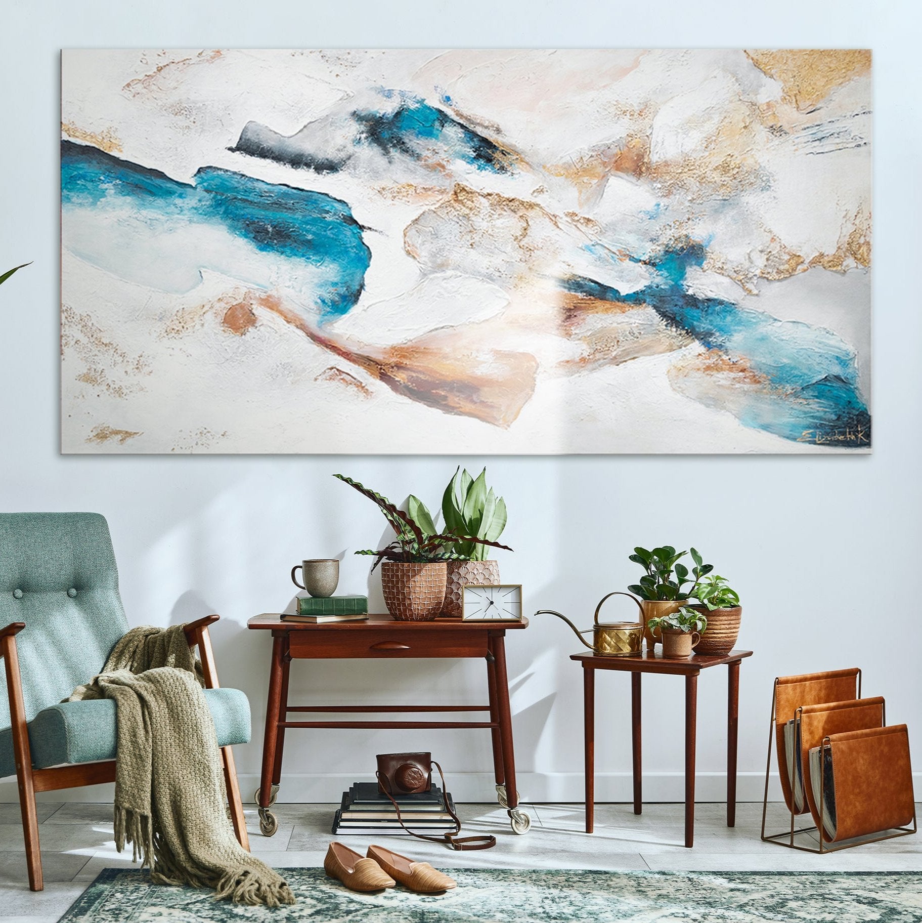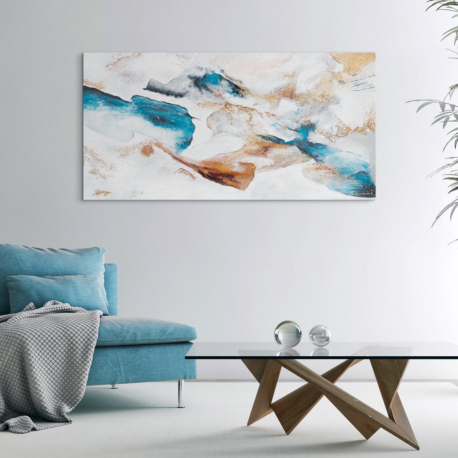 Tauchen Sie ein in die faszinierende Welt der abstrakten Kunst mit diesem modernen Acrylbild auf Leinwand. Die harmonische Mischung aus Blau-, Weiß- und Goldtönen schafft eine einzigartige, beruhigende Atmosphäre, die in jedem Raum für ein stilvolles Ambiente sorgt.