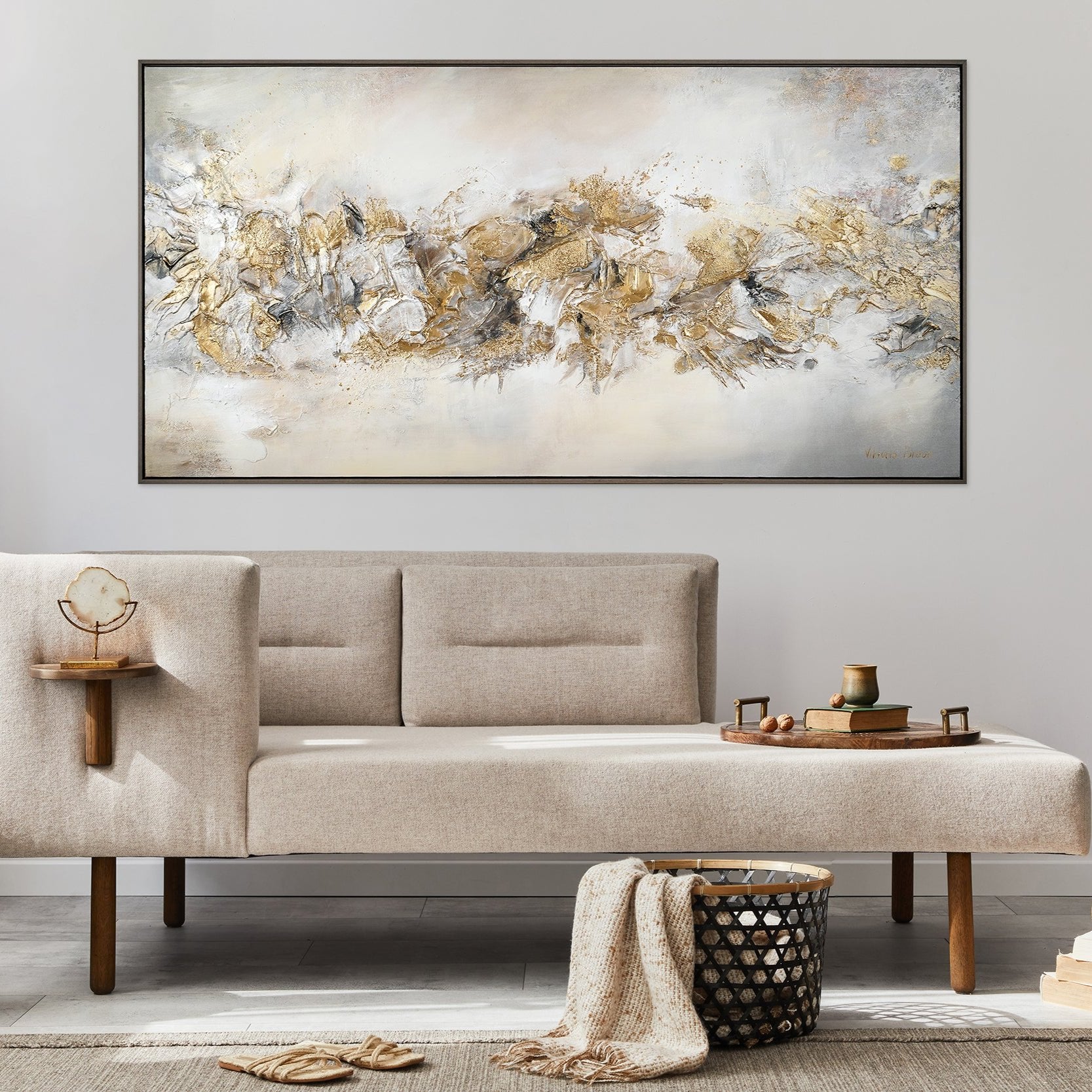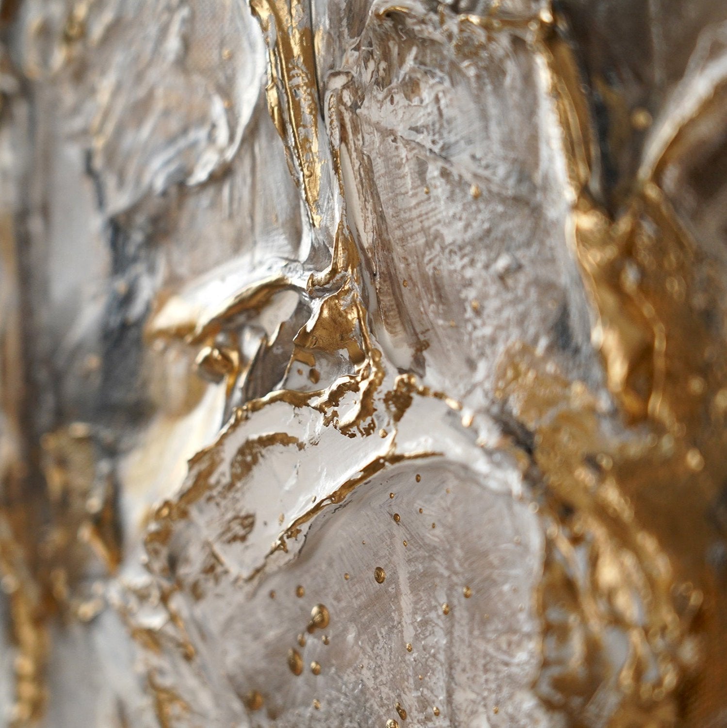 Erleben Sie die perfekte Kombination aus moderner Kunst und luxuriöser Ästhetik mit diesem handgemalten abstrakten Leinwandbild. Das Gemälde besticht durch seine dynamischen Texturen und glänzenden Goldakzente, die jedem Raum einen Hauch von Eleganz verleihen.