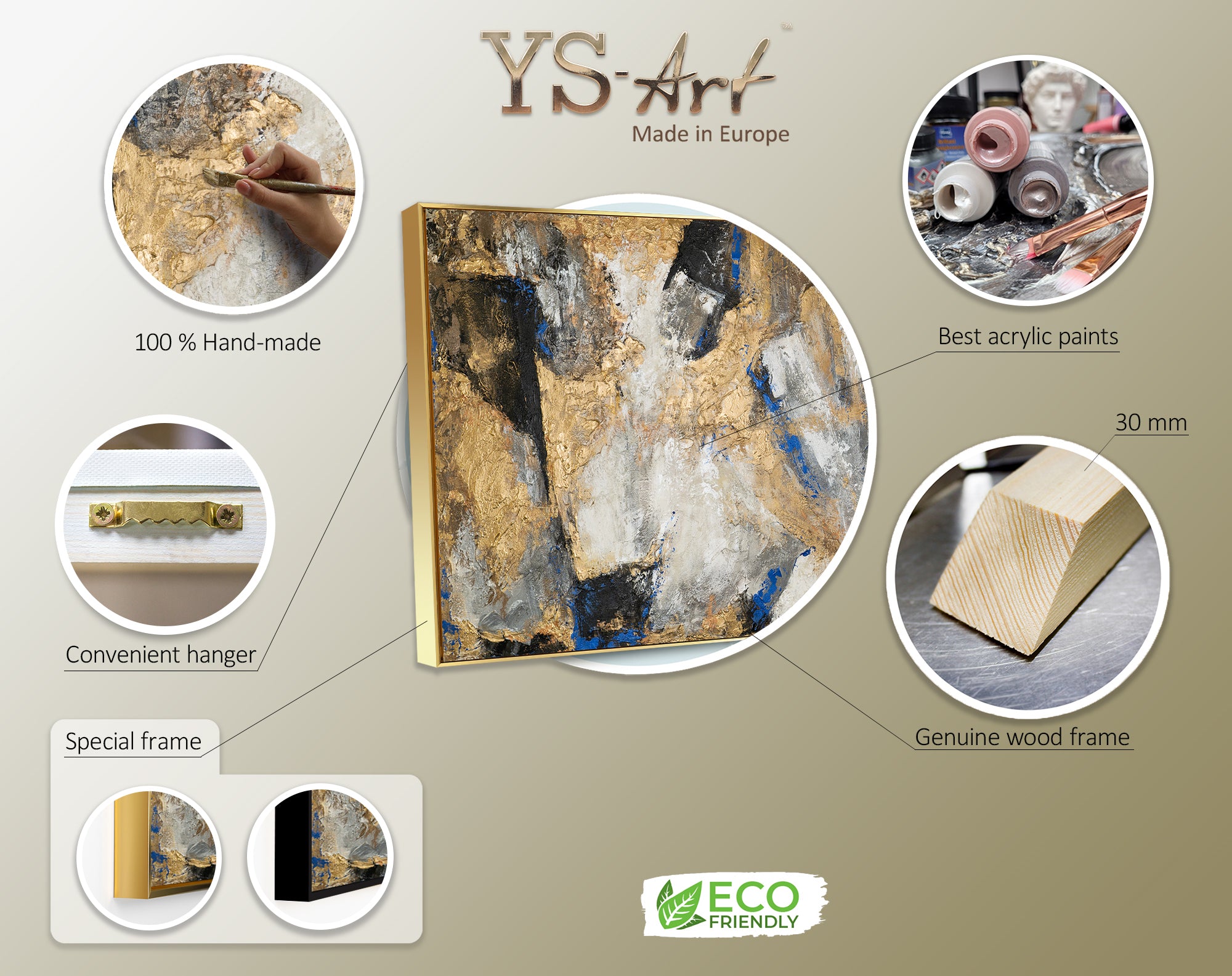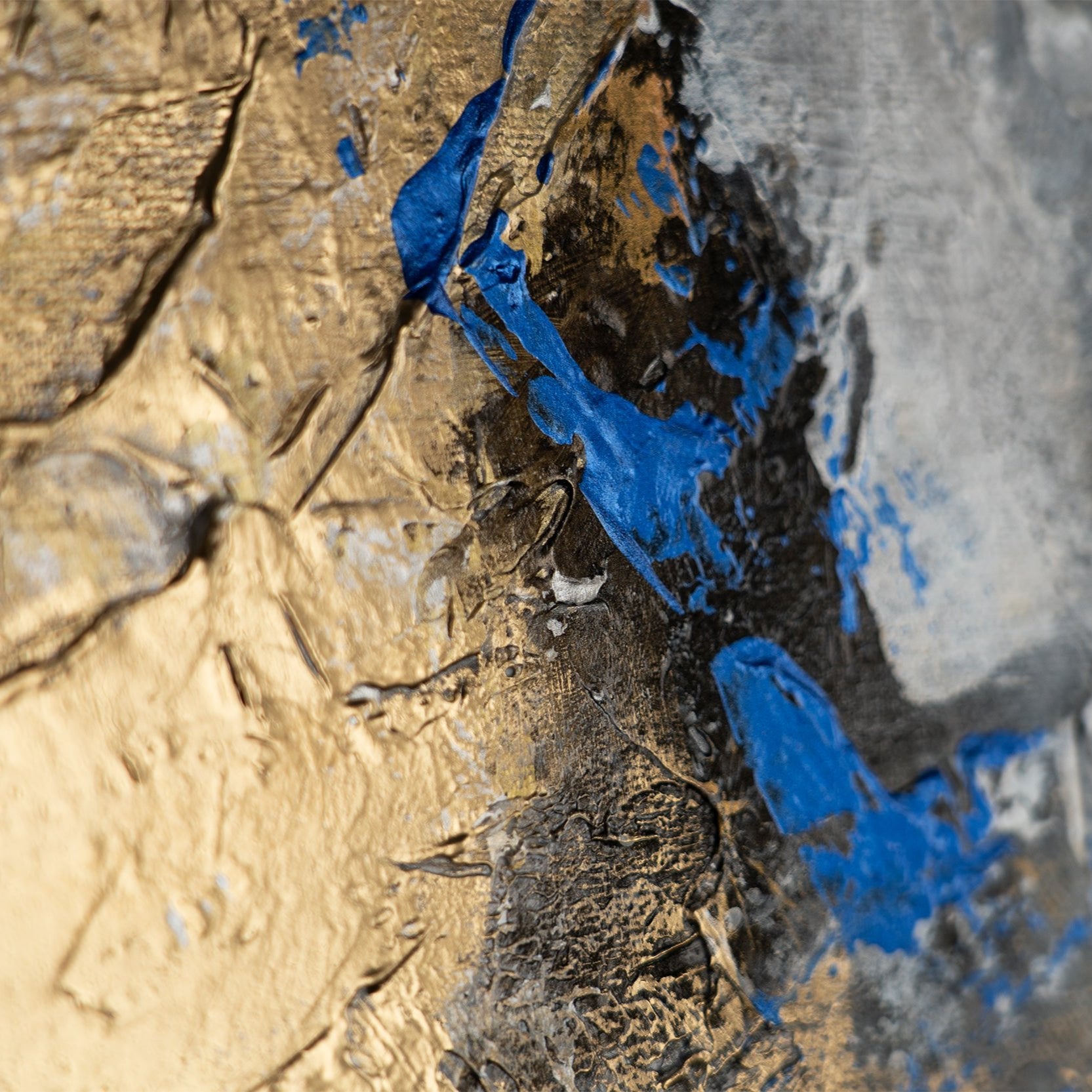 Dieses moderne abstrakte Gemälde fasziniert mit einer harmonischen Kombination von Goldakzenten und kontrastierenden Blautönen. Es wird auf hochwertiger Leinwand präsentiert und ist handgemalt, um jeder Wand eine elegante, zeitgenössische Atmosphäre zu verleihen.