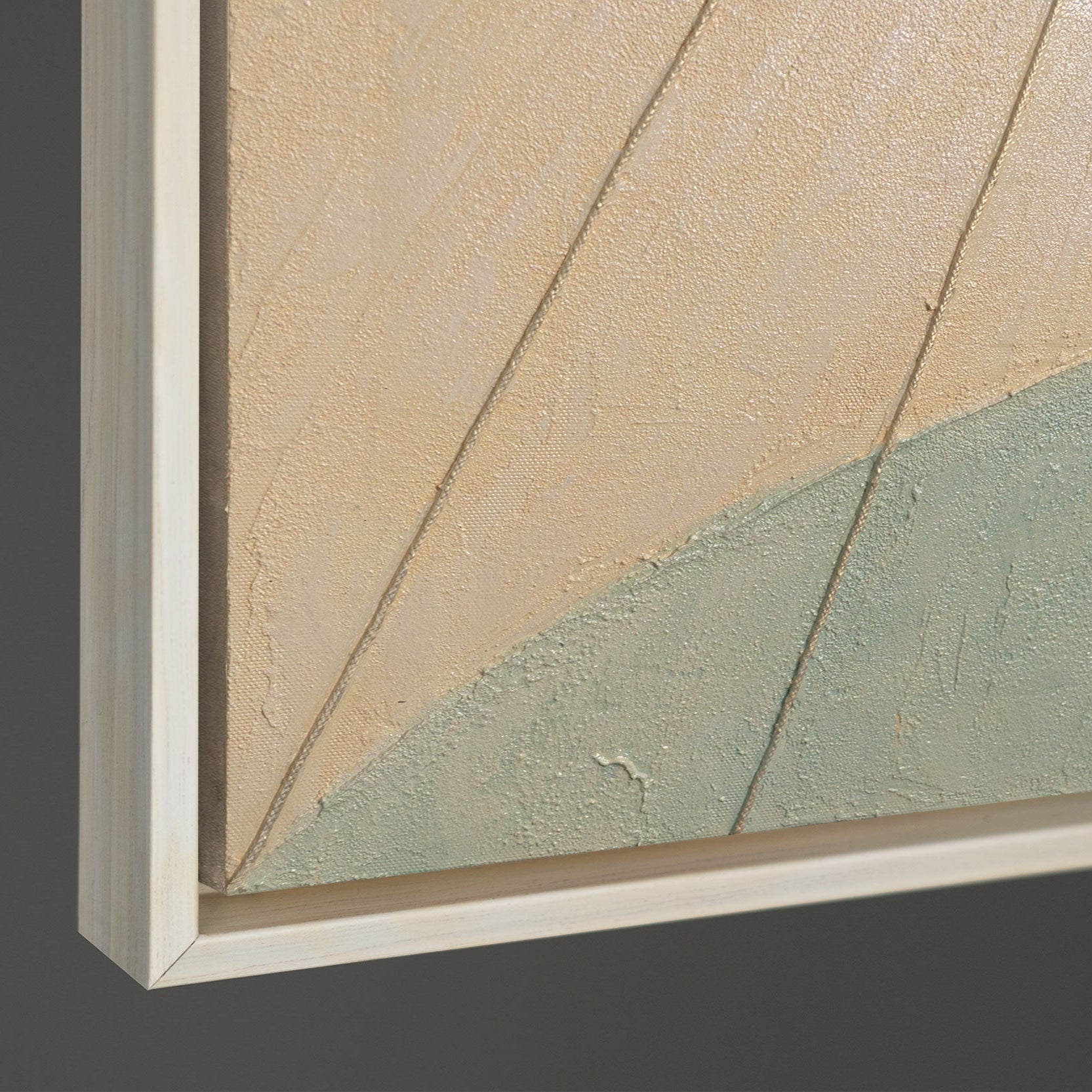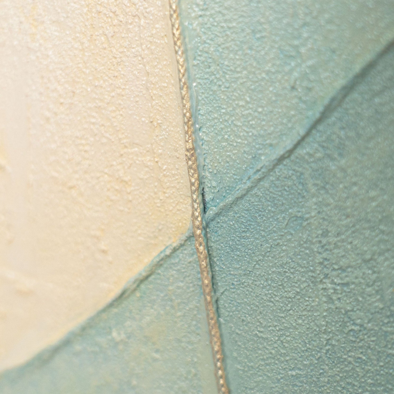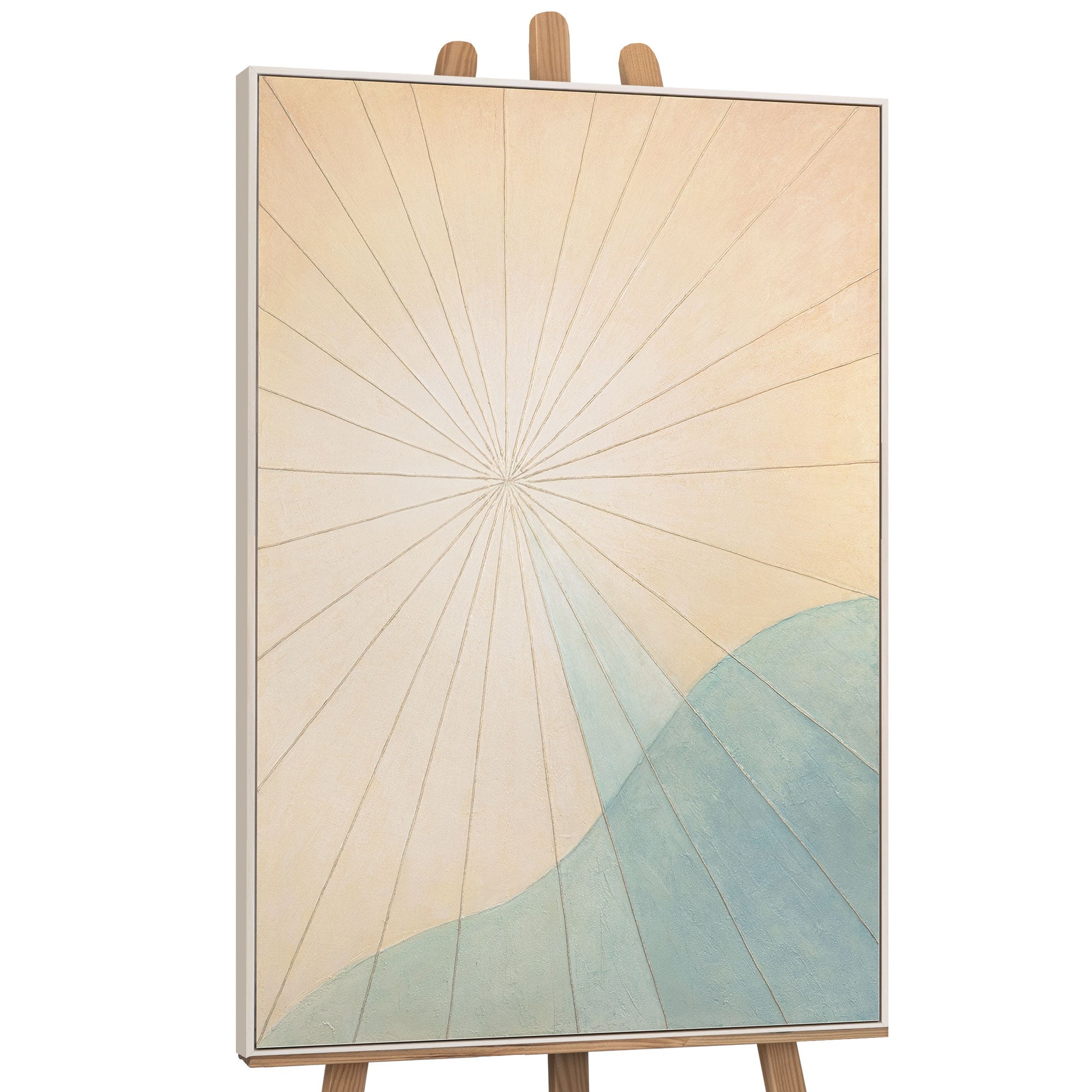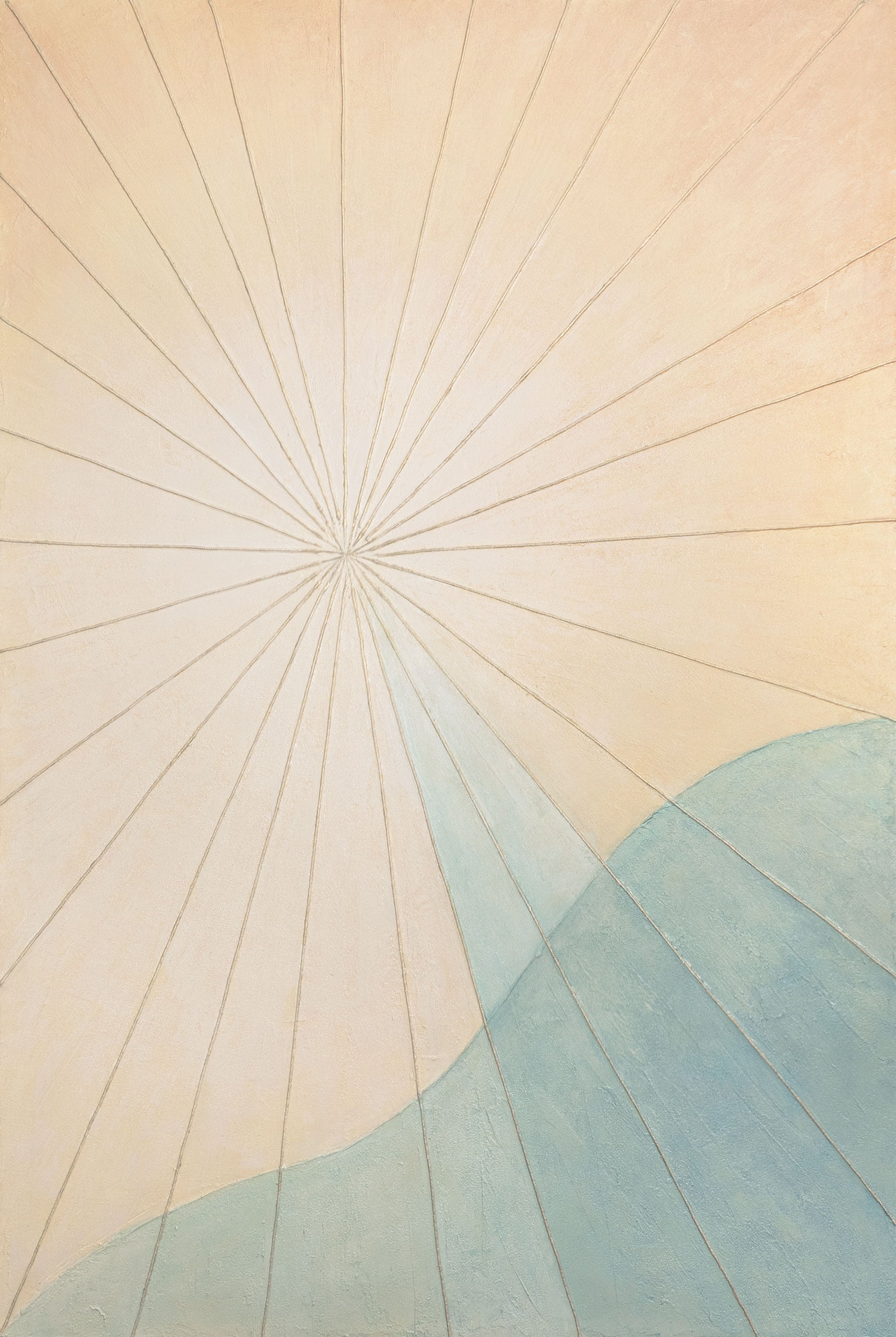 « Aube sur la mer » rayonne de douces teintes lumineuses – un jeu de crème, de bleu clair et de beige qui capture l'instant entre le jour et la nuit. La texture fine de la toile ajoute profondeur et mouvement, tandis que les lignes délicates créent un rythme méditatif.