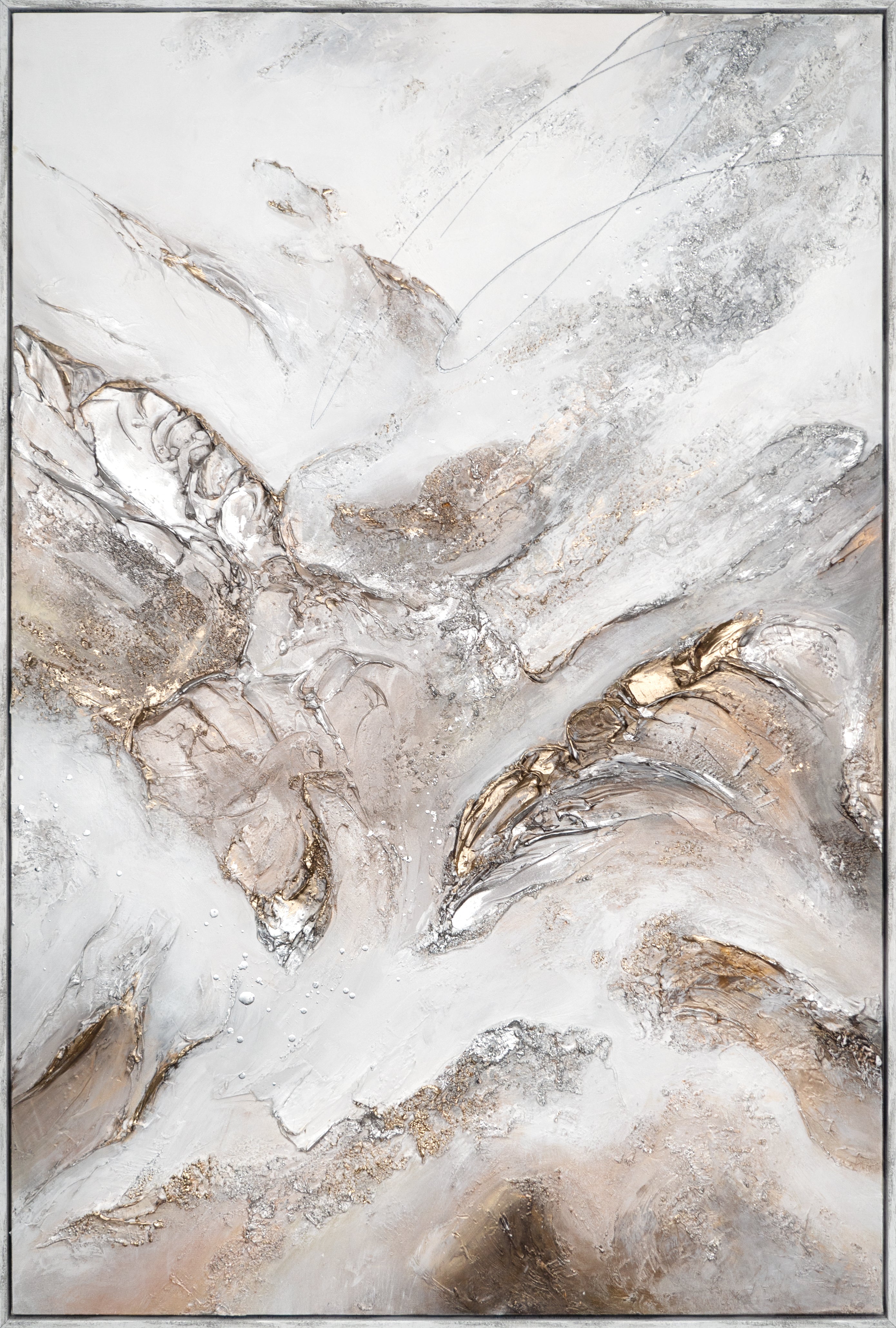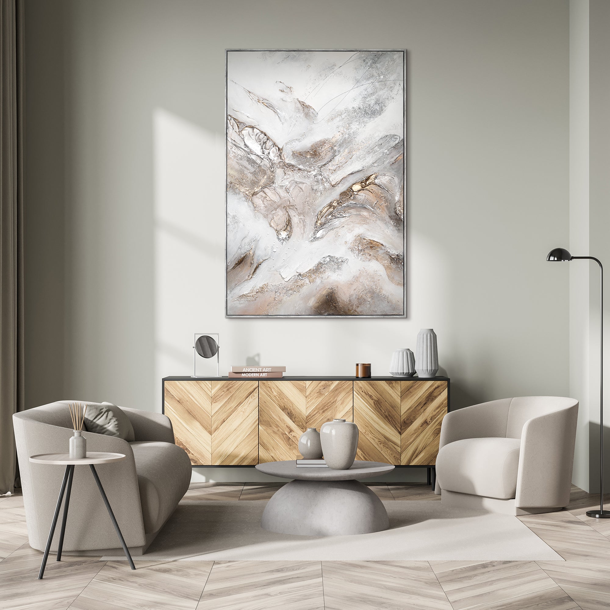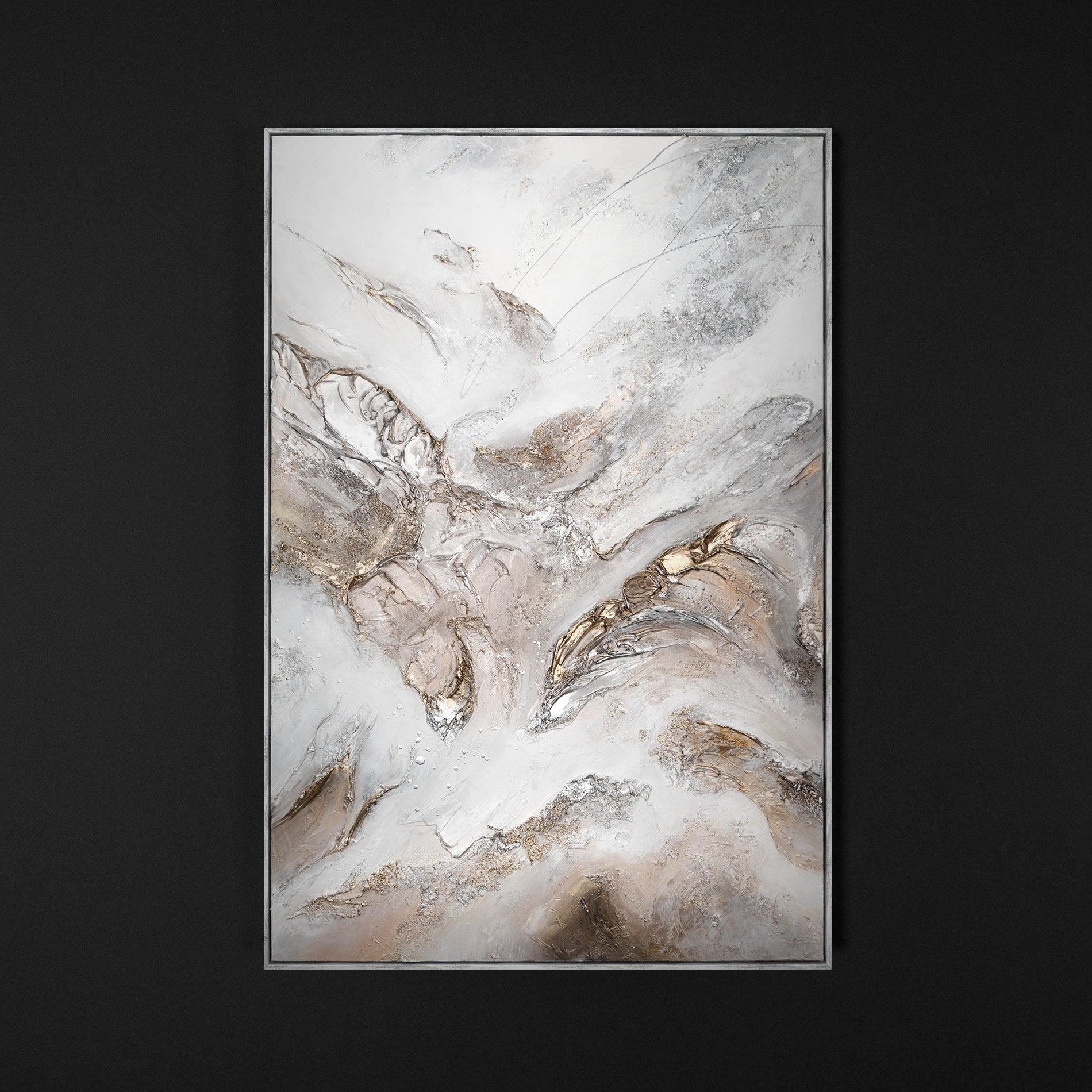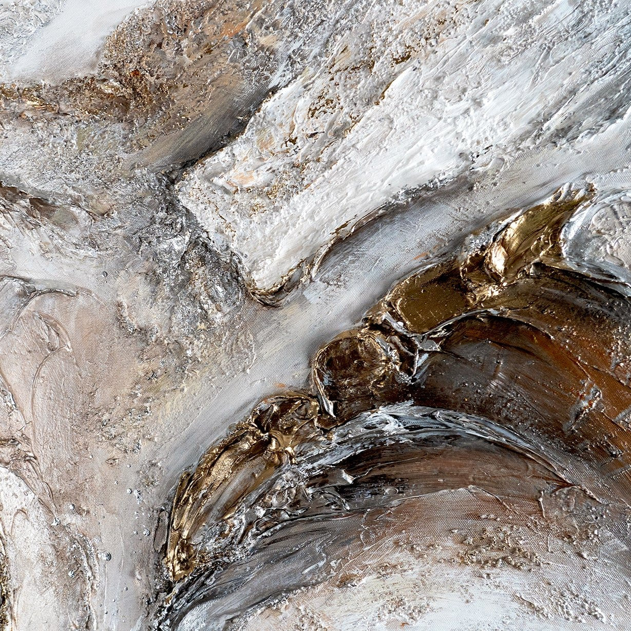 'Silberne Berührungen' ist ein herausragendes Beispiel für moderne abstrakte Kunst, das natürliche Formen und erdige Töne mit lebendigen Silber- und Goldakzenten kombiniert.