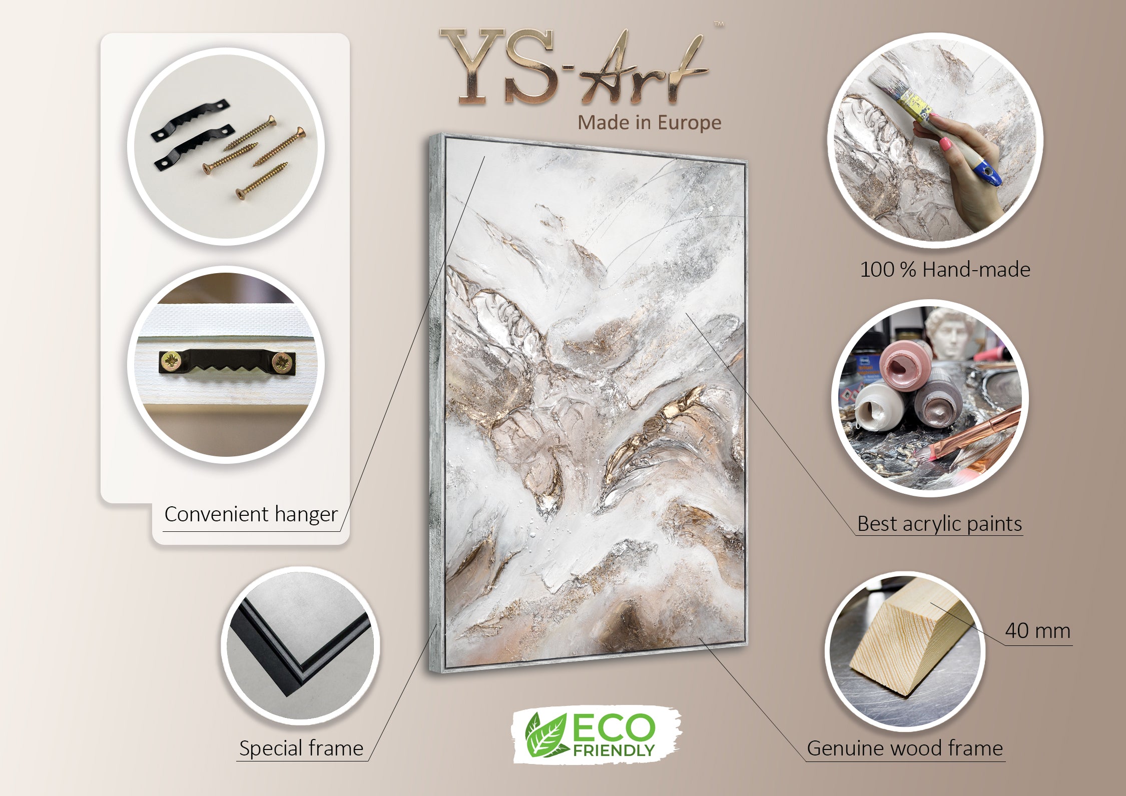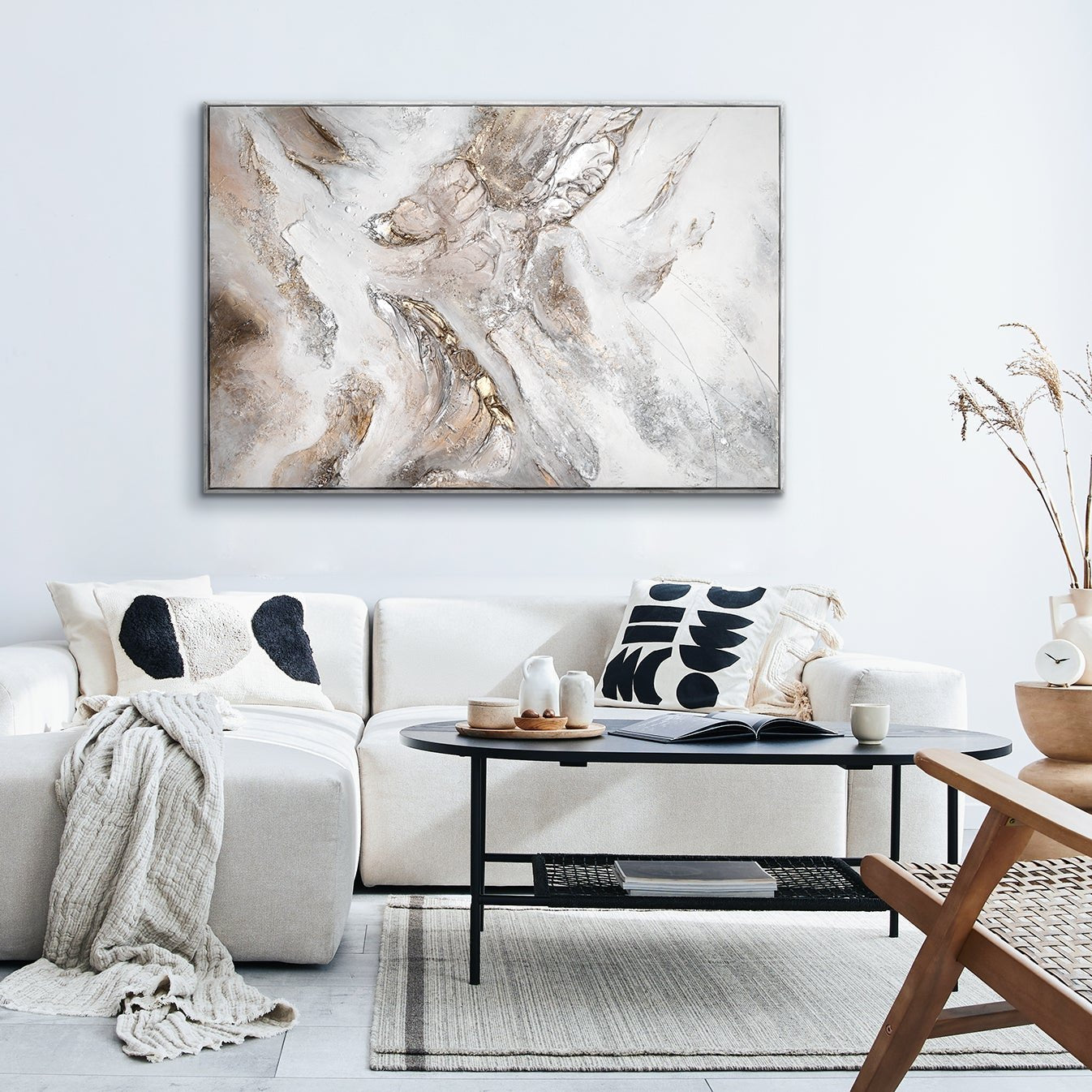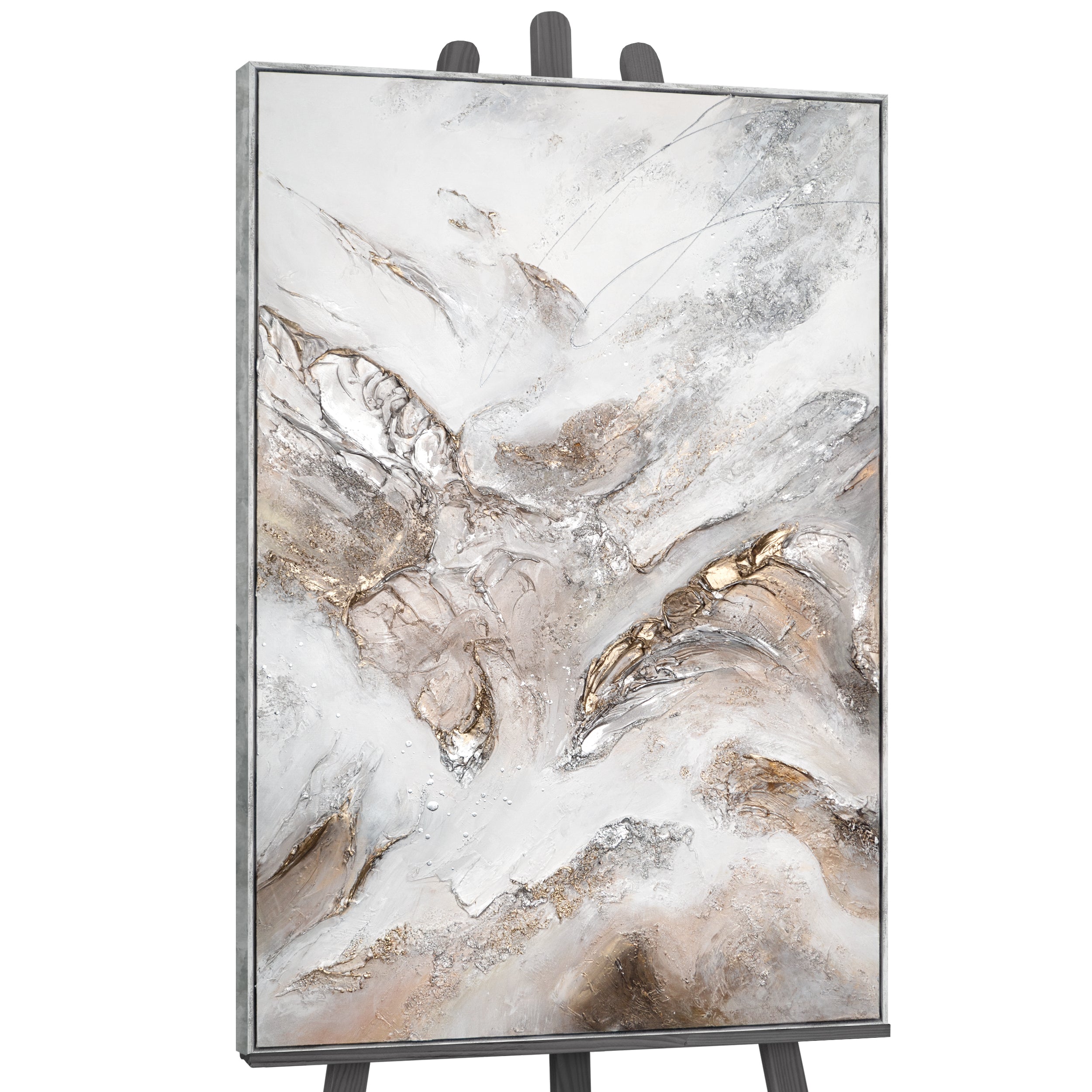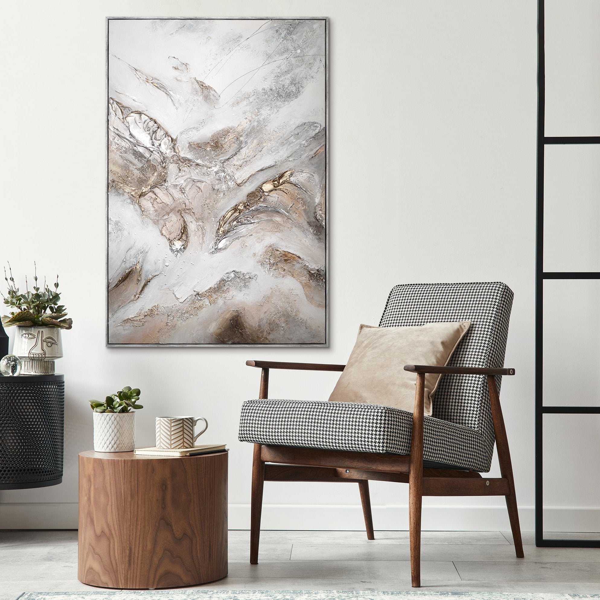 'Silberne Berührungen' ist ein herausragendes Beispiel für moderne abstrakte Kunst, das natürliche Formen und erdige Töne mit lebendigen Silber- und Goldakzenten kombiniert.