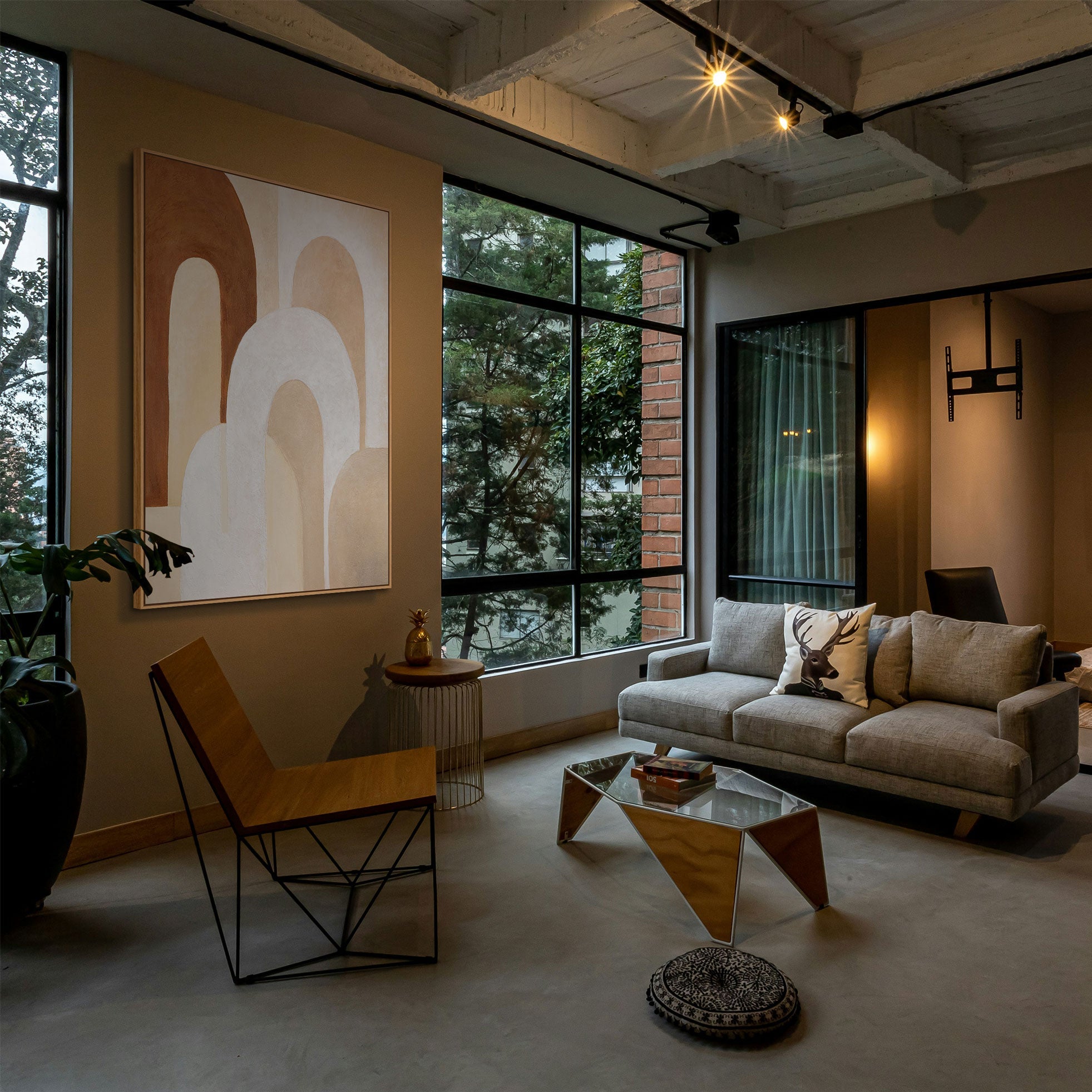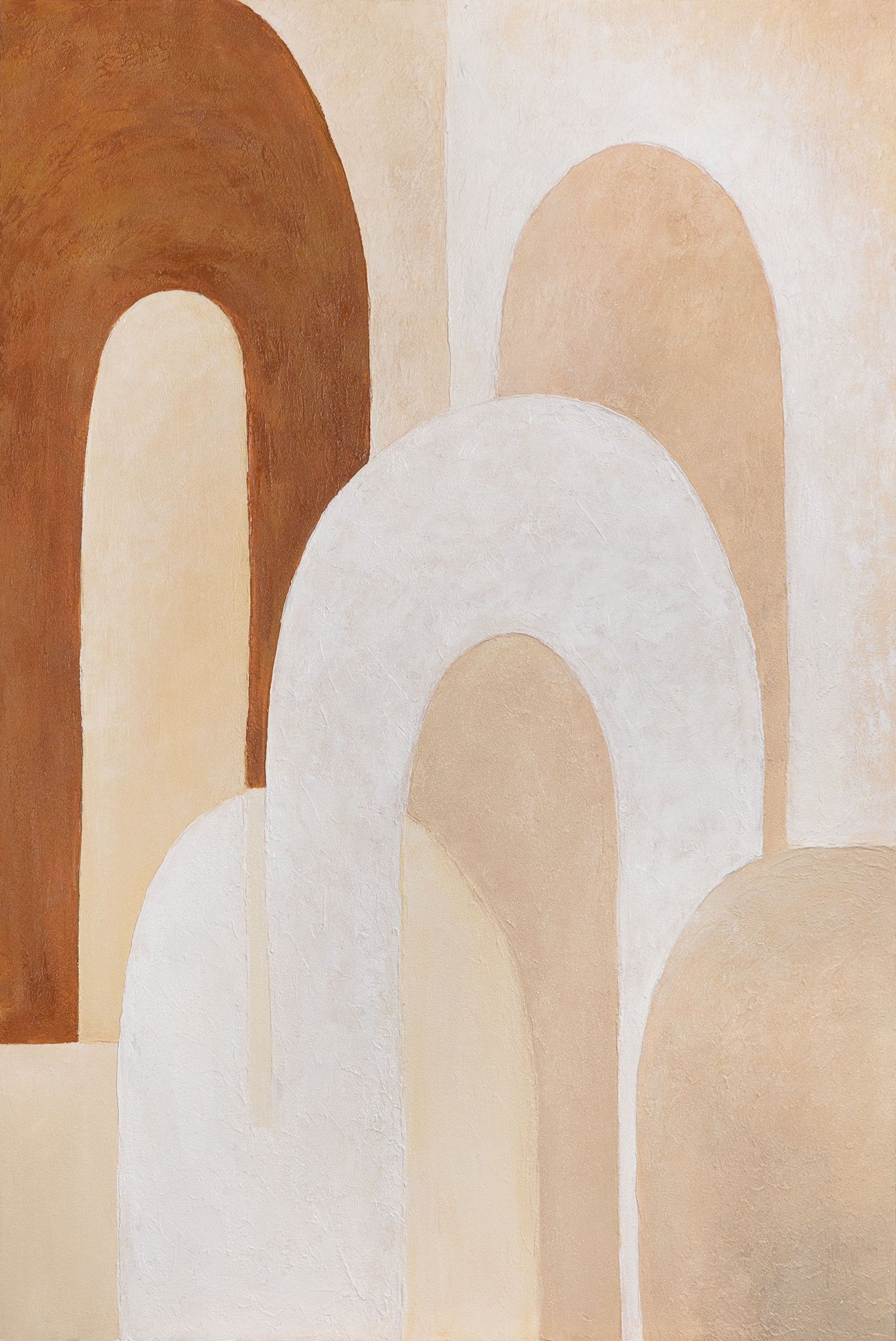 « Souffle de l'Architecture » allie rigueur géométrique et douce harmonie. Des arches organiques aux tons beiges chauds se fondent dans des nuances brunes terreuses, créant un équilibre architectural serein. La surface texturée donne vie à la lumière et aux ombres, comme un hommage aux formes et matériaux méditerranéens.