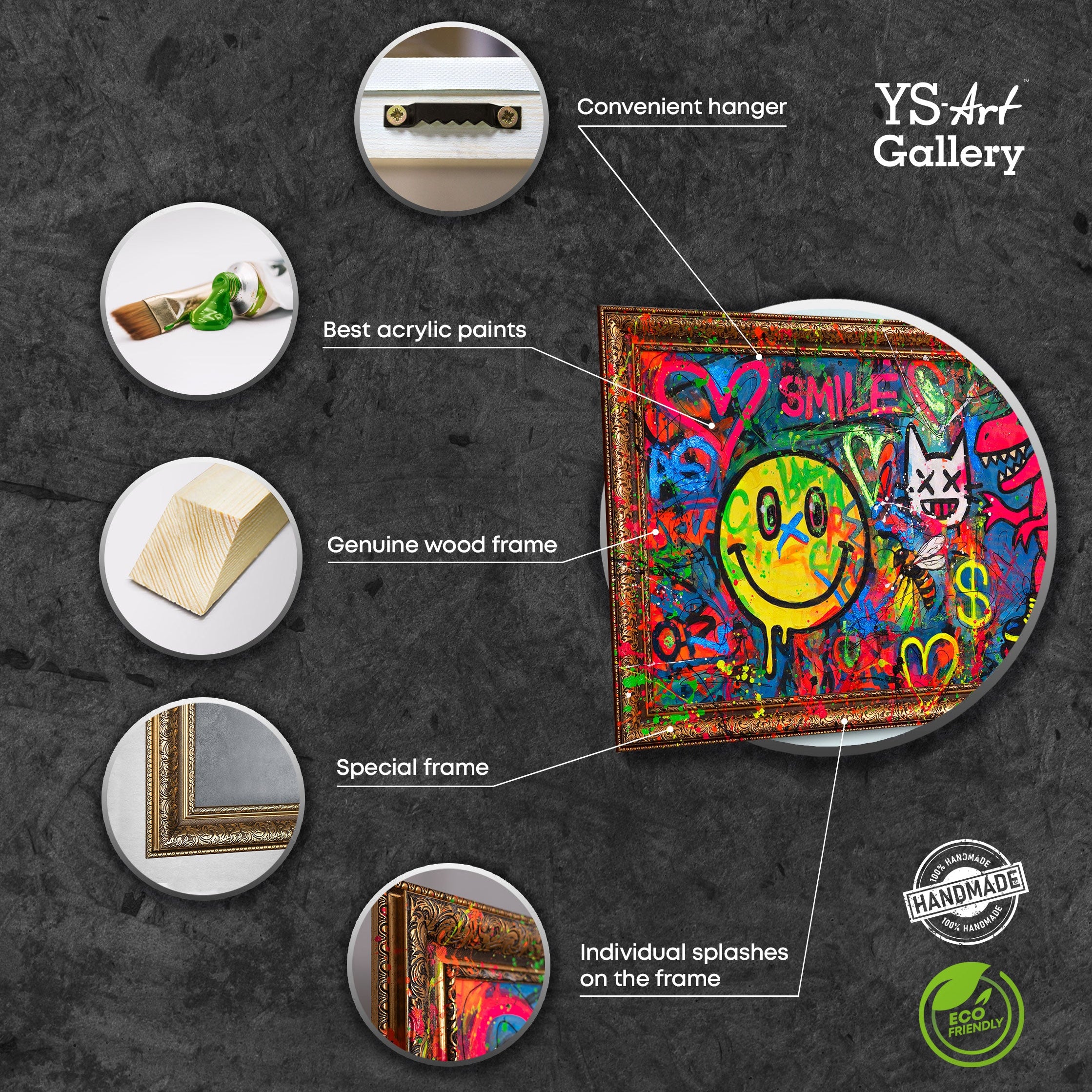 Perfekt für alle, die moderne wanddeko wohnzimmer, auffällige street art leinwandbilder oder graffiti kunst suchen. Dieses Werk ist 100 % handgemalt, mit goldverziertem Rahmen und einem einzigartigen Charakter – ein echtes Unikat, das Ihr Zuhause in eine Galerie verwandelt.