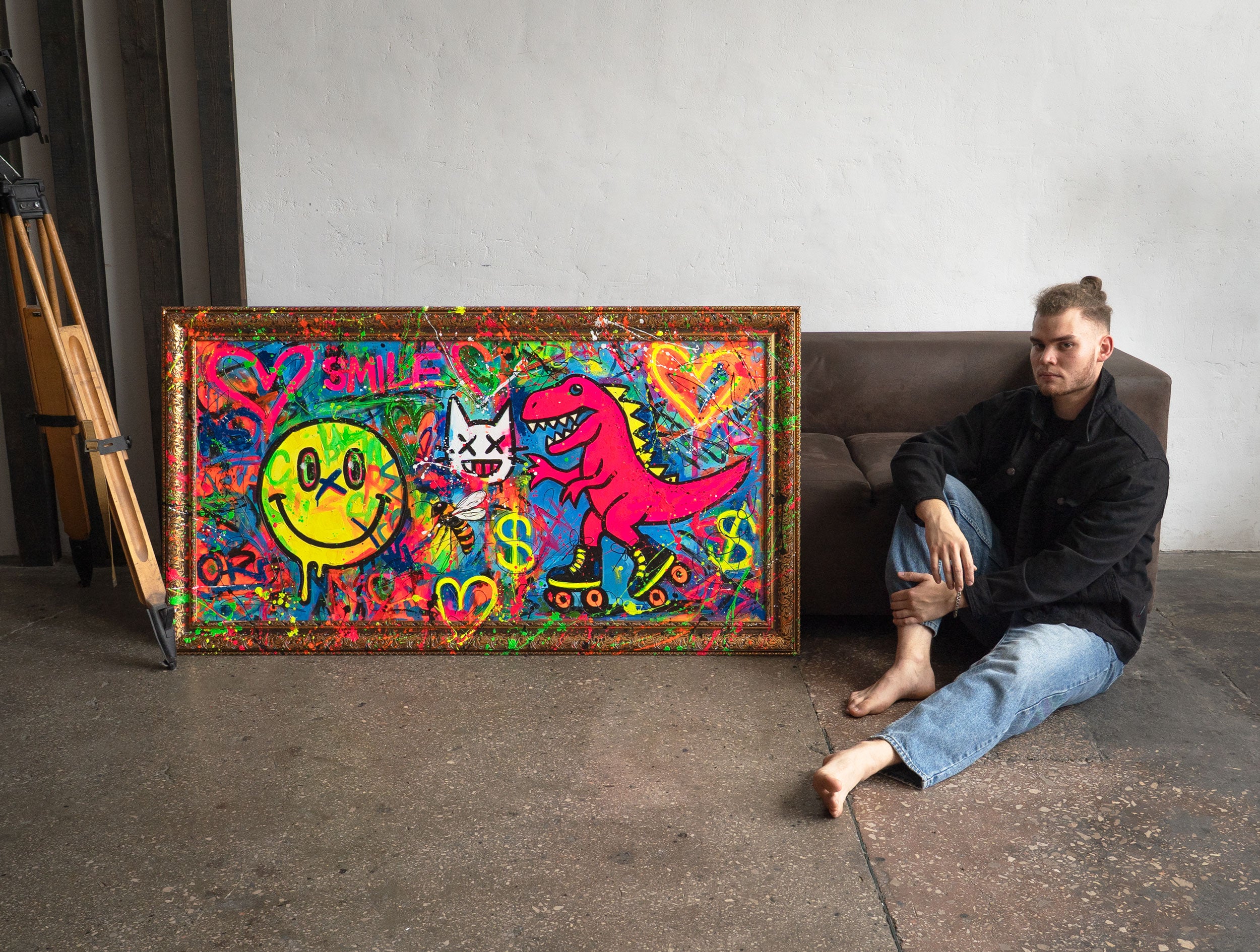 Dieses Graffiti-Pop-Art Kunstwerk „Spaß“ bringt pures Lebensgefühl an die Wand! Ein pinker Dino auf Rollschuhen, Smiley, Katze und bunte Herzen – in kräftigen Neonfarben, gesprüht, gemalt und gesplattert. Jedes Detail schreit nach Freiheit, Freude und urbanem Lifestyle.