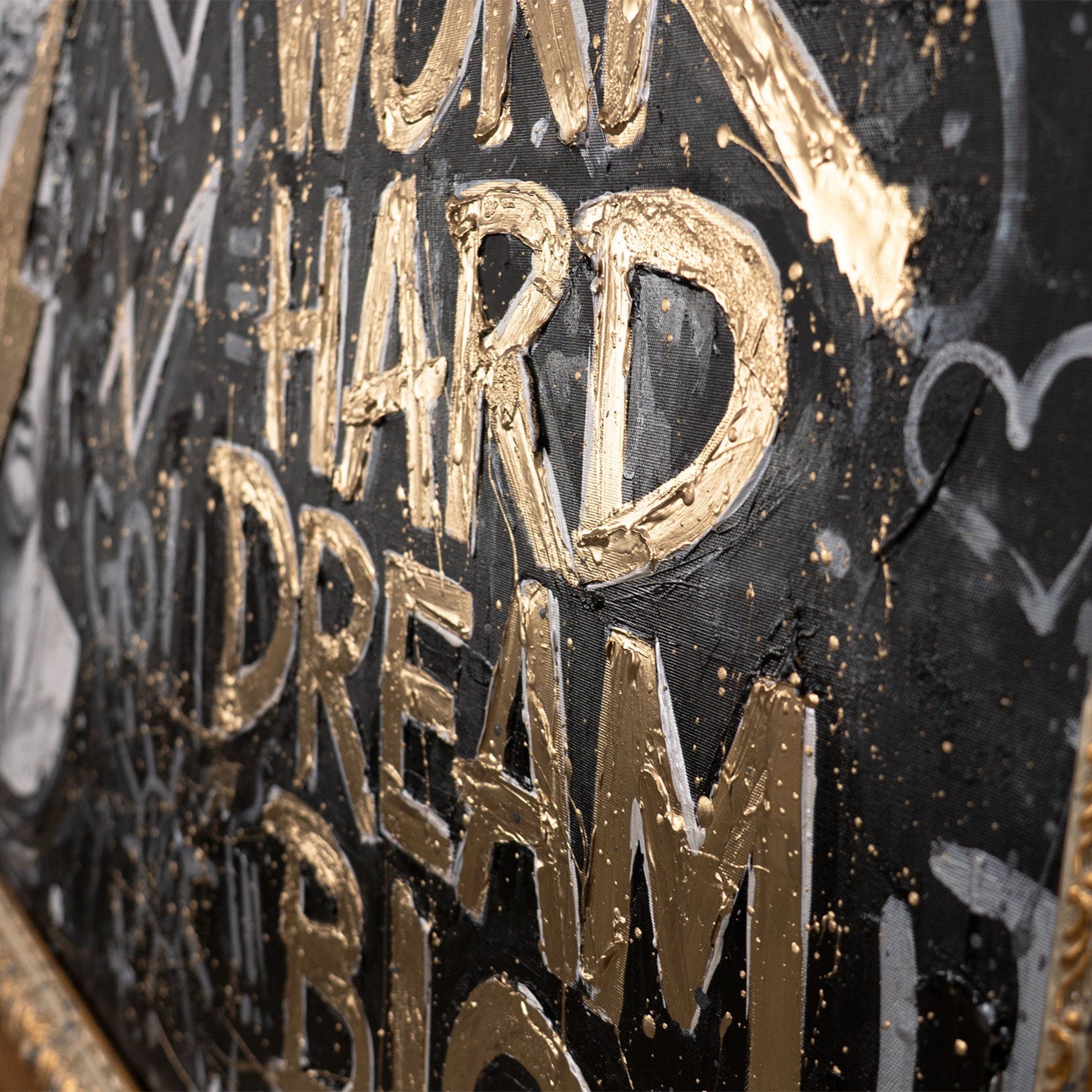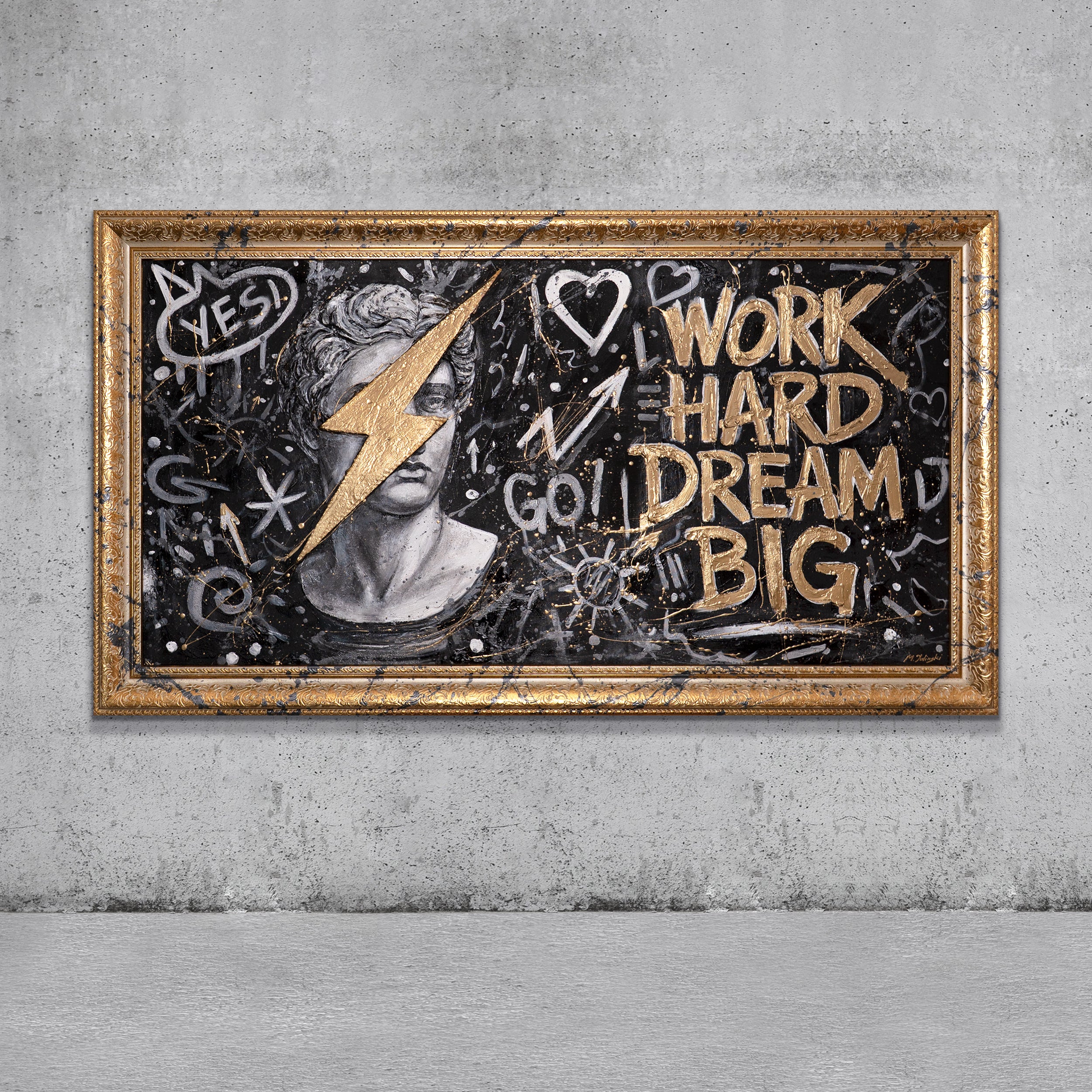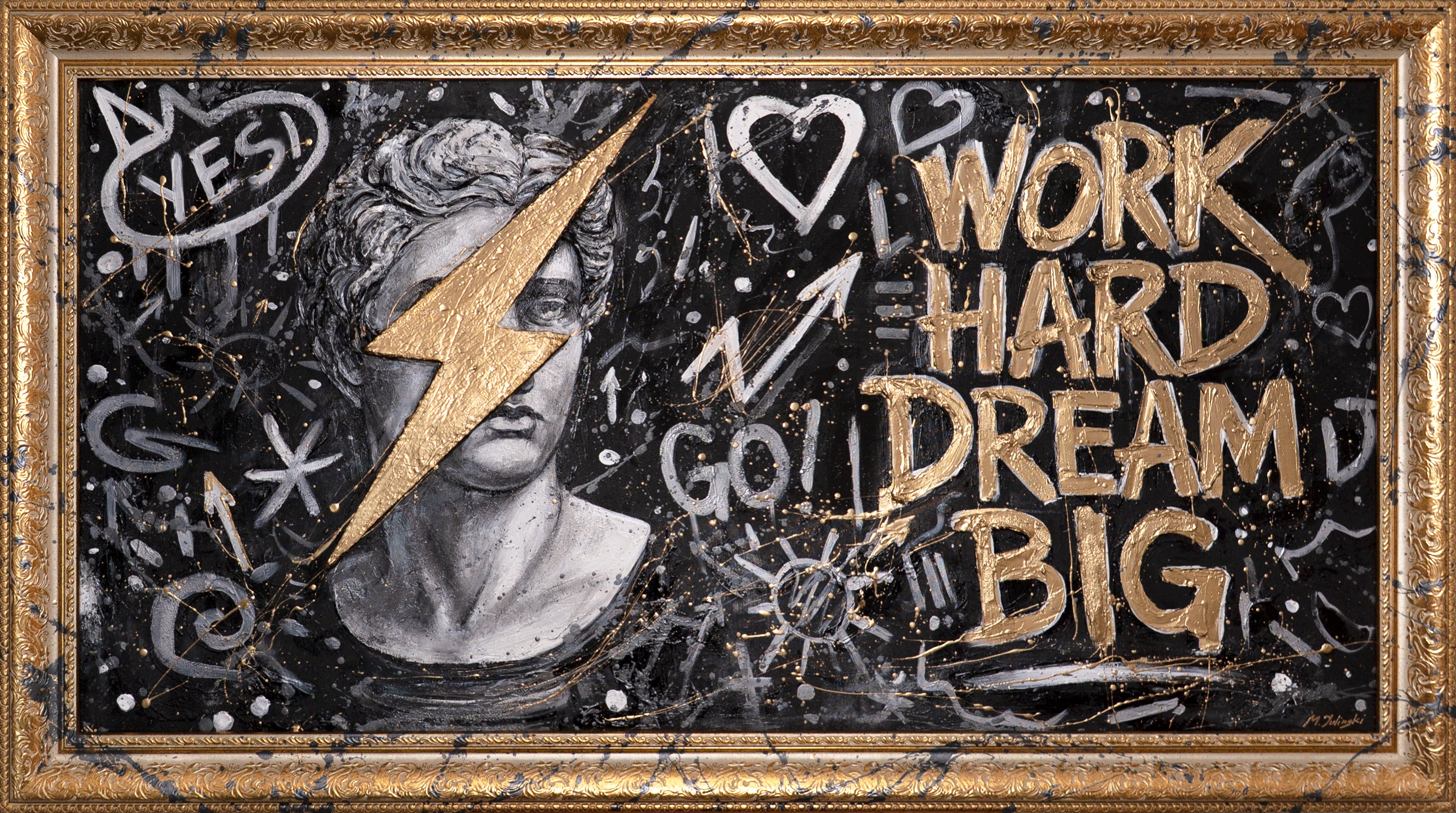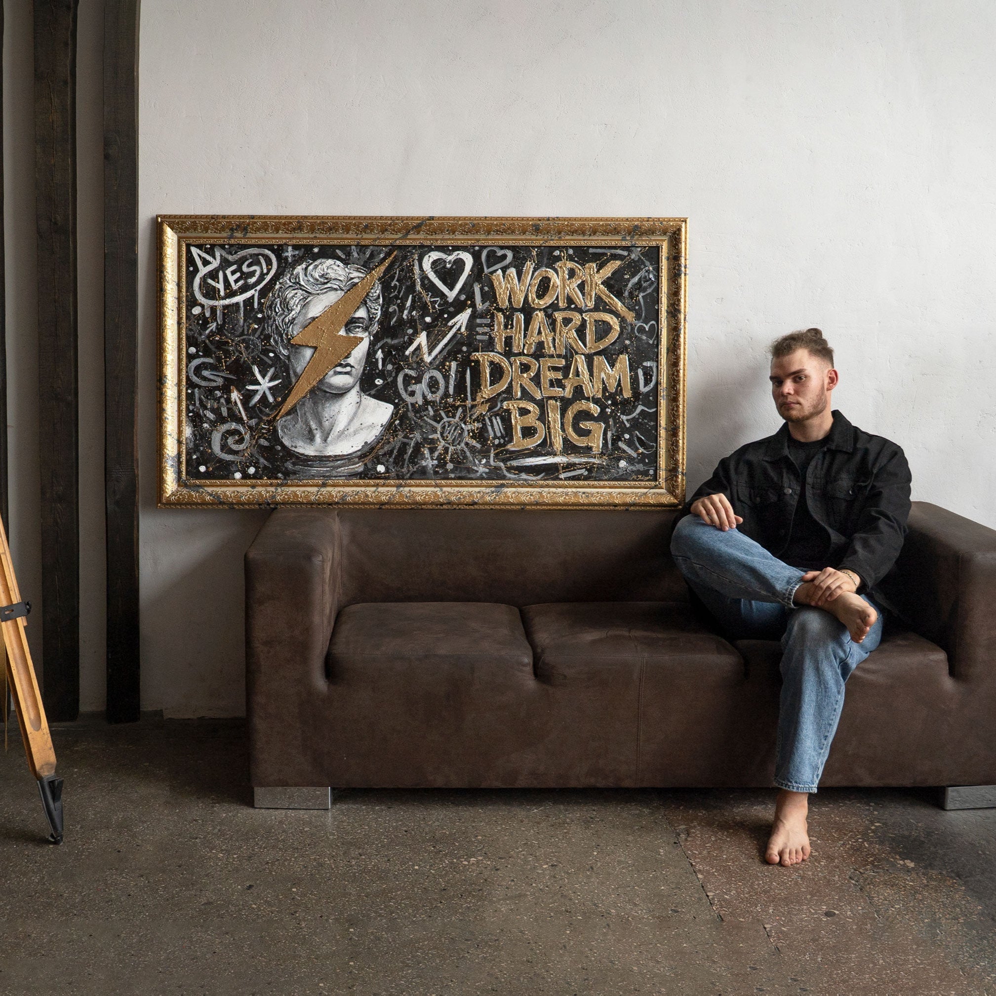 Dieses handgemalte Leinwandbild „Kunst der Motivation“ verbindet urbane Street-Art mit inspirierender Botschaft: Work Hard, Dream Big. Der goldene Blitz durch die antike Büste wird von ausdrucksstarken Symbolen wie Herzen, Pfeilen und Sternen begleitet. Jeder Pinselstrich ist ein Unikat – eine Fusion aus klassischer Skulptur und moderner Motivkunst.