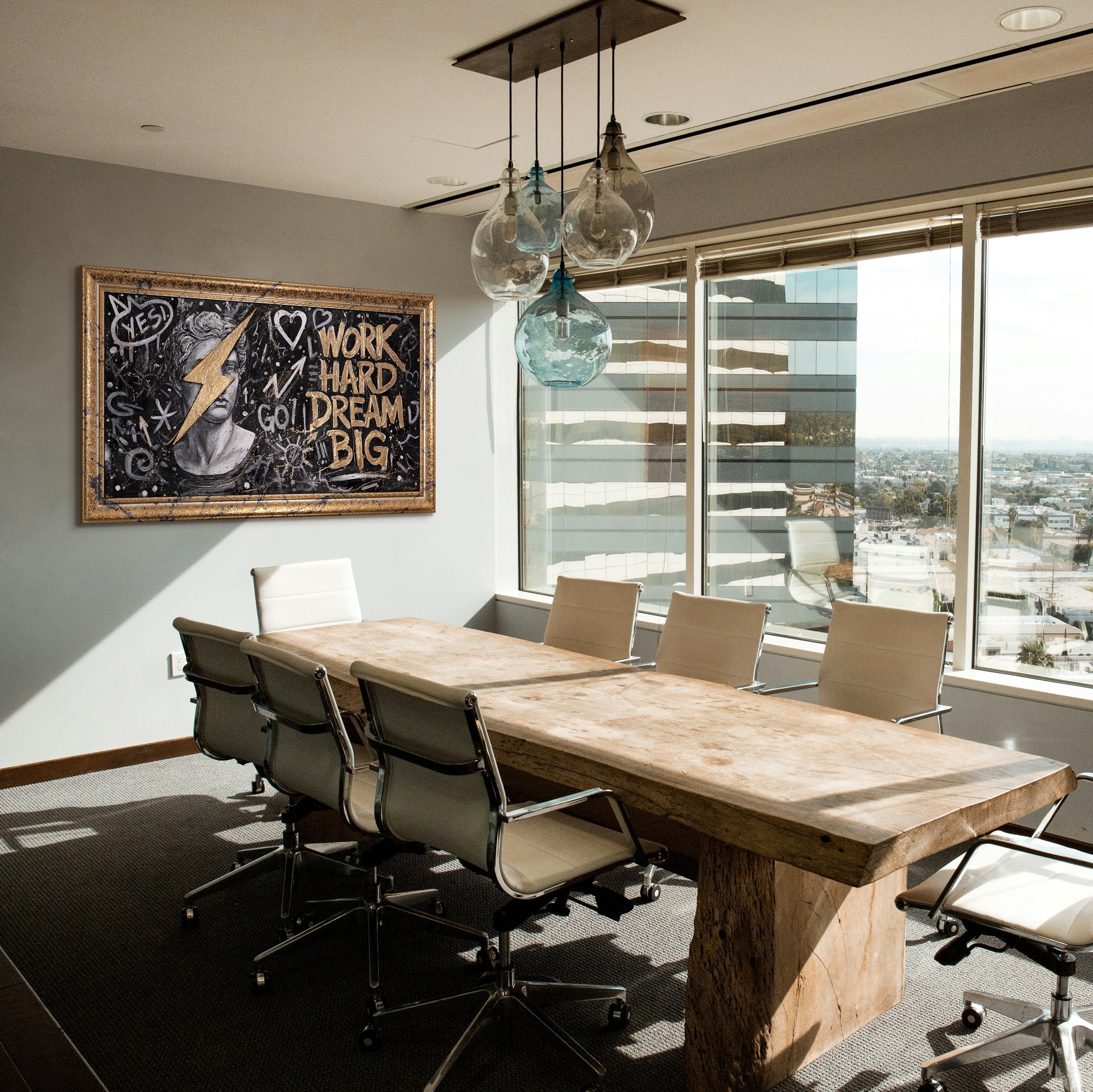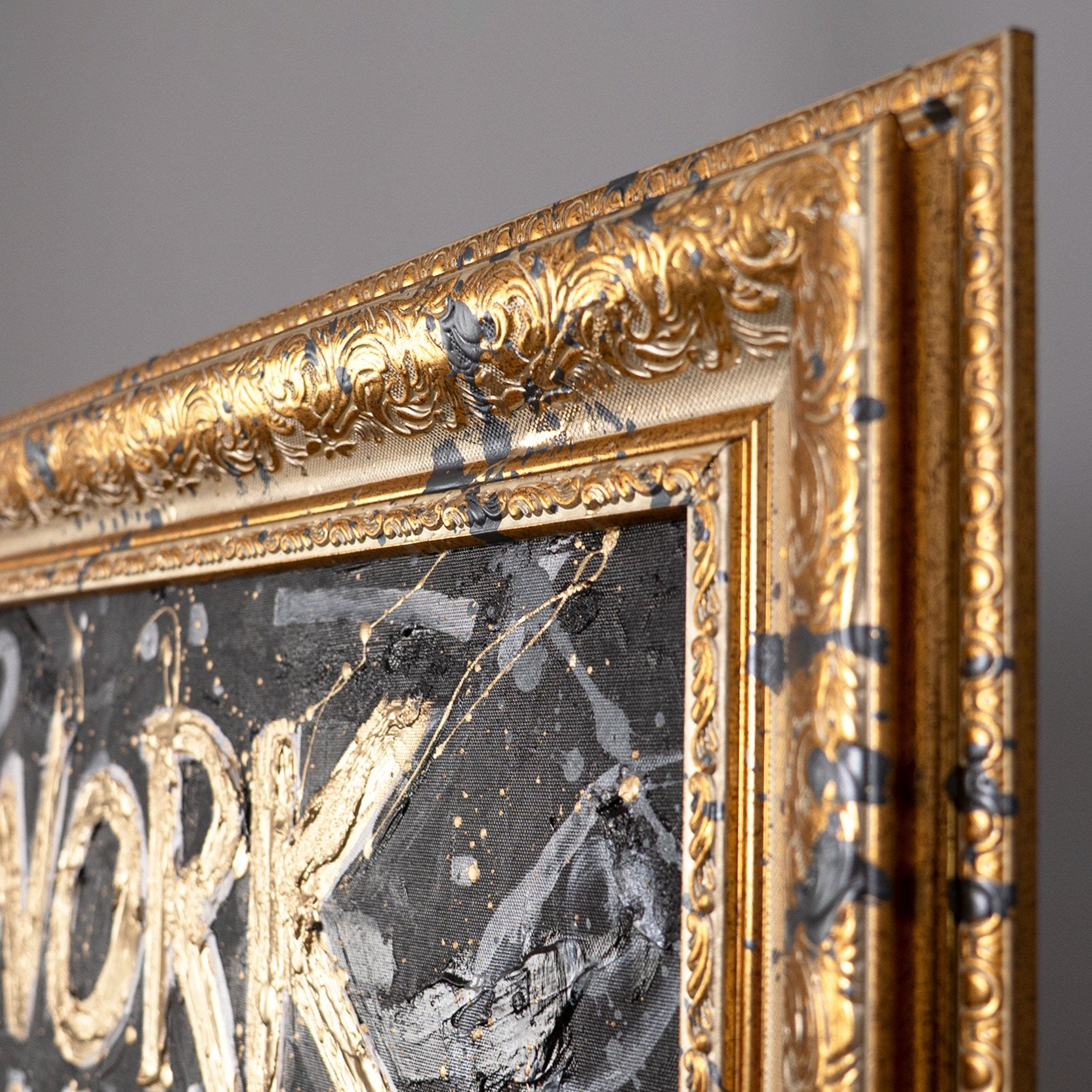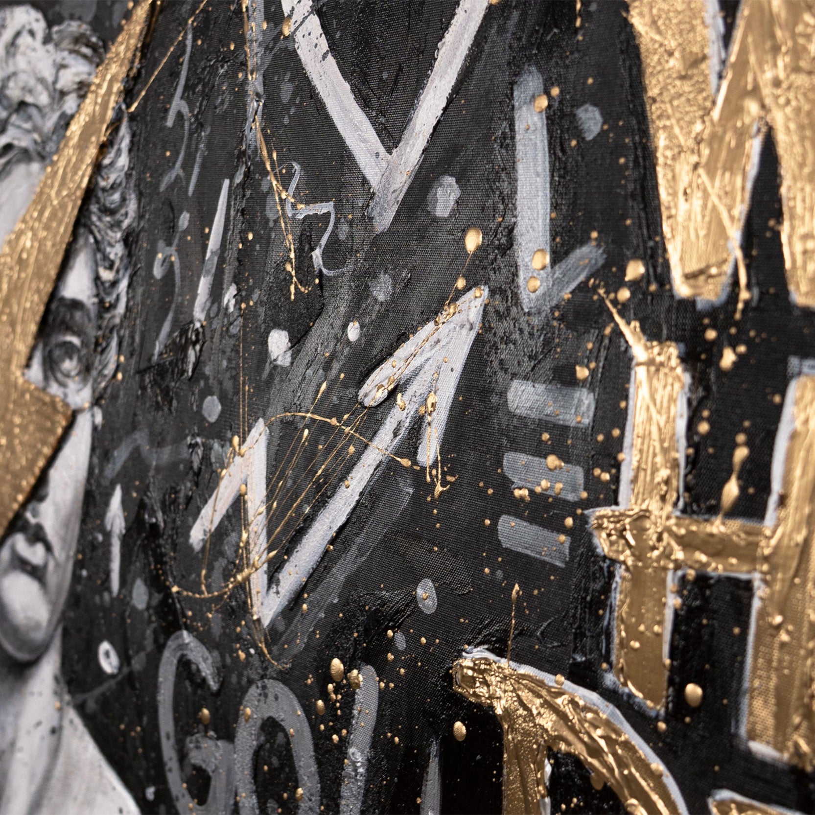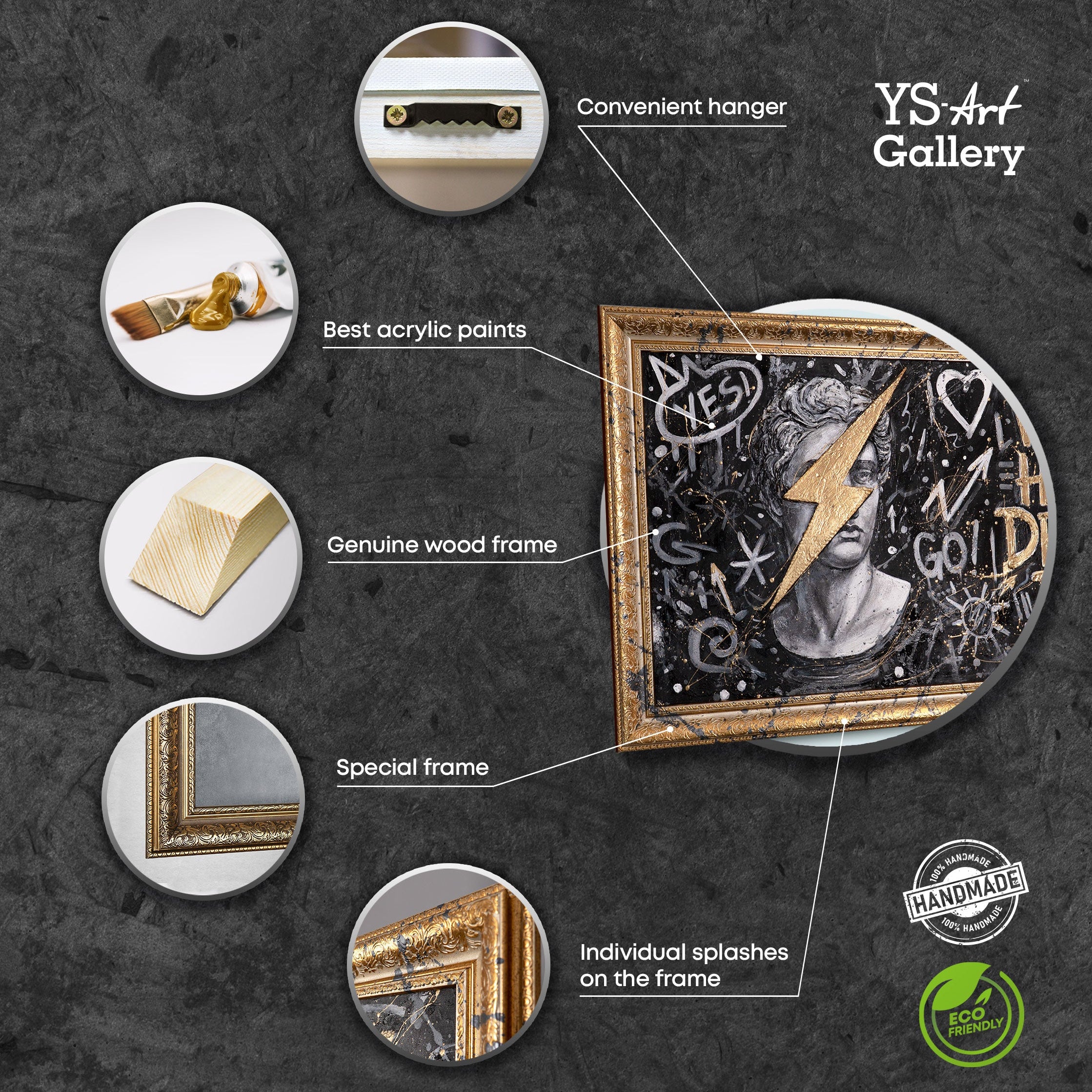 Dieses handgemalte Leinwandbild „Kunst der Motivation“ verbindet urbane Street-Art mit inspirierender Botschaft: Work Hard, Dream Big. Der goldene Blitz durch die antike Büste wird von ausdrucksstarken Symbolen wie Herzen, Pfeilen und Sternen begleitet. Jeder Pinselstrich ist ein Unikat – eine Fusion aus klassischer Skulptur und moderner Motivkunst.