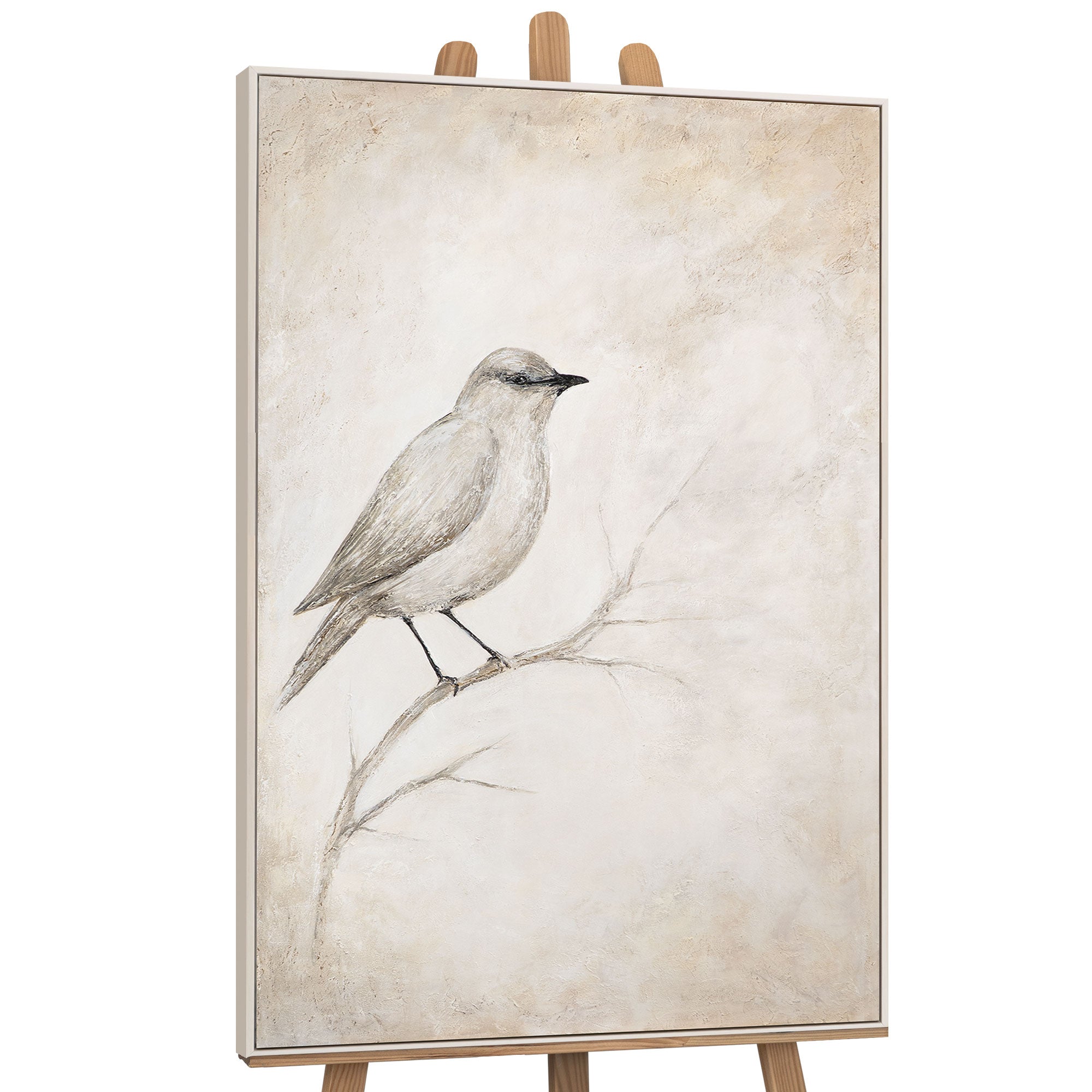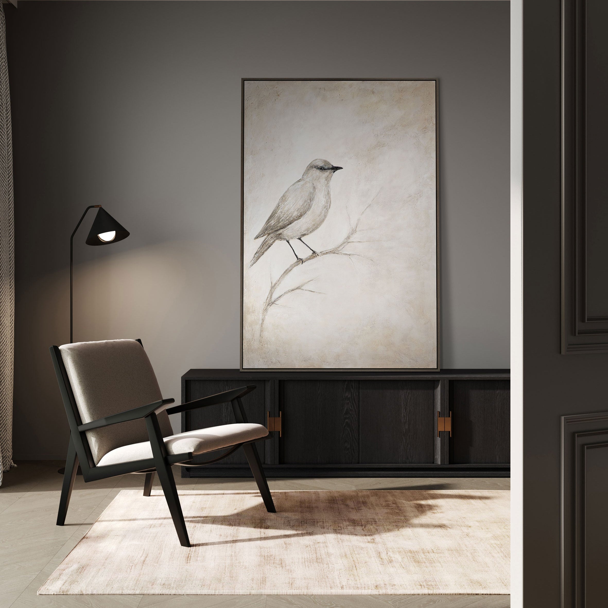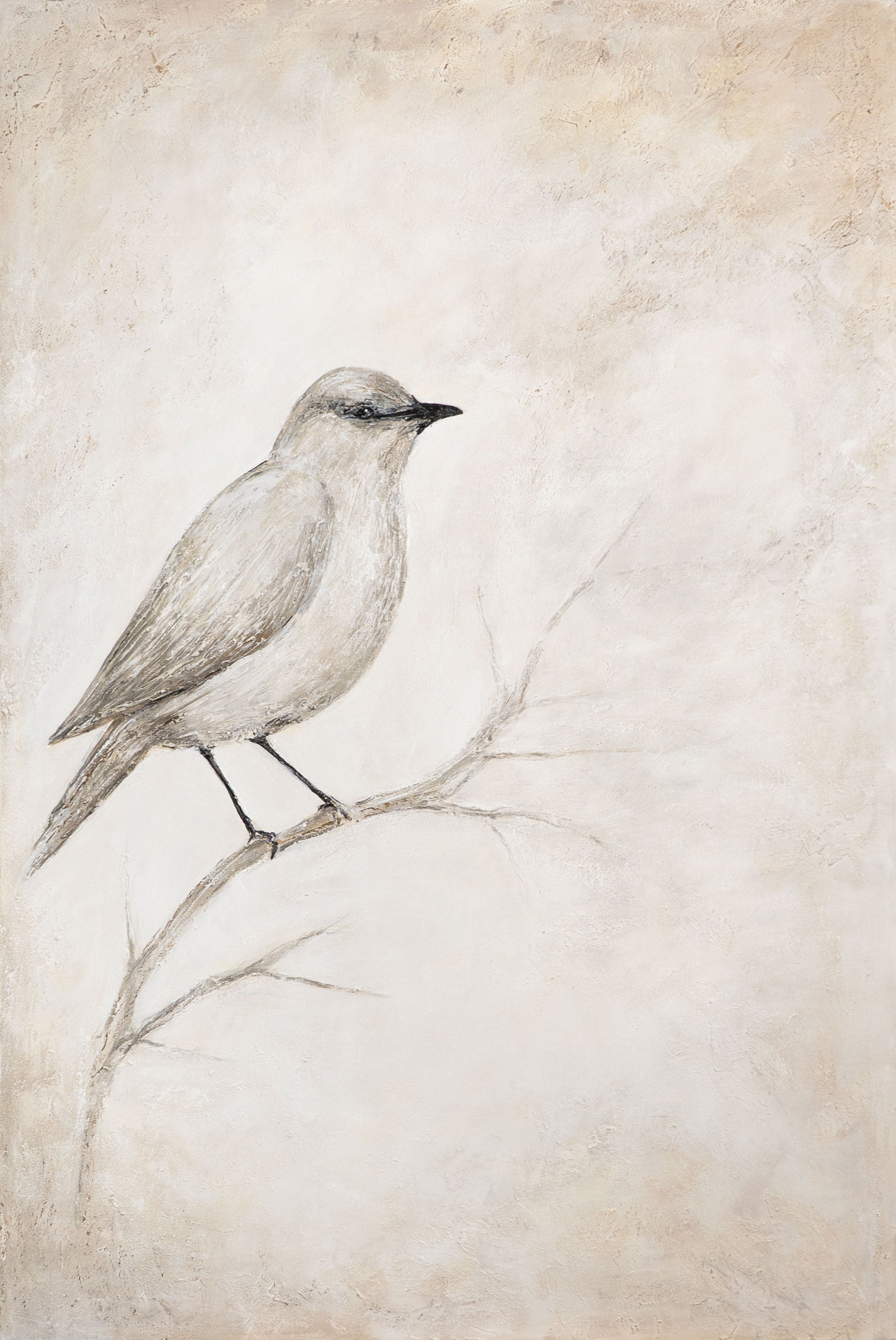 « Pause chantante » capture un instant de calme délicat. Un oiseau solitaire se perche sur une branche, entouré de douces nuances beiges et d'une texture subtile. La composition paisible confère à l'image une légèreté poétique, tandis que la surface tactile exhale profondeur et naturel.