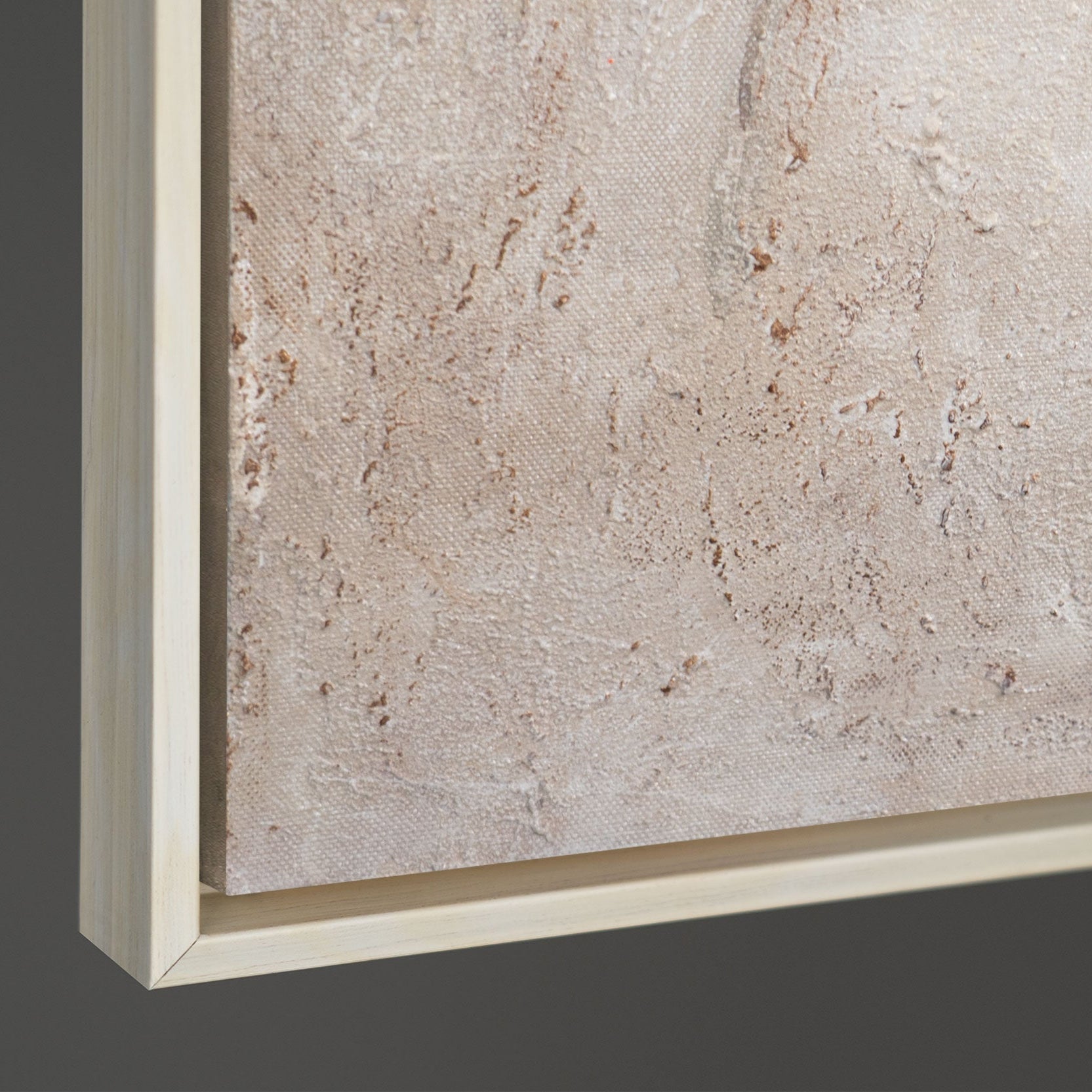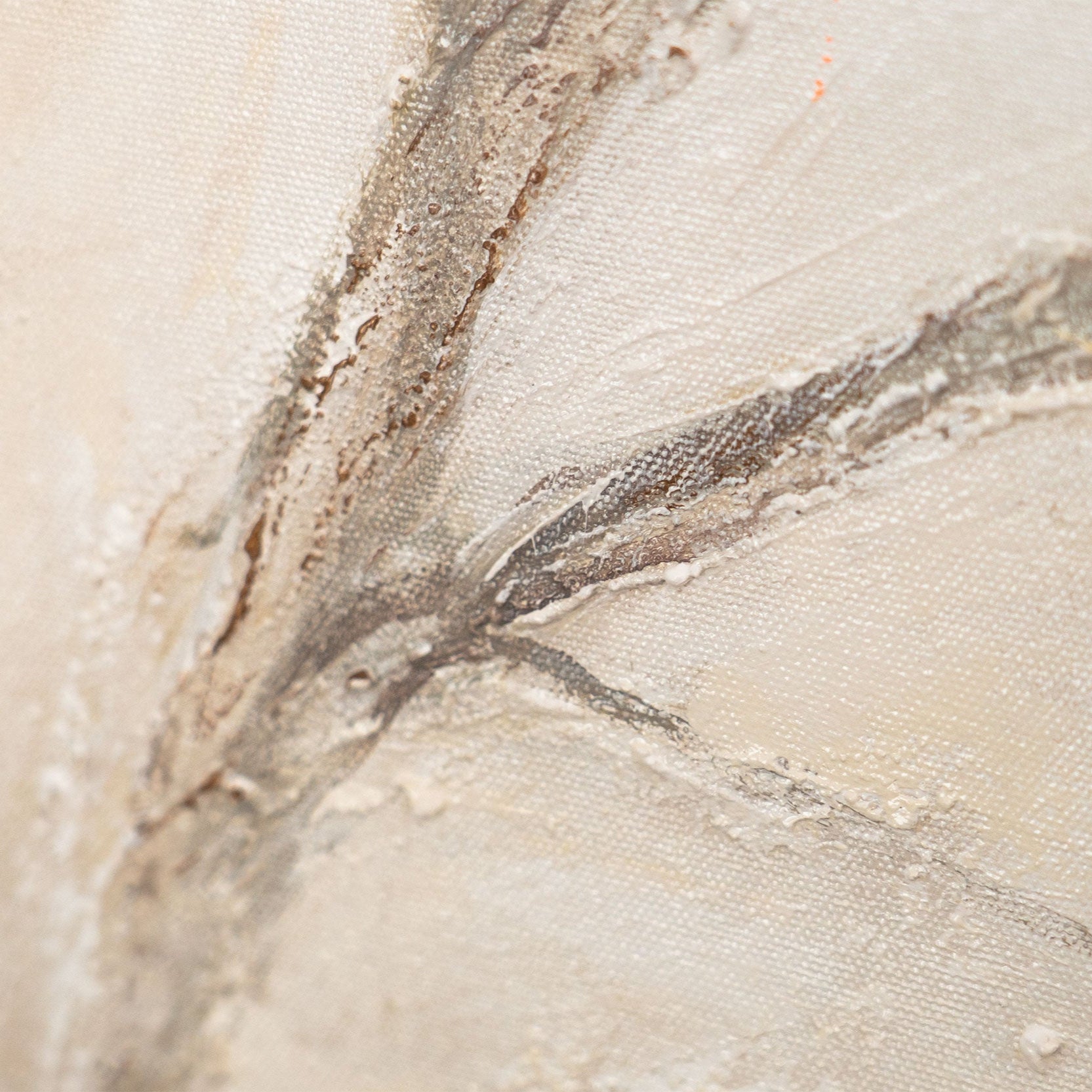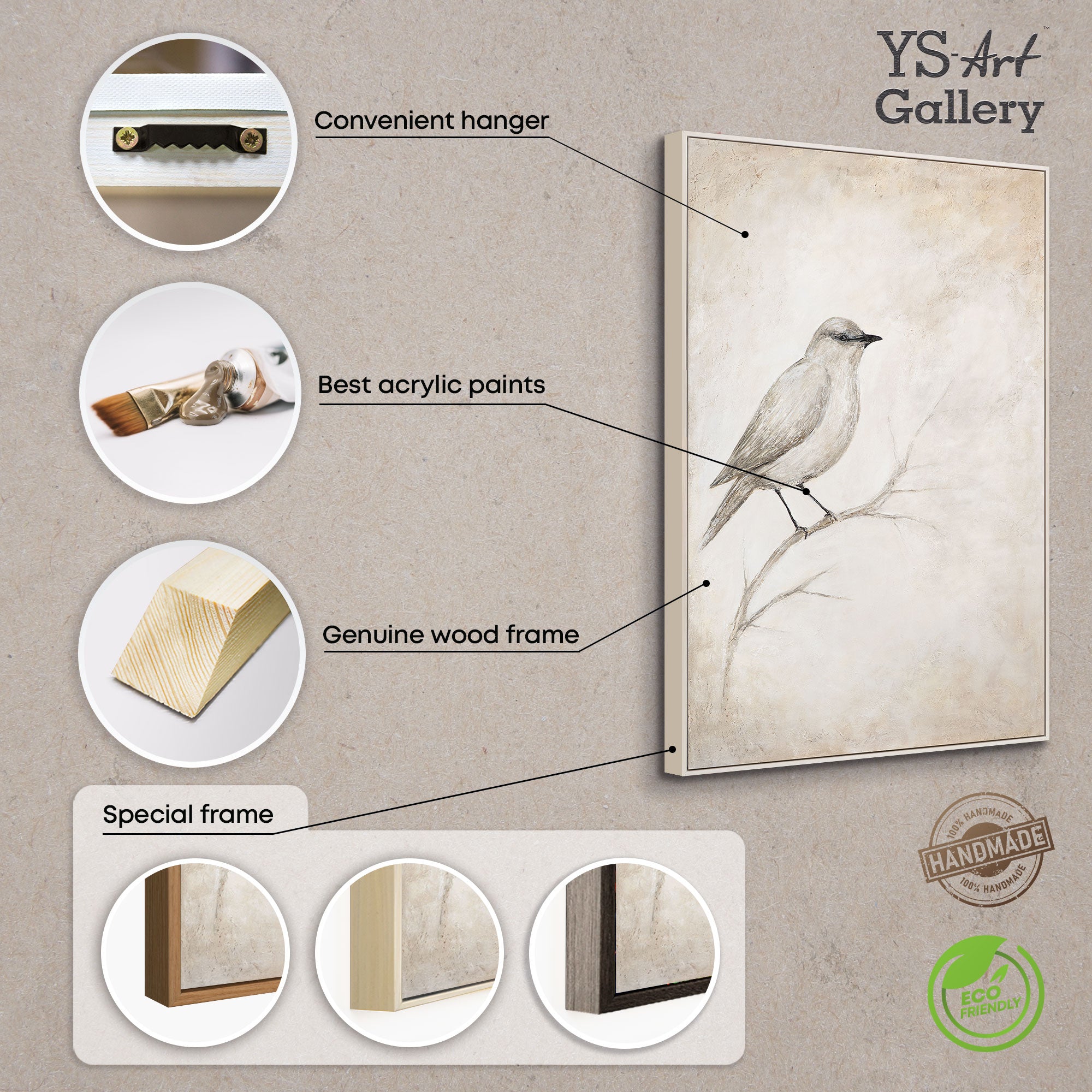 « Pause chantante » capture un instant de calme délicat. Un oiseau solitaire se perche sur une branche, entouré de douces nuances beiges et d'une texture subtile. La composition paisible confère à l'image une légèreté poétique, tandis que la surface tactile exhale profondeur et naturel.