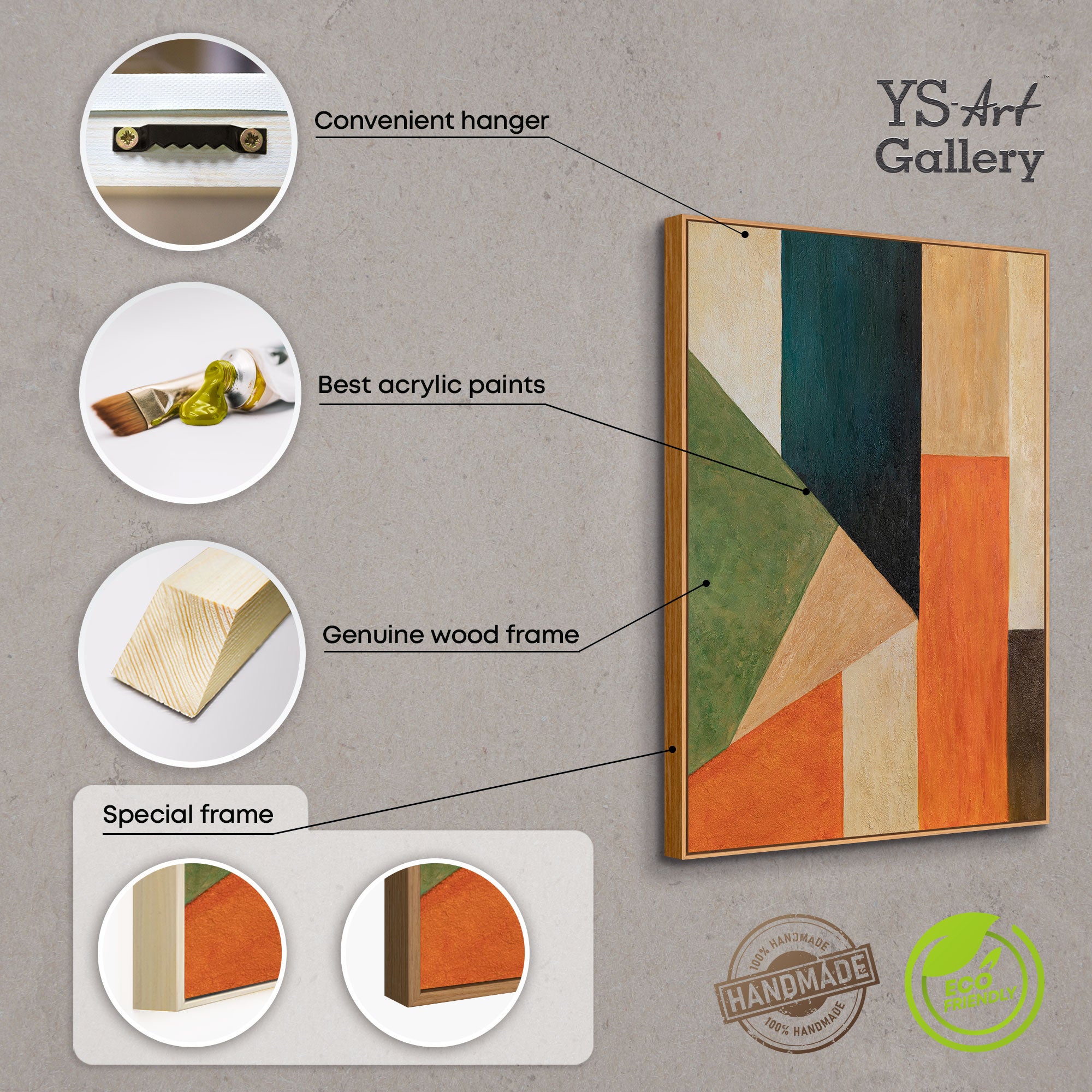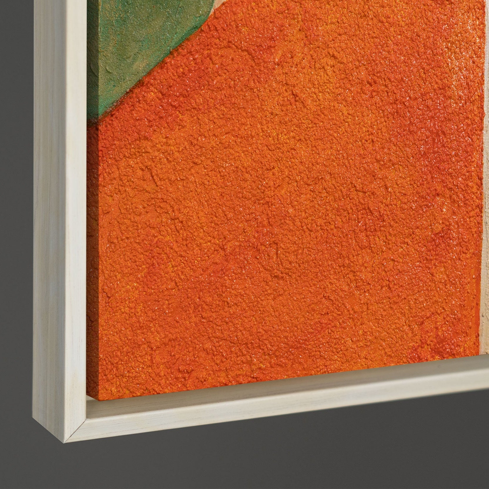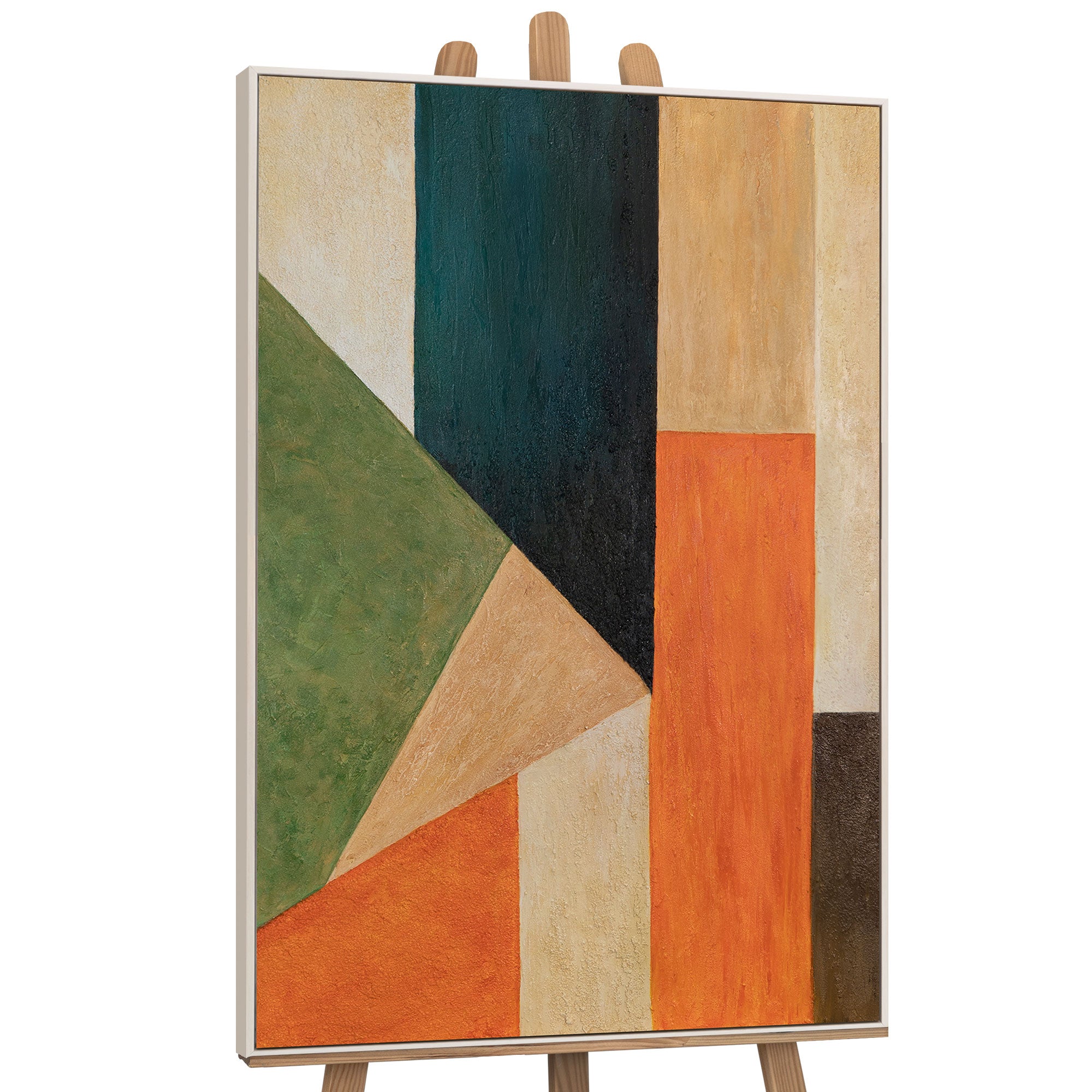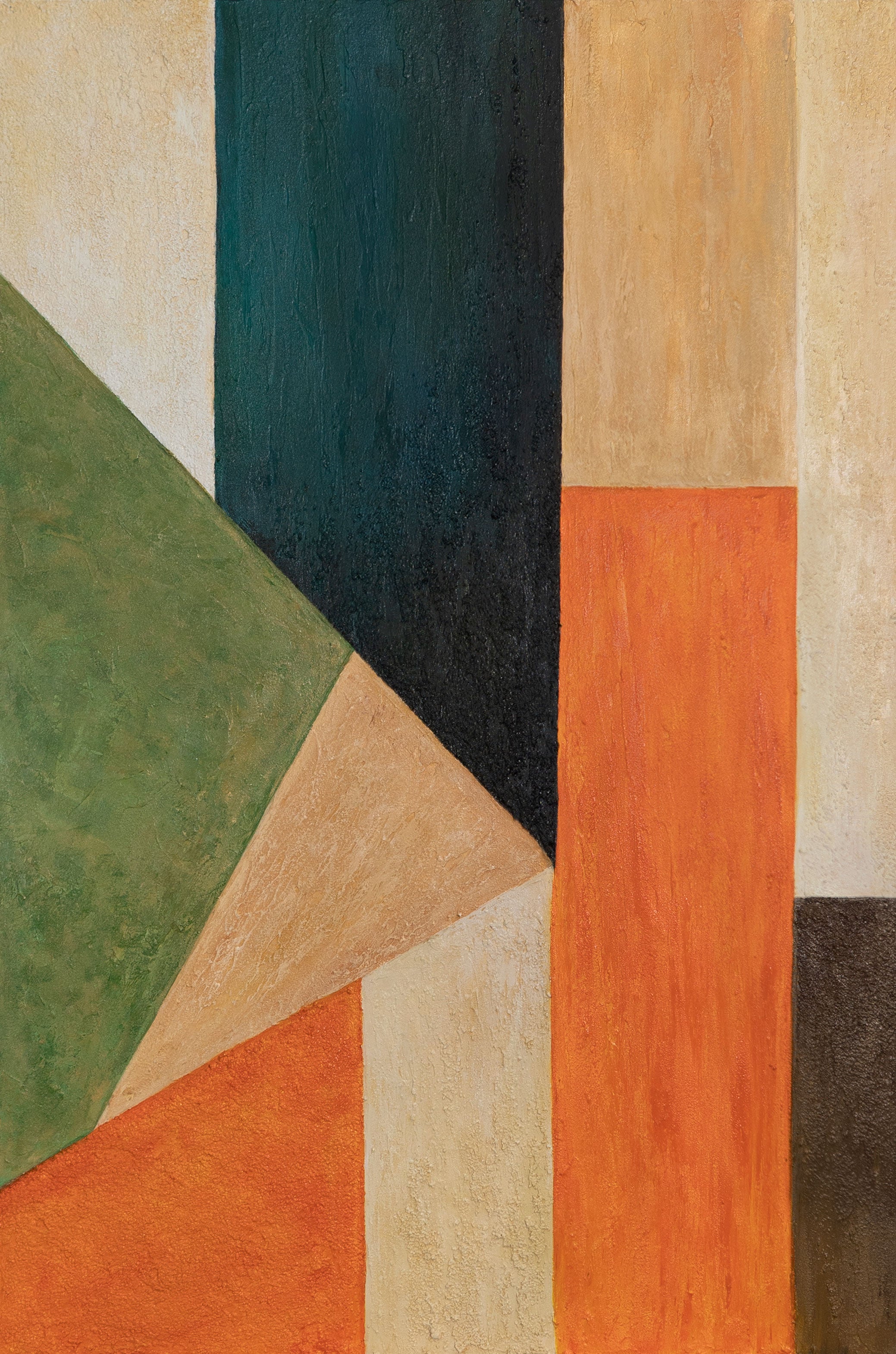 « Ordre et Mouvement » allie des lignes épurées à des touches de couleurs vibrantes. Des formes géométriques orange, vertes, noires et beiges créent un jeu captivant entre stabilité et dynamisme. La texture de la peinture acrylique confère à la composition profondeur et expressivité tactile.