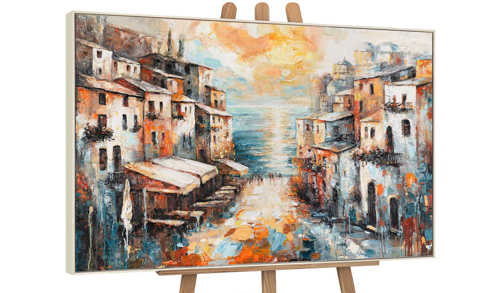 • Mediterranes Stadtbild – Leinwandbild mit beigem Rahmen