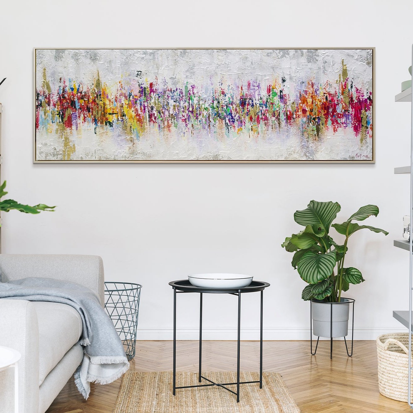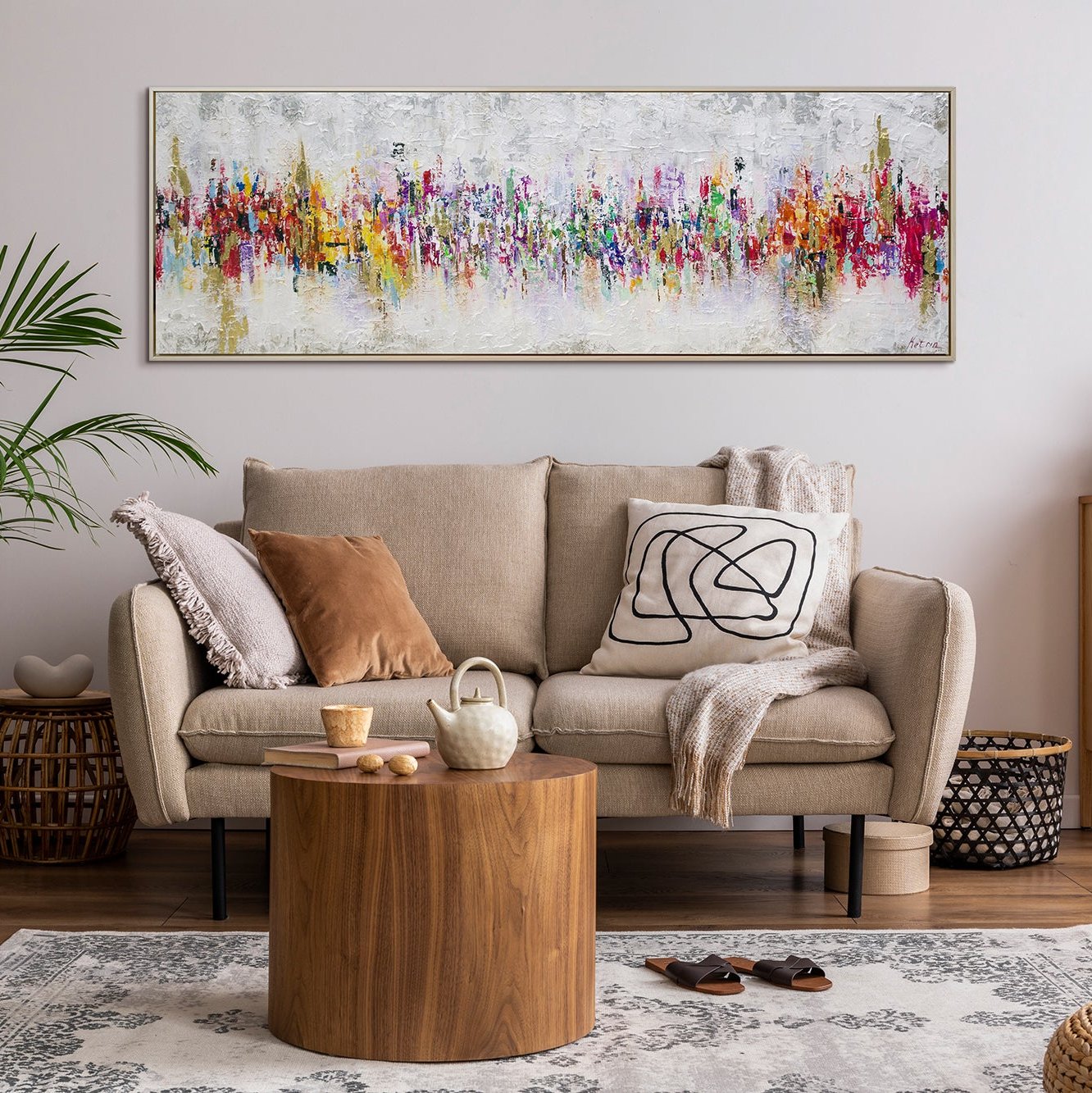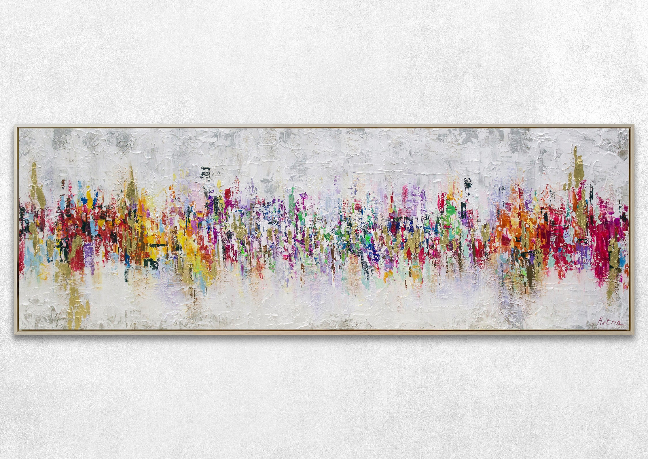 Dieses farbenfrohe, abstrakte Bild bringt Dynamik und Lebendigkeit in Ihr Zuhause. Die bunten Acrylfarben auf Leinwand fangen die Energie und Kreativität einer modernen Stadtlandschaft ein. Mit kräftigen Farbtupfern in Rot, Gelb, Grün und Blau wird dieses Gemälde garantiert zum Blickfang in jedem Raum.