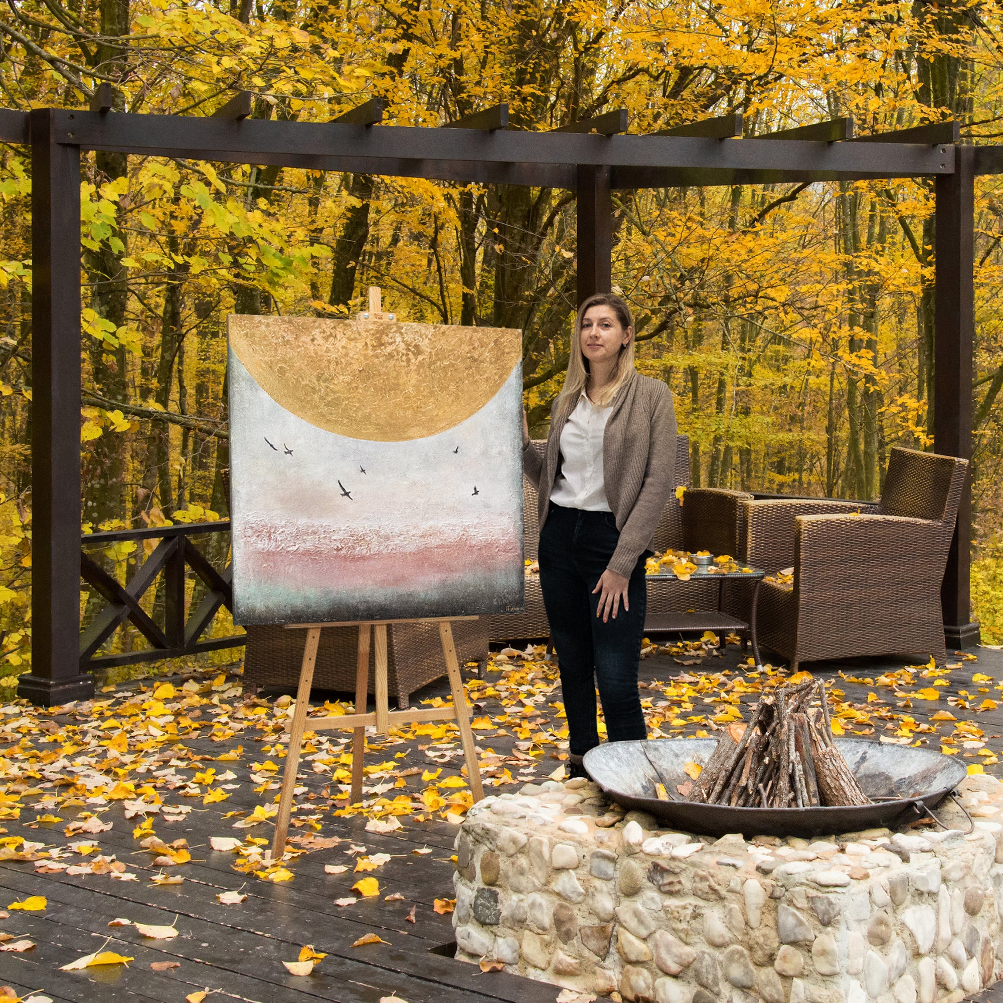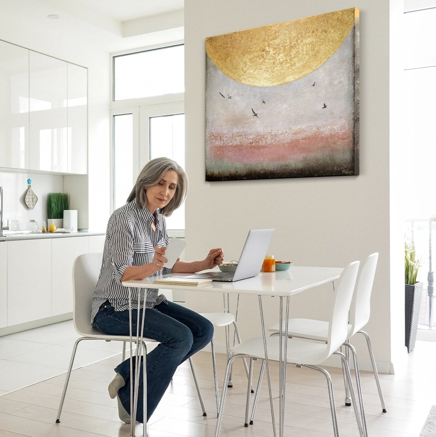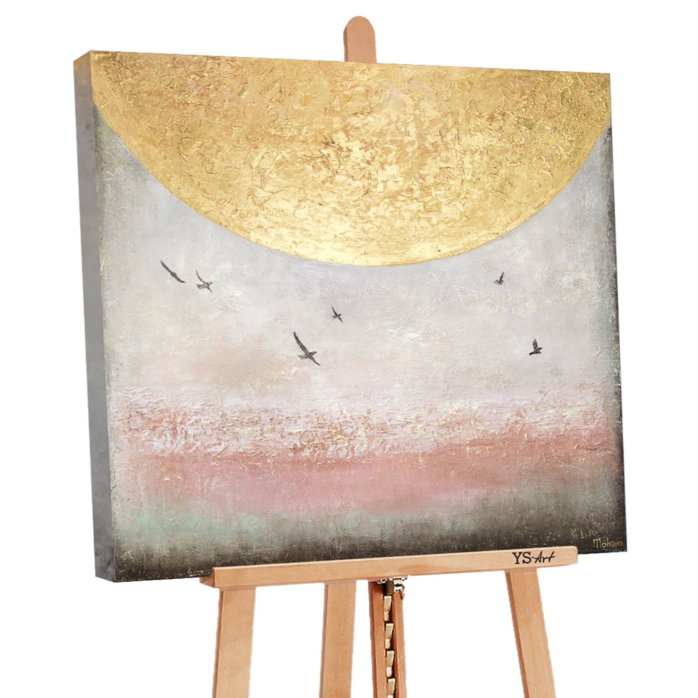 Dieses abstrakte Kunst Gemälde auf Leinwand beeindruckt durch seine minimalistische Darstellung eines Himmels mit fliegenden Vögeln und einem goldenen Akzent, der die Szenerie perfekt abrundet. Handgemalt auf hochwertiger Leinwand, bringt dieses Bild eine moderne und zugleich ruhige Atmosphäre in jedes Zuhause. Ideal für Wohnzimmer, Schlafzimmer oder Arbeitszimmer.