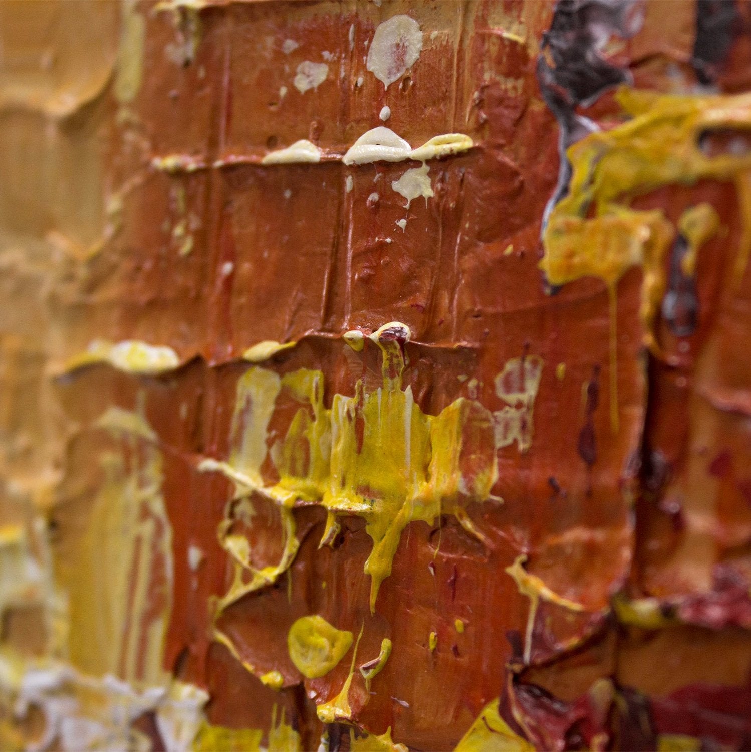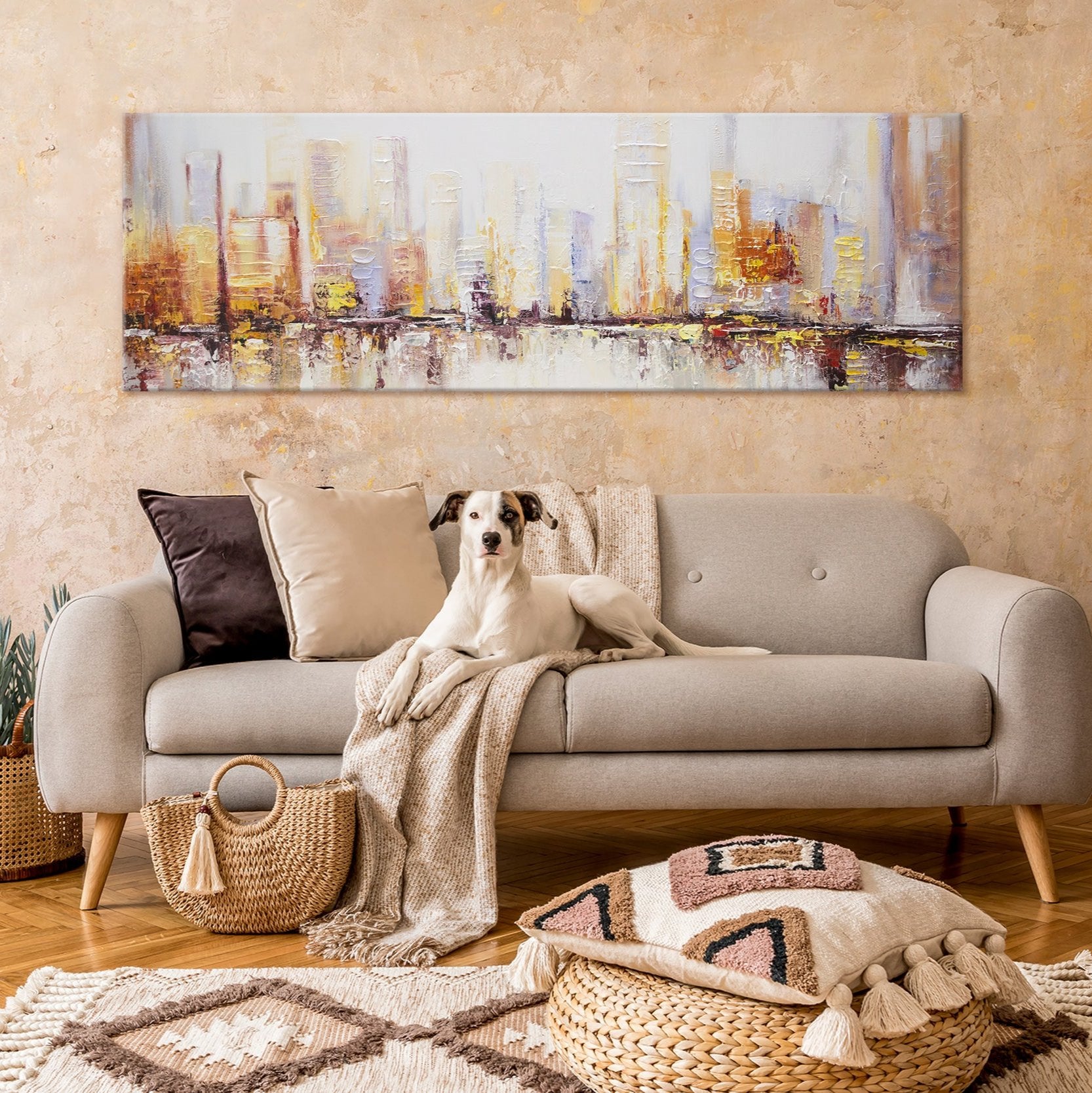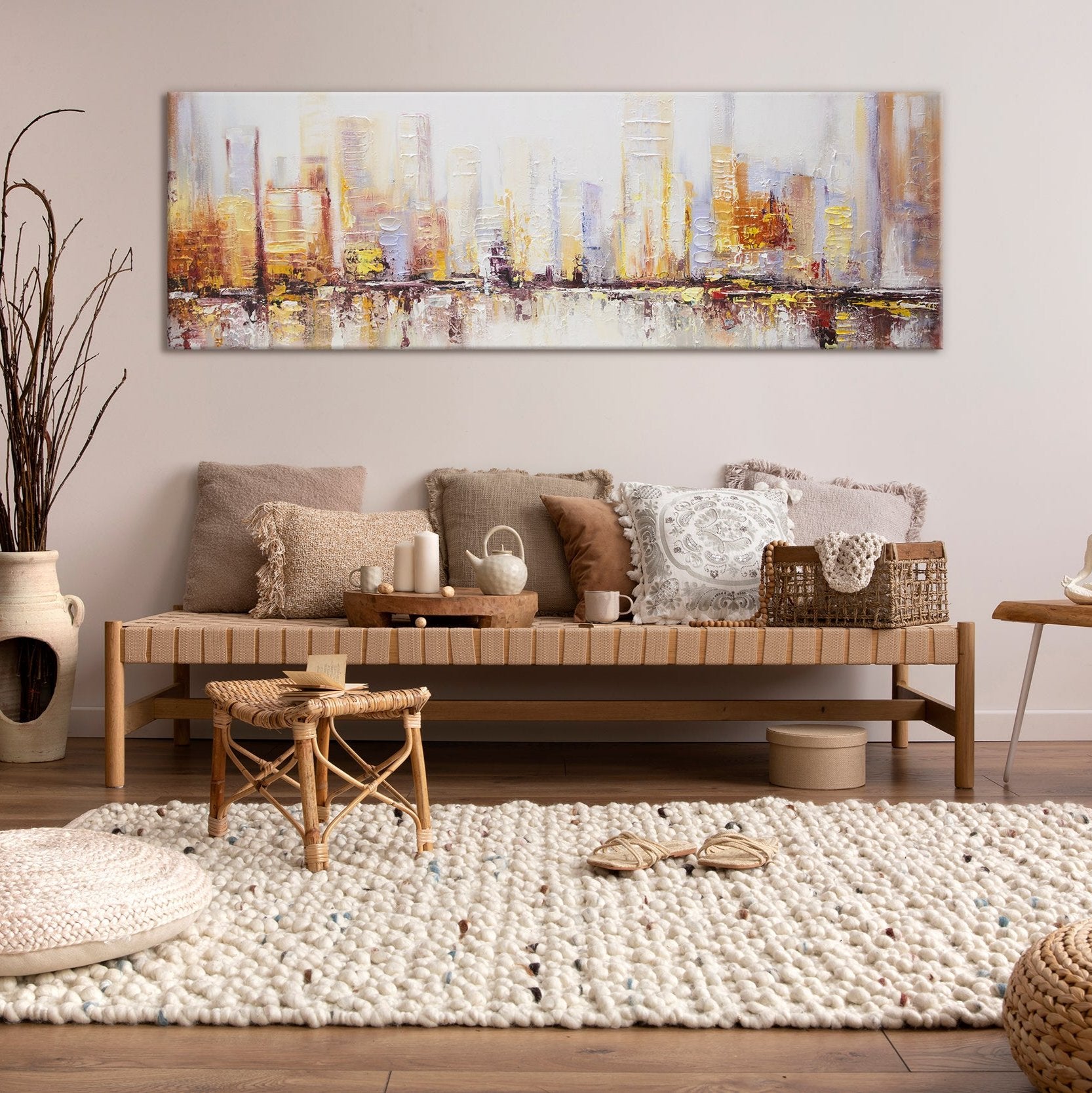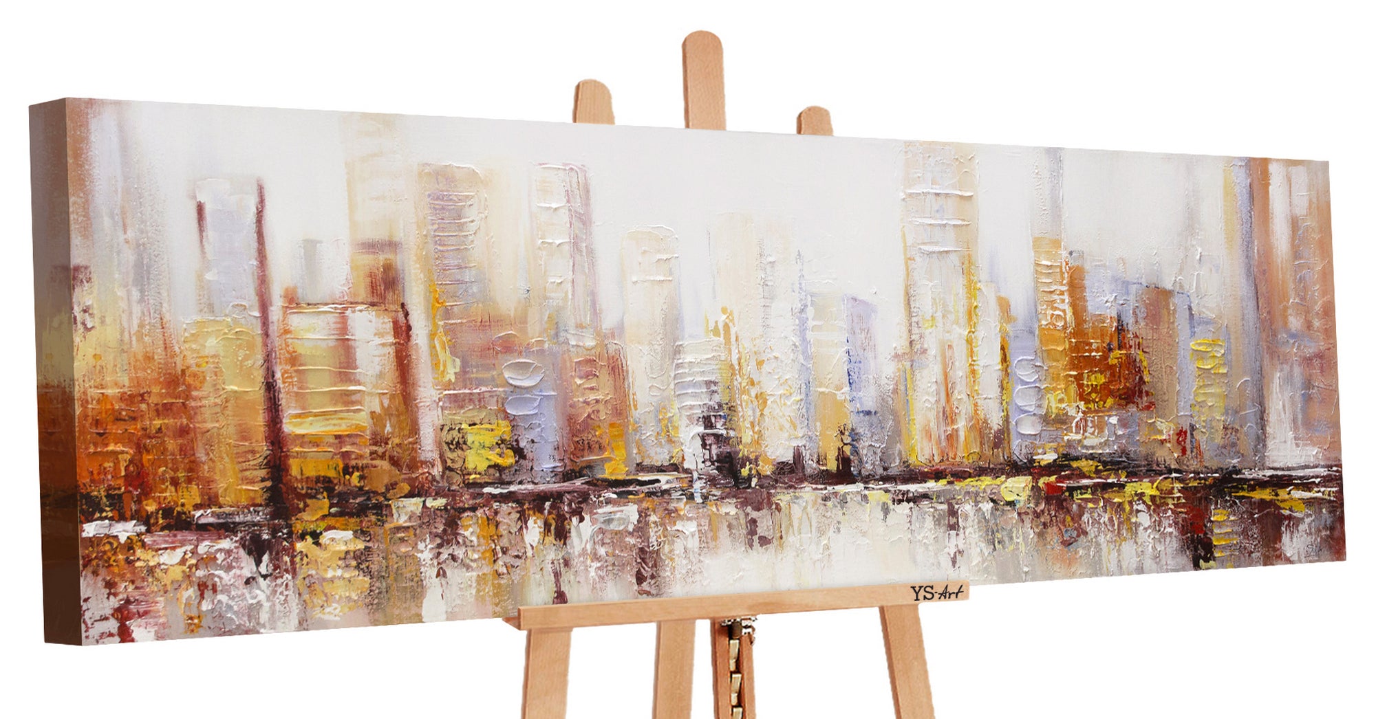 Dieses beeindruckende Acrylgemälde zeigt eine abstrakte Darstellung einer modernen Stadtlandschaft. Mit kräftigen Pinselstrichen und warmen Farben wie Gelb, Orange und Weiß bringt dieses Kunstwerk die Energie und das Leben einer Metropole auf Leinwand.