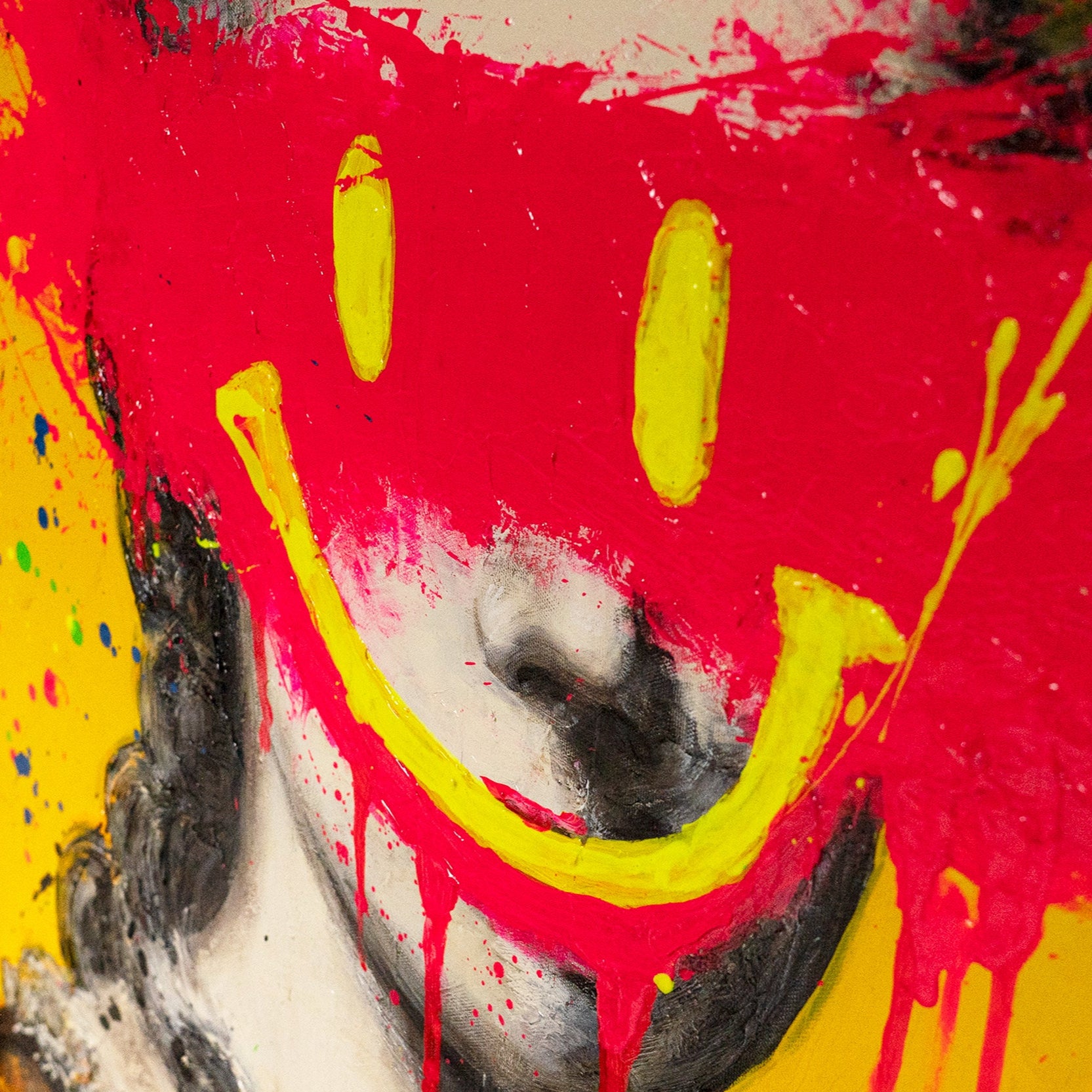 „Madame“ verbindet klassische Eleganz mit rebellischer Street-Art. Auf sonnig-gelbem Hintergrund erscheint ein traditionelles Frauenportrait in Schwarz-Weiß, überlagert von einem knalligen roten Smiley-Tag. Farbspritzer in Blau, Grün und Gelb brechen das Bild auf und machen es zu einer provokativen Pop-Art-Ikone.