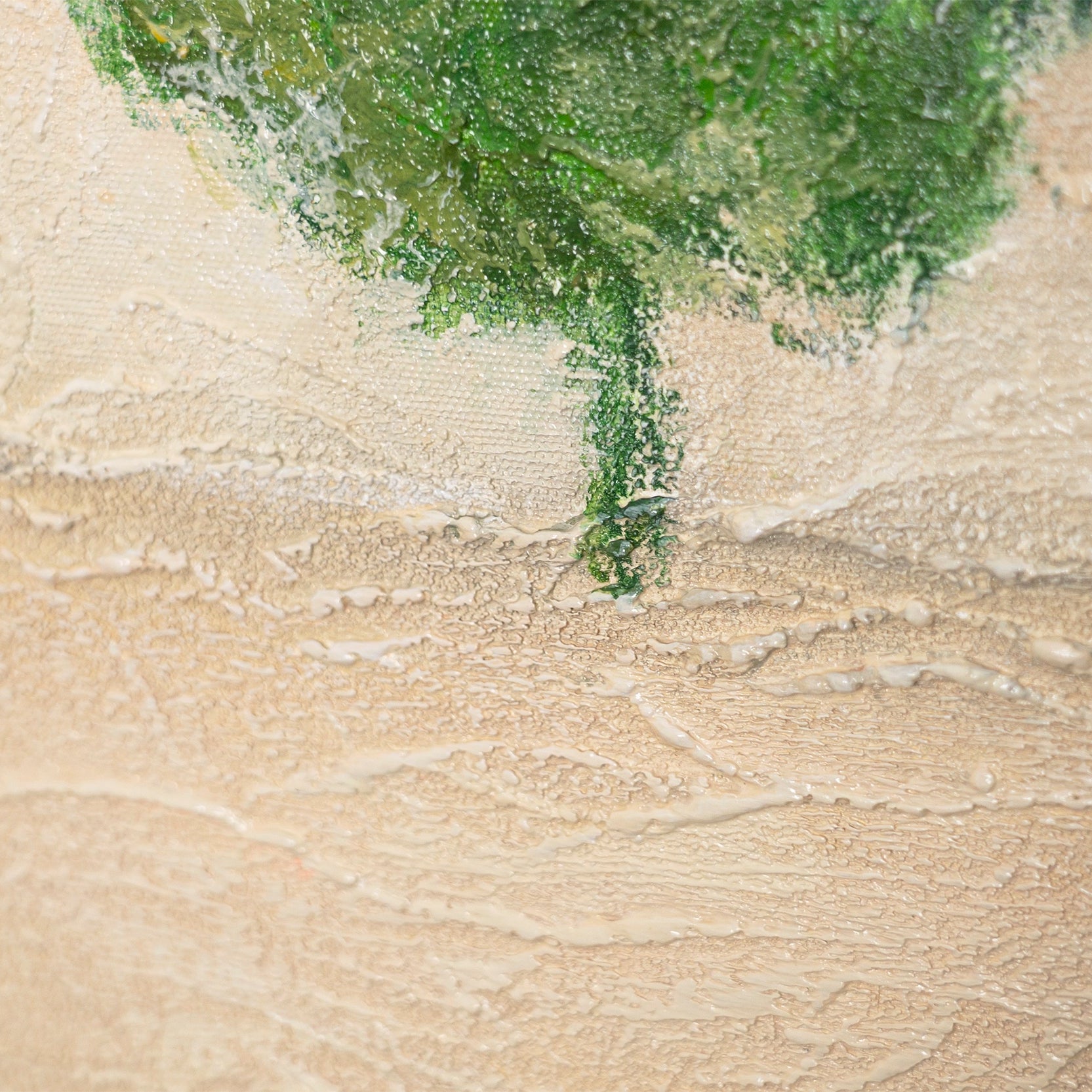 „Grüner Akzent“ ist ein Sinnbild für Stille und Neubeginn. Auf einer weichen, texturierten Fläche in sanften Beigetönen erhebt sich ein zarter, lebendig grüner Baum – der einzige Farbakzent in einer ruhigen Landschaft. Diese Reduktion auf das Wesentliche verleiht dem Werk eine meditative Tiefe und eine fast poetische Ruhe.