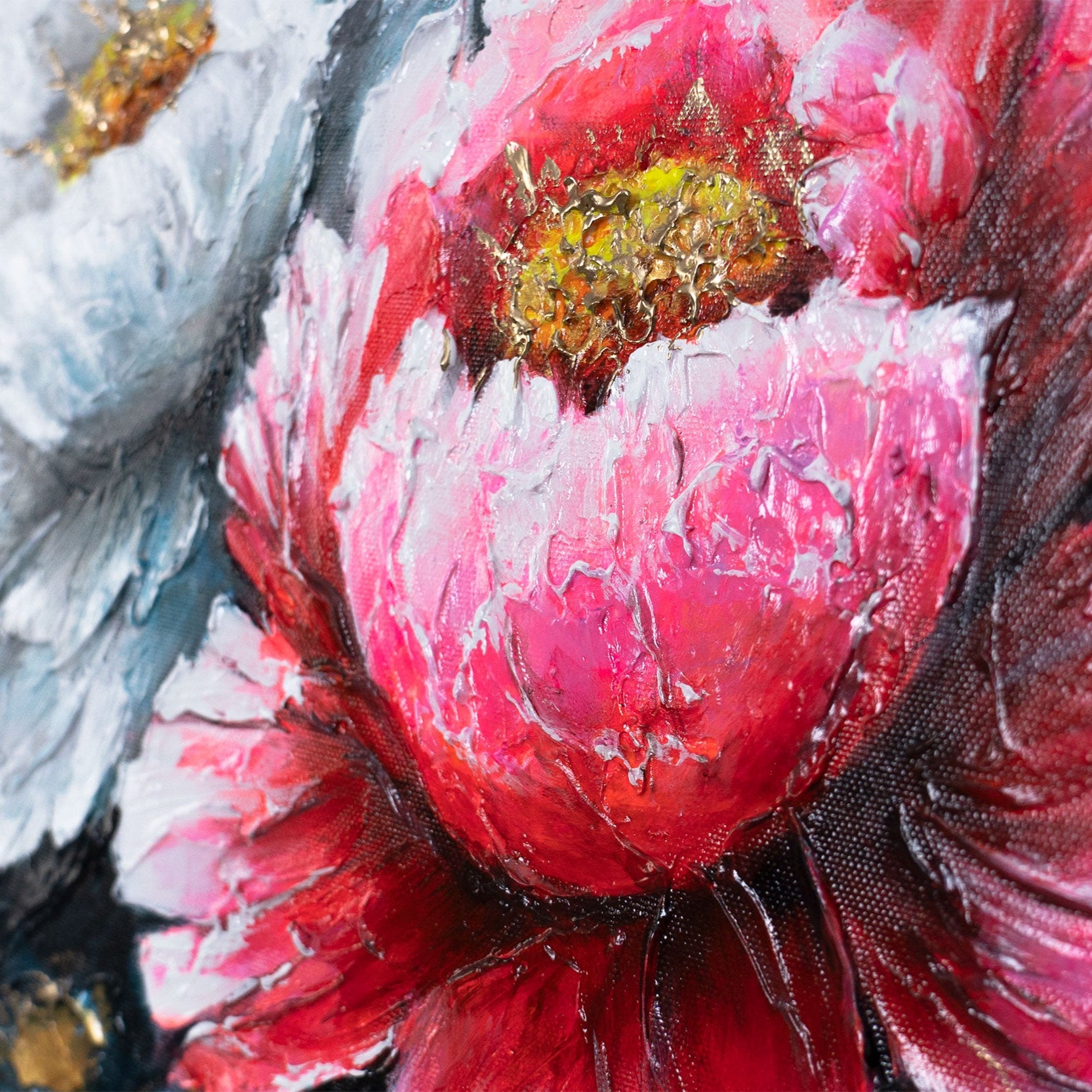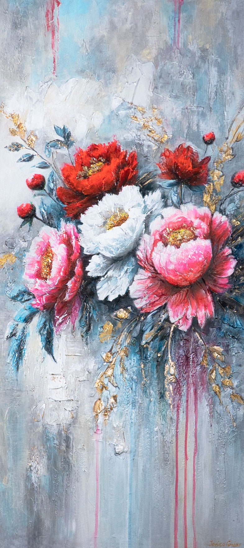 Das Acrylgemälde „Blühende Pfingstrosen“ begeistert mit einem harmonischen Zusammenspiel von Farbintensität, floraler Eleganz und strukturreicher Malweise. Die kräftigen Pfingstrosen in Rot, Weiß und Rosa, kombiniert mit Goldakzenten und kühlem Hintergrund, wirken lebendig und gleichzeitig beruhigend.