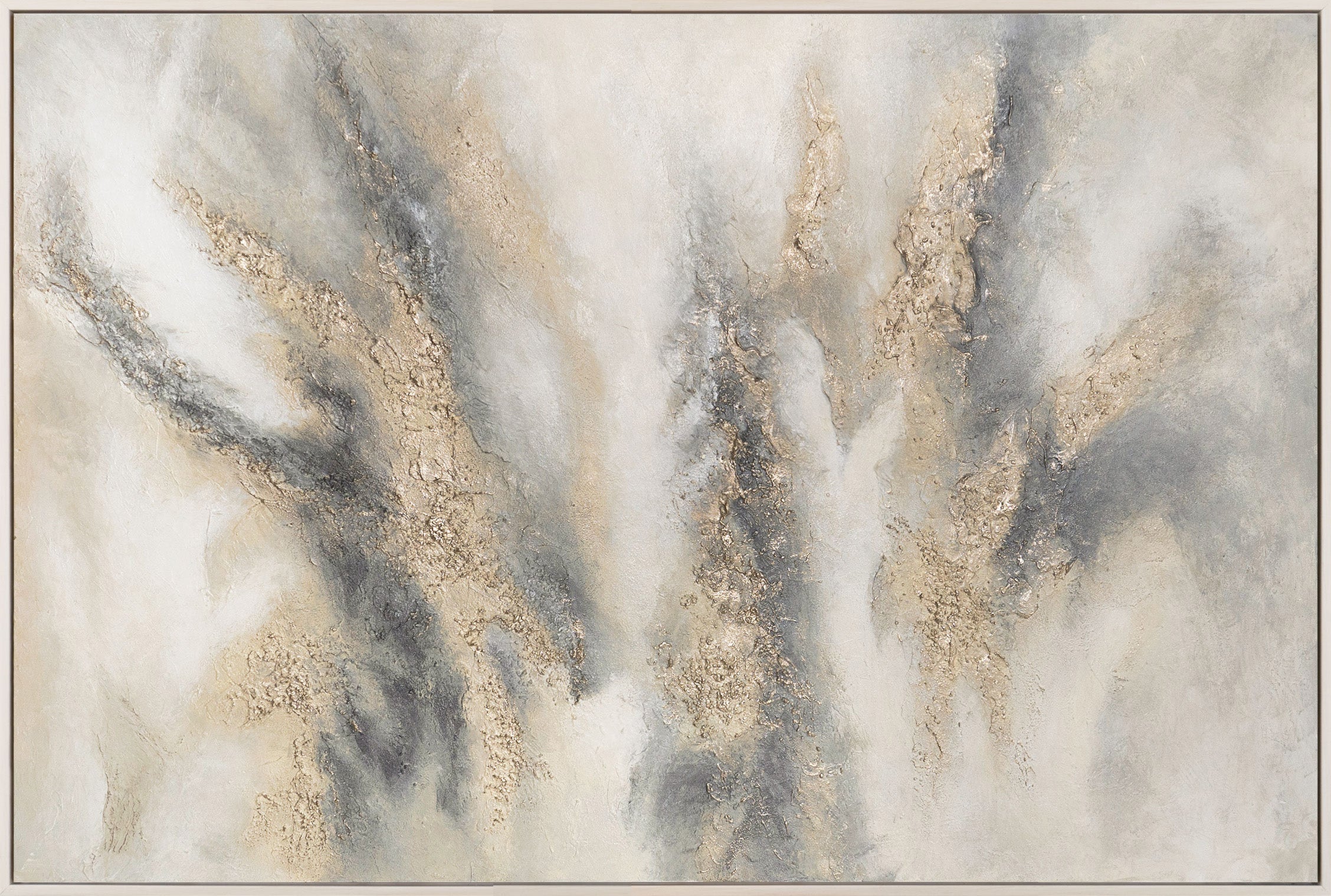 „Wolkenmelodie“ verbindet weiche, wolkenartige Farbverläufe in Beige, Grau und Creme mit kraftvollen, goldenen Strukturbereichen. Die reliefartigen Akzente wirken wie natürlicher Fels oder mineralische Schichten, die sich aus der ruhigen Nebelatmosphäre heraus formen. Die Übergänge aus feinen Nebelschwaden und markanten Strukturen verleihen dem Gemälde Tiefe, Leuchtkraft und eine dynamische, dennoch sanfte Präsenz im Raum.