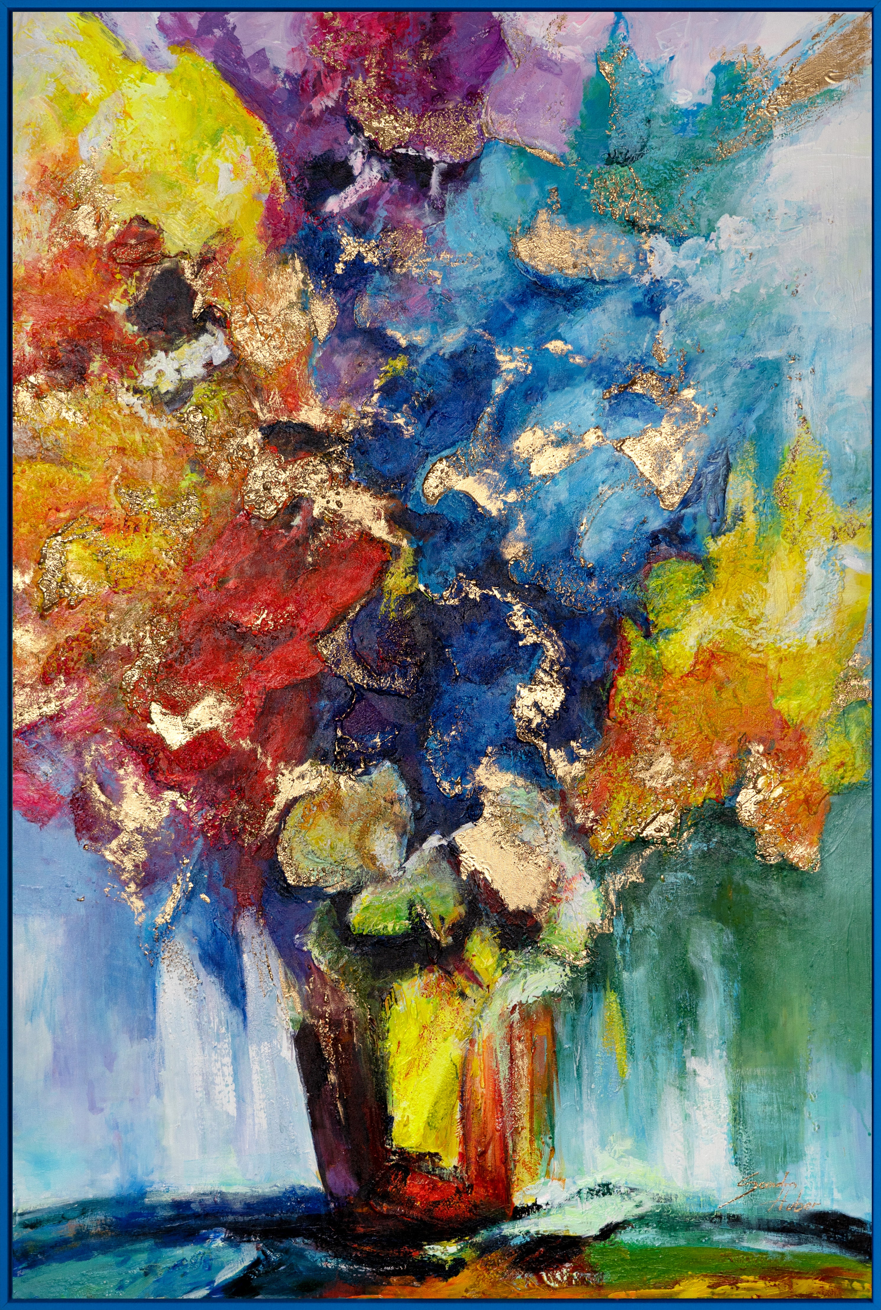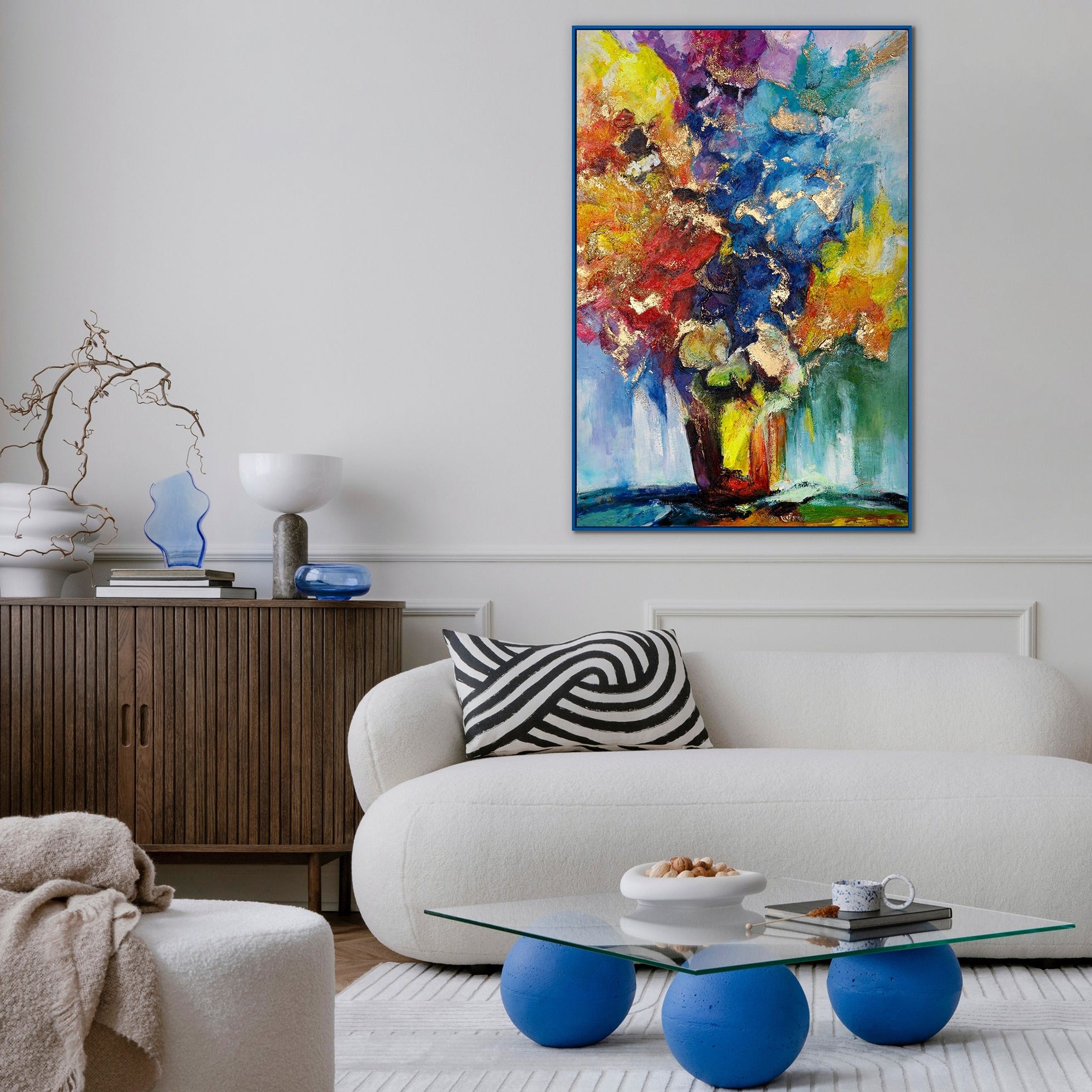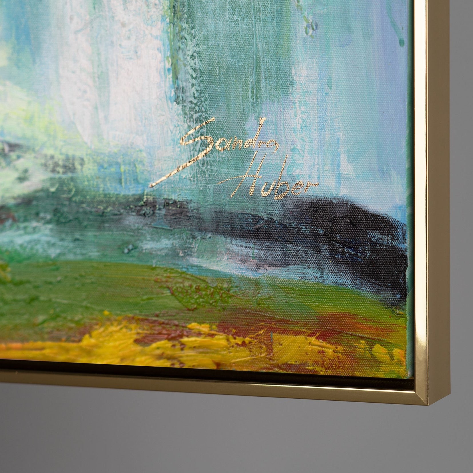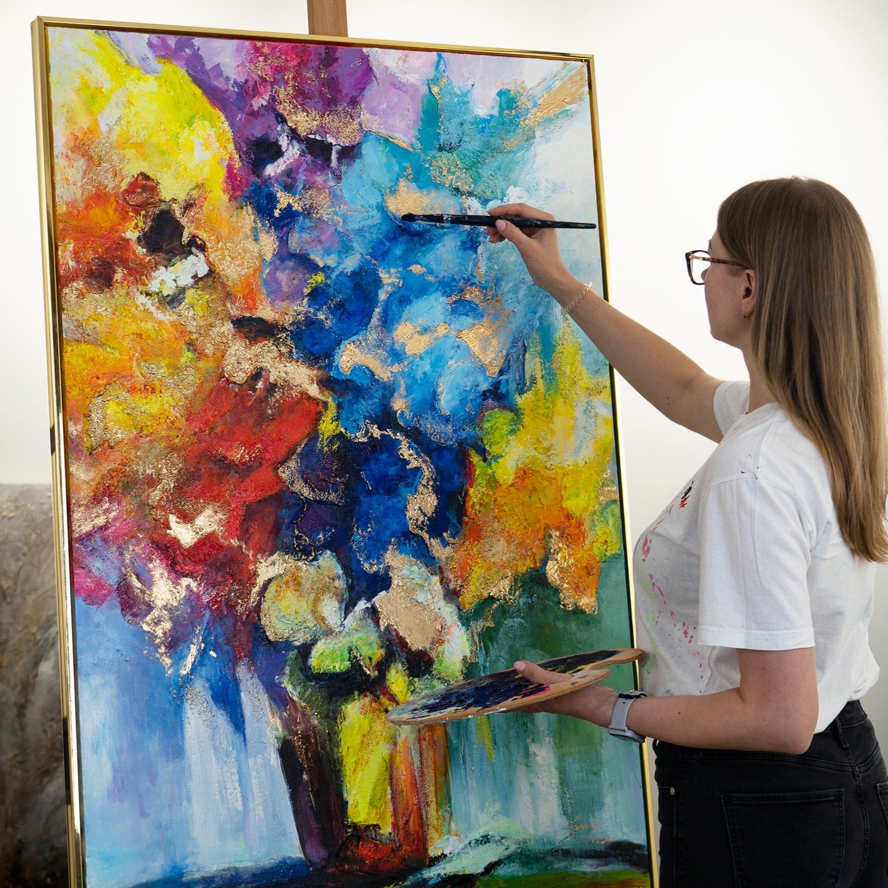 Bereichern Sie Ihr Zuhause mit diesem farbenfrohen, abstrakten Kunstwerk, das die Schönheit der Natur in lebendigen Farben darstellt. Das Bild besticht durch intensive Farbtöne und ausdrucksstarke Pinselstriche. Es ist 100% handgemalt und wird durch einen eleganten Rahmen hervorgehoben.
