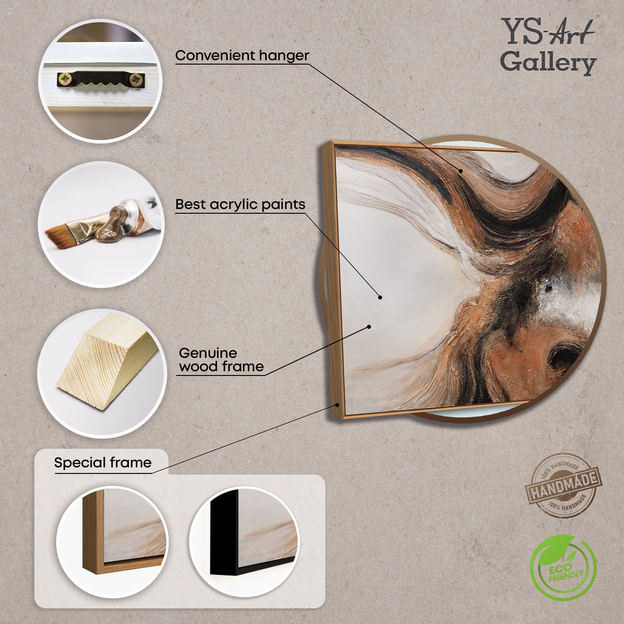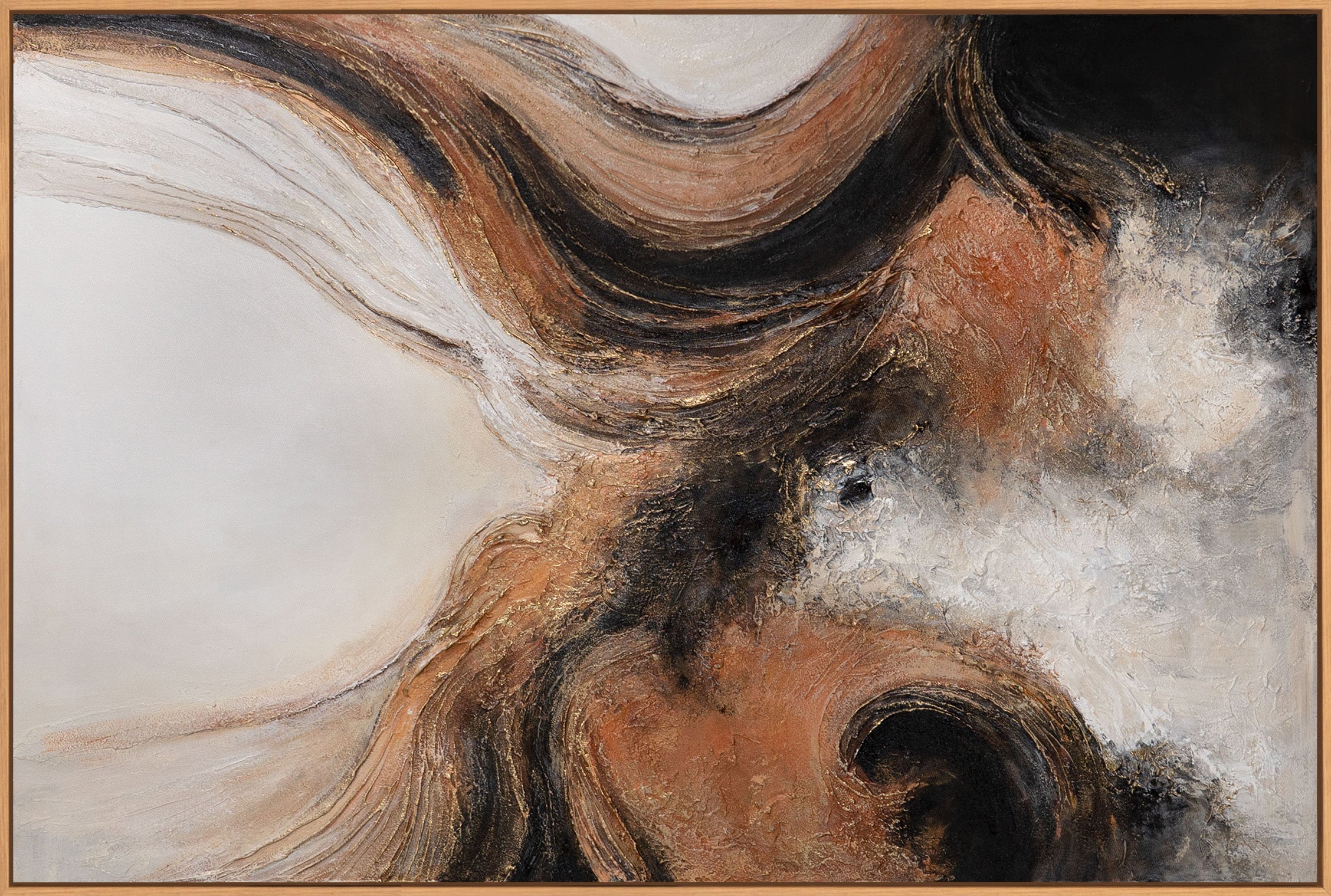 La toile peinte à la main est présentée dans un cadre et convient parfaitement comme décoration murale moderne pour le salon, la salle à manger ou les espaces de travail élégants. La structure expressive donne de l'énergie et du caractère à la pièce sans la rendre agitée, et s'intègre harmonieusement dans les intérieurs contemporains.