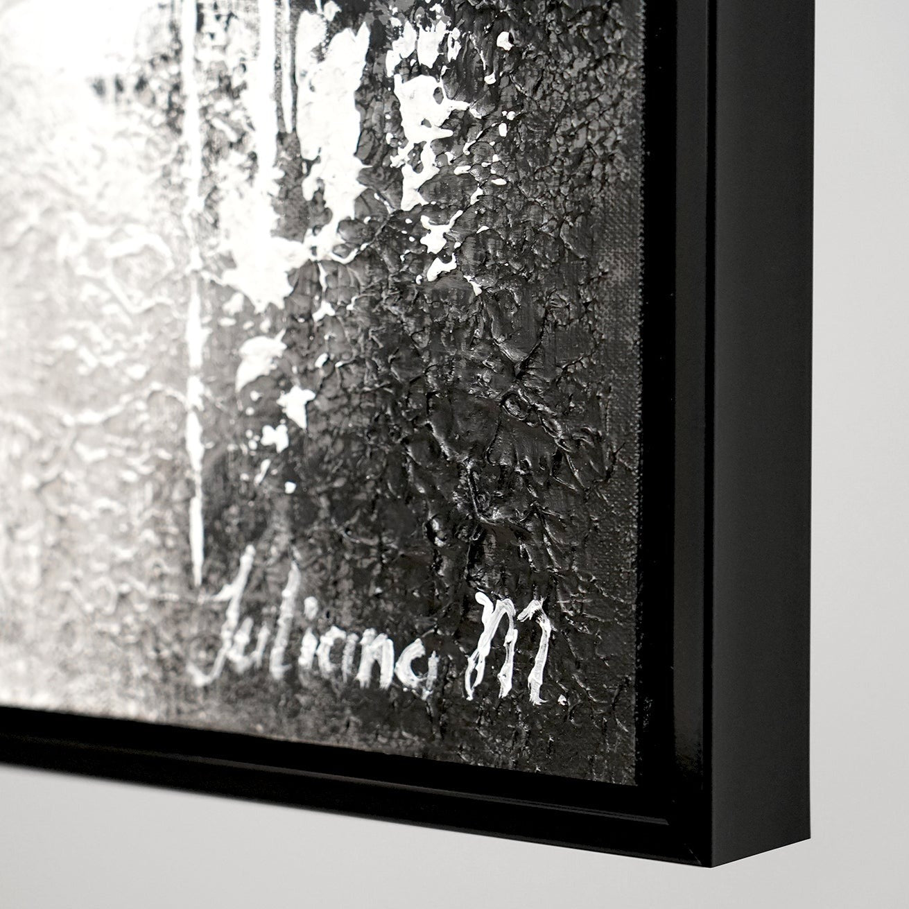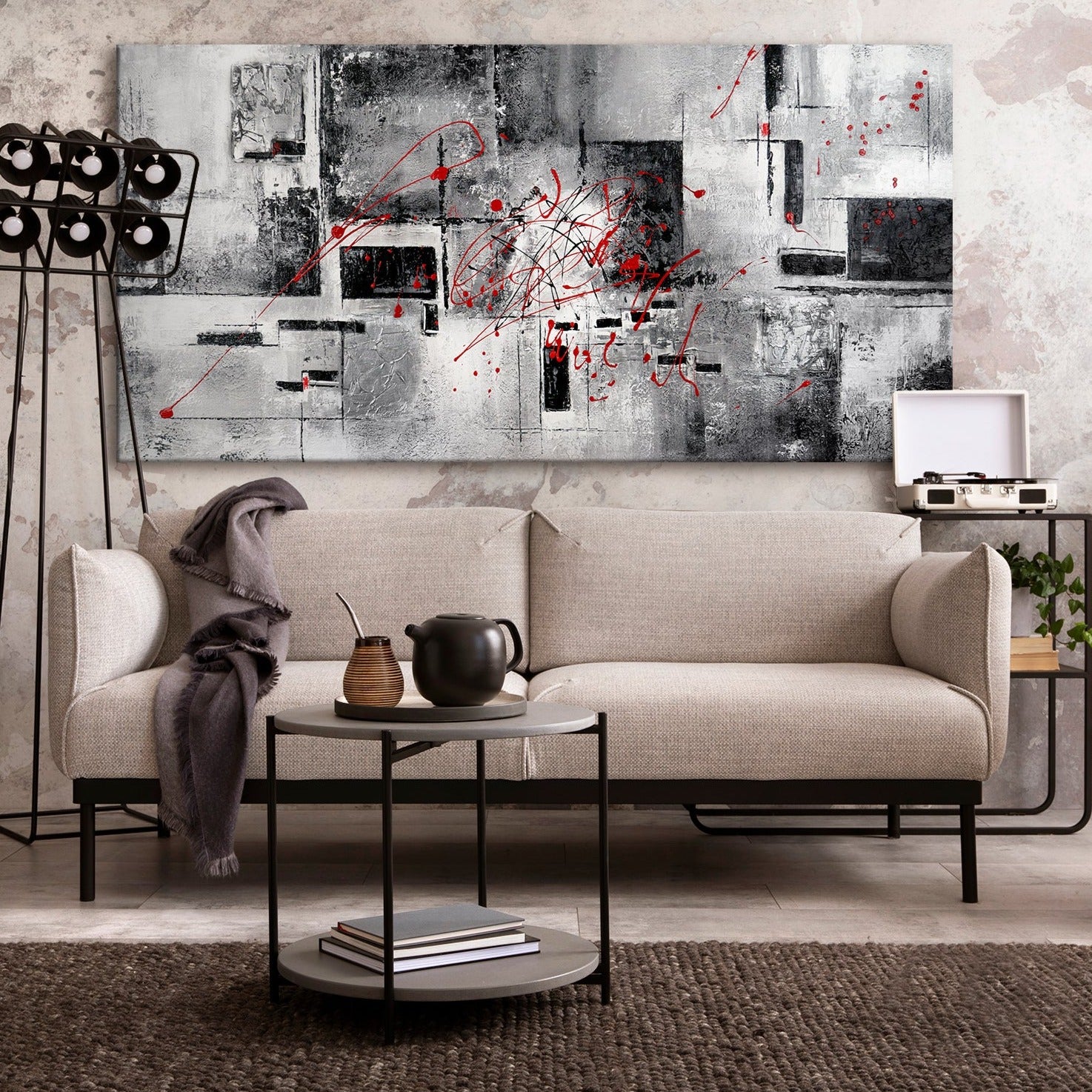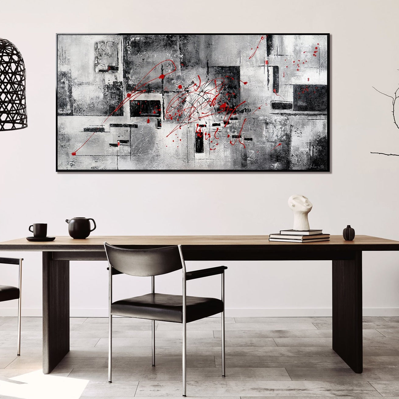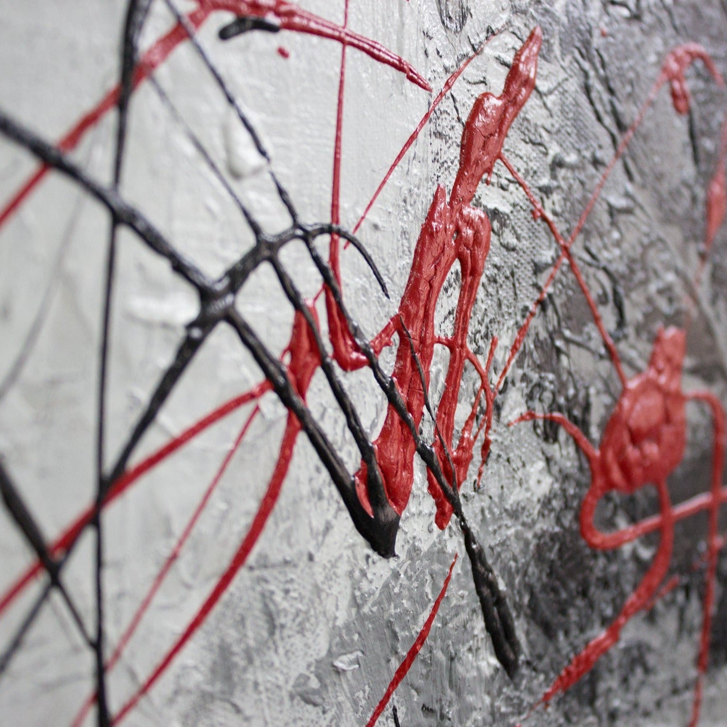 Bringen Sie kreative Energie und künstlerische Eleganz in Ihr Zuhause mit diesem beeindruckenden abstrakten Gemälde. Die dynamischen Linien und kräftigen roten Akzente auf einem kontrastreichen Hintergrund aus Schwarz, Weiß und Grau machen dieses Kunstwerk zu einem unverwechselbaren Blickfang. Ideal für moderne Wohnräume, Büros und Galerien.