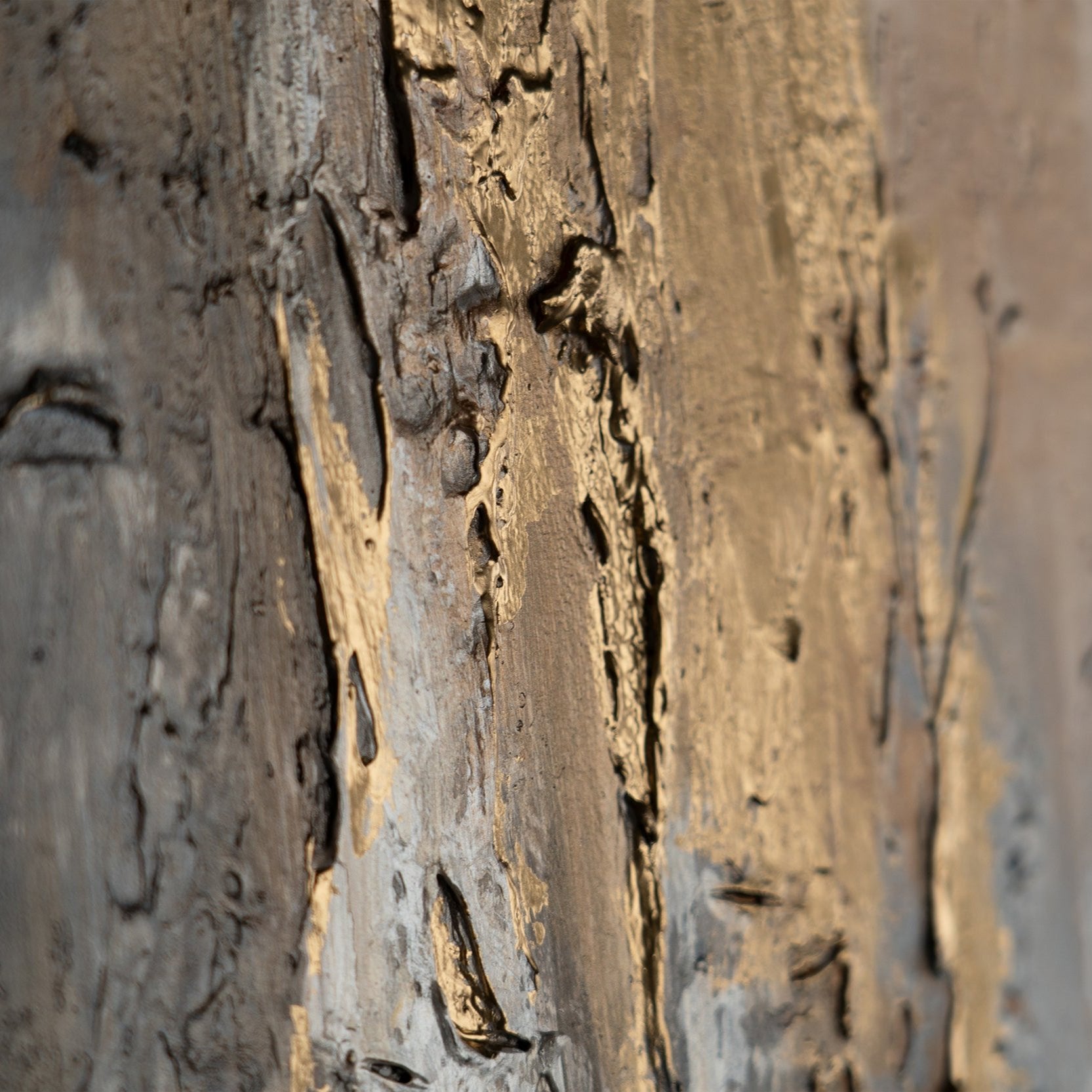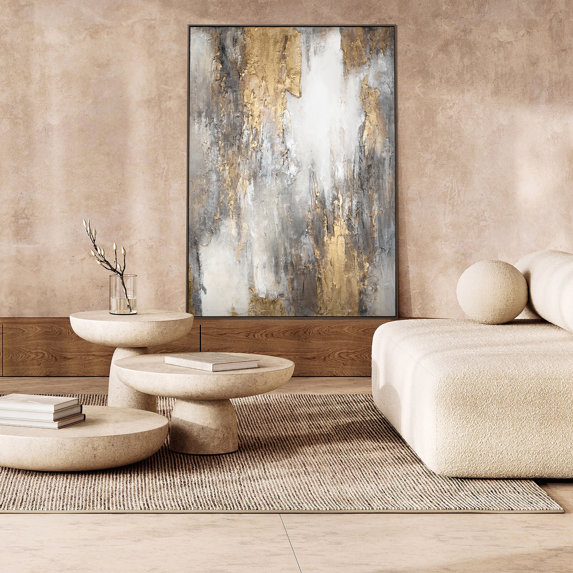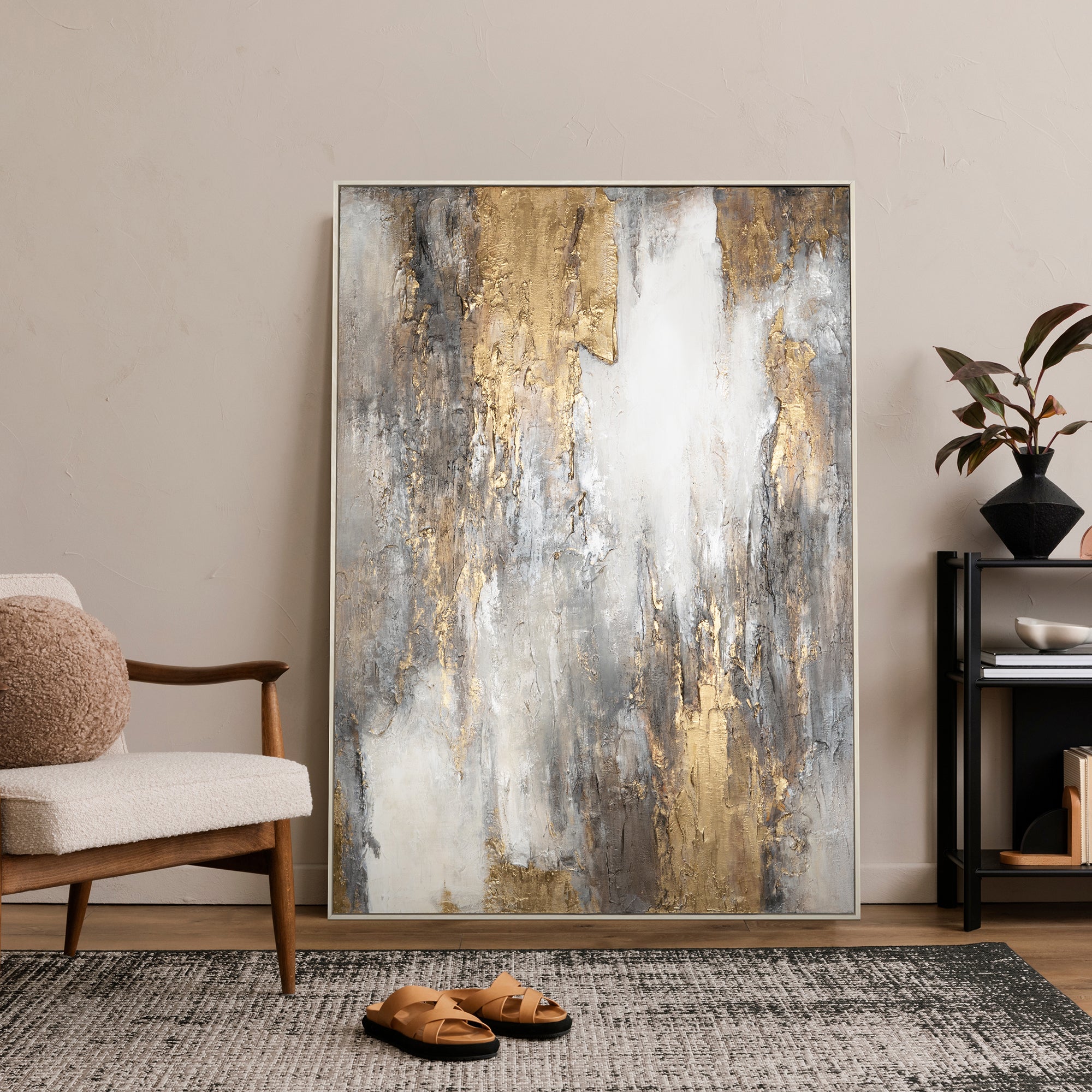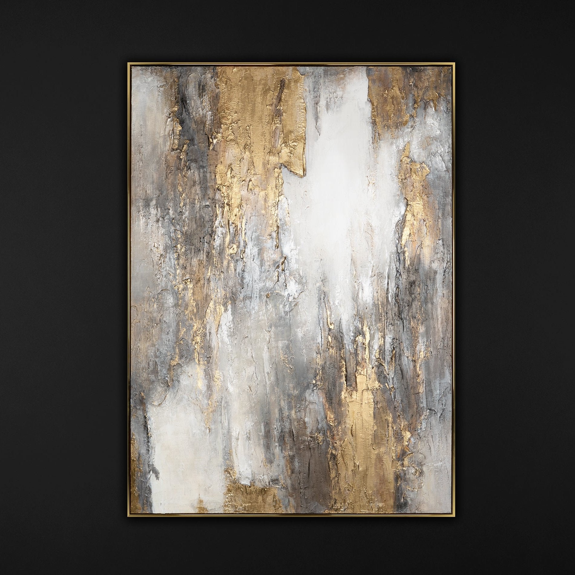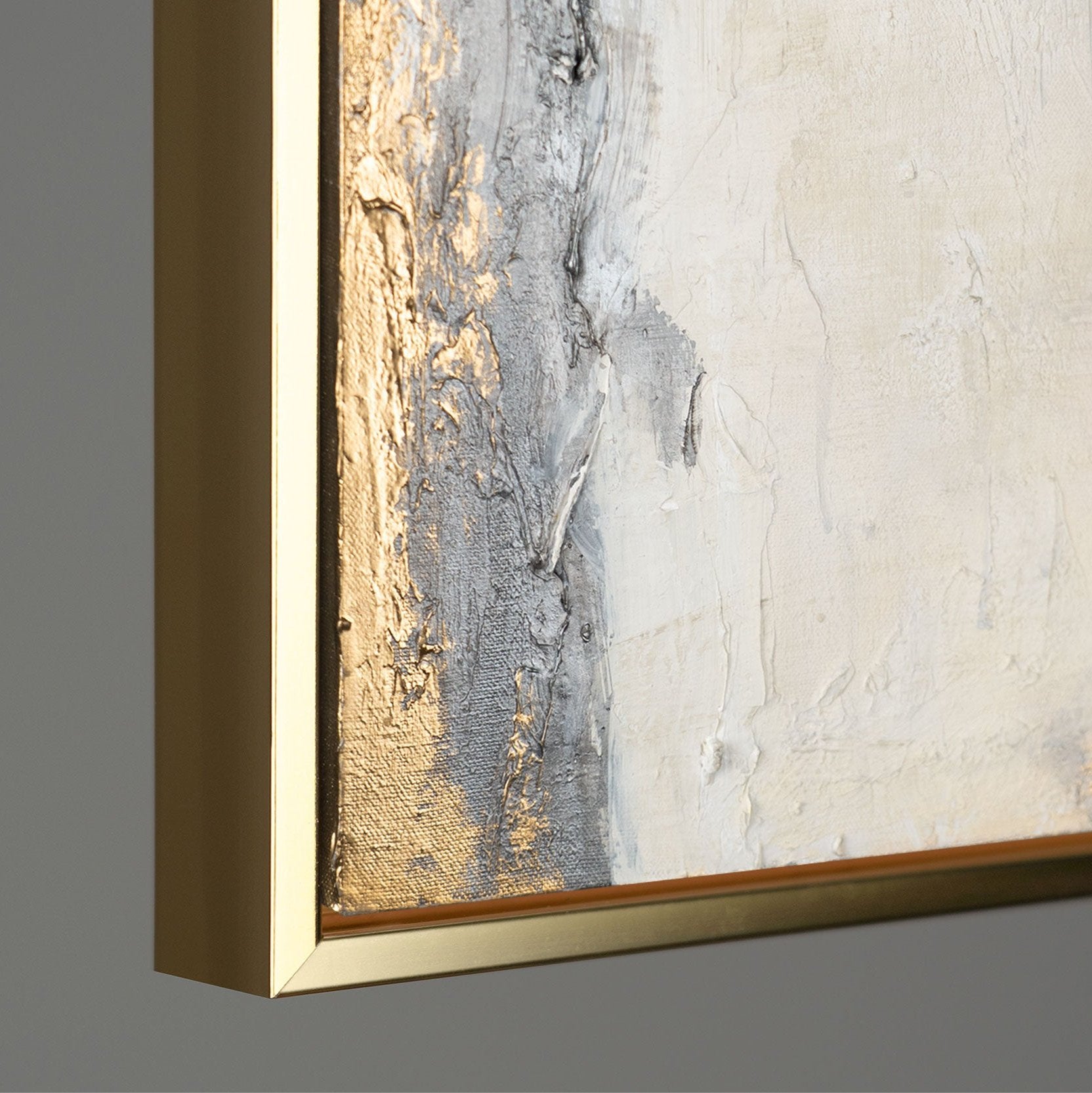 'Elegante Reflexion' ist ein ausdrucksstarkes abstraktes Kunstwerk, das durch seine subtilen Grau- und Cremetöne mit auffälligen Goldakzenten besticht.