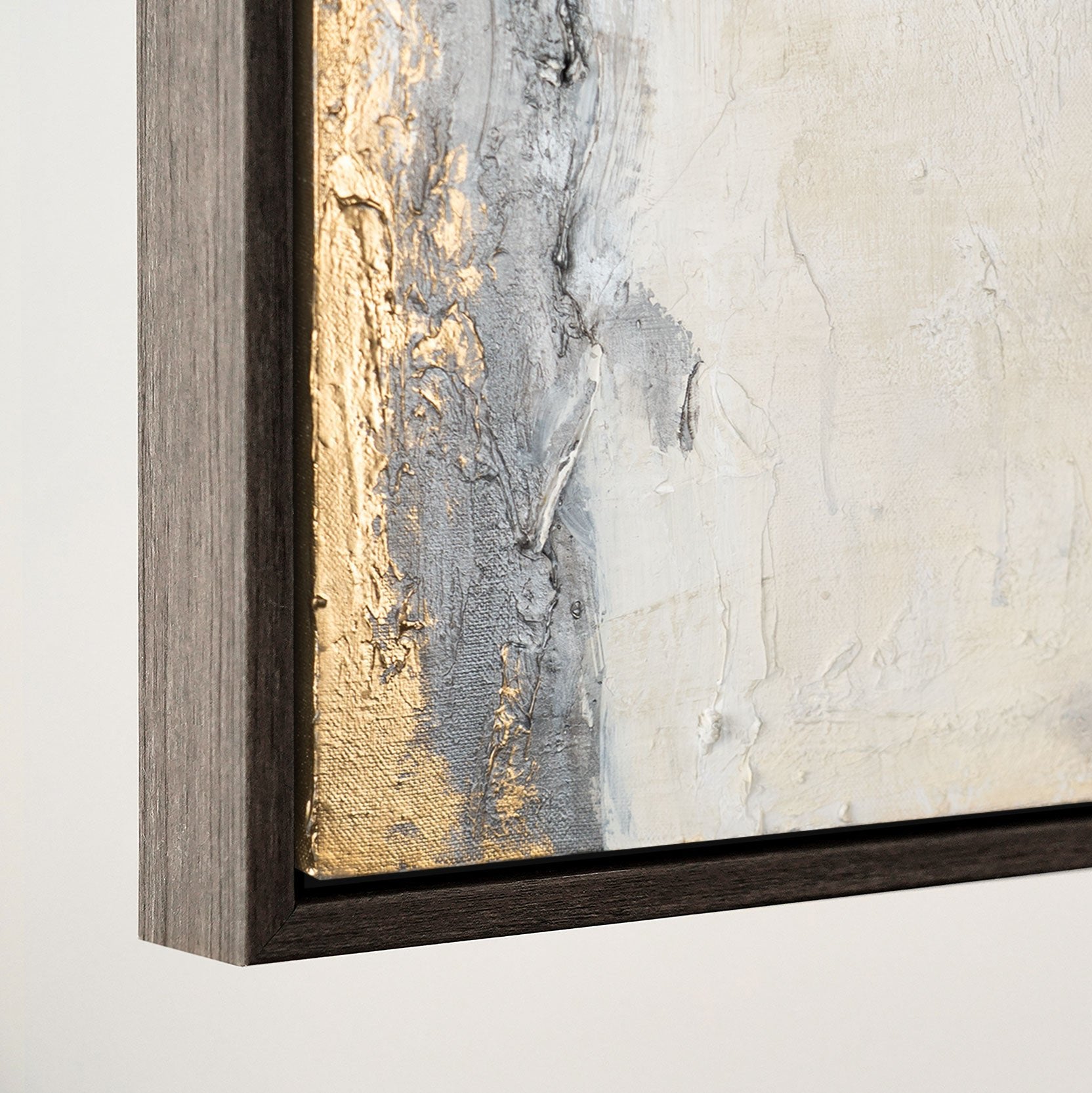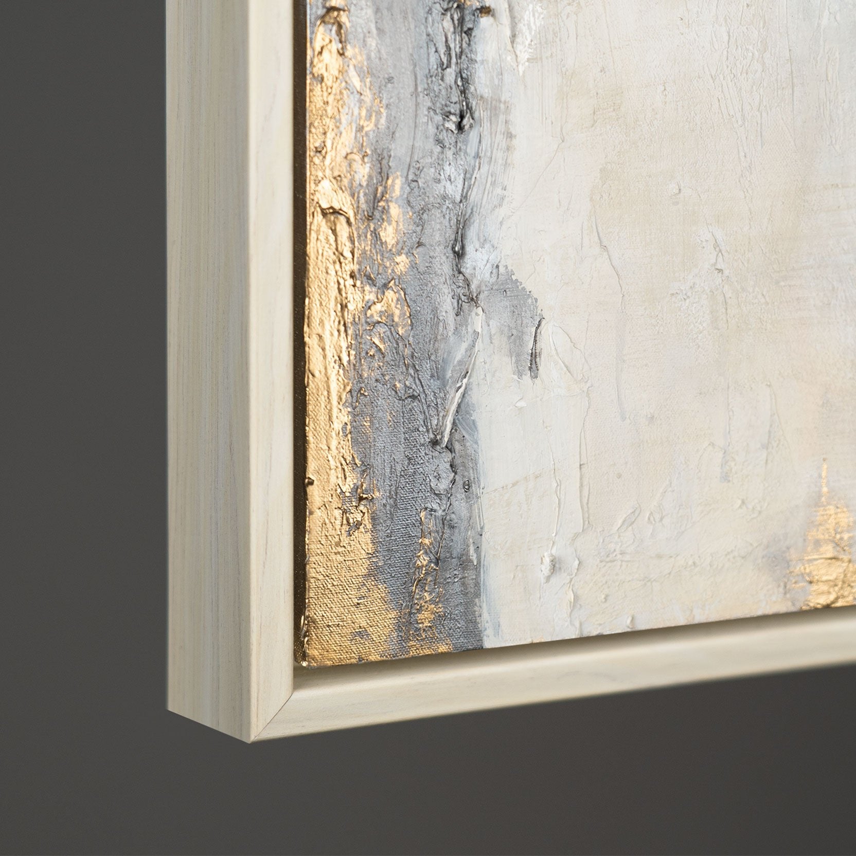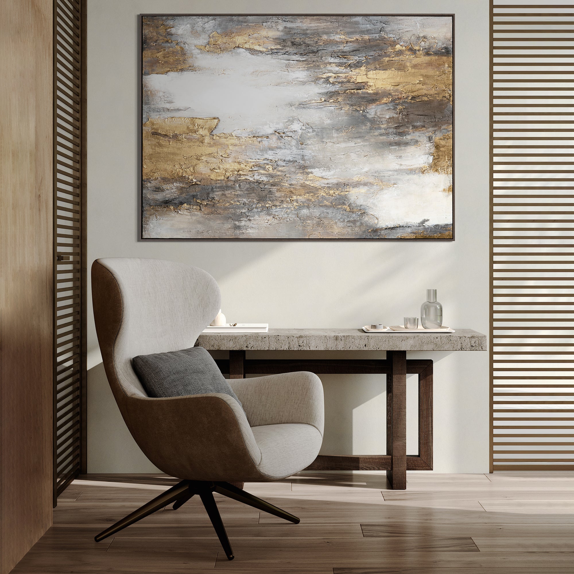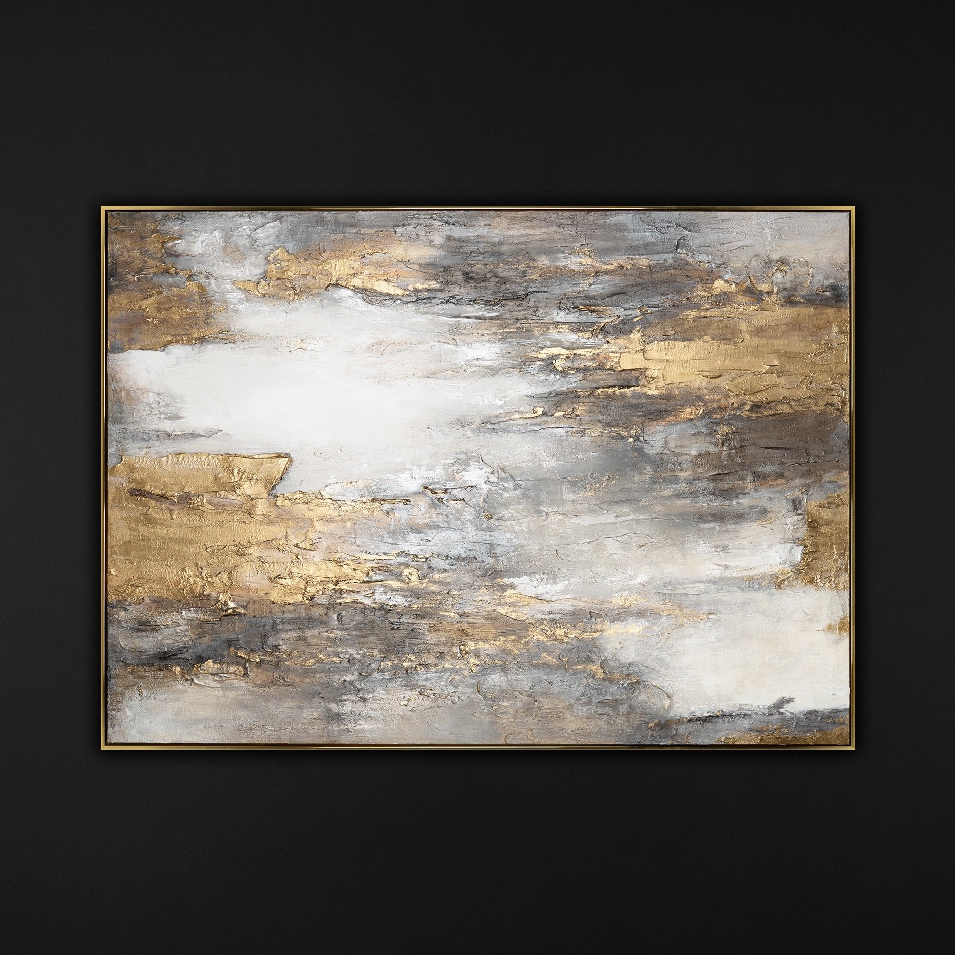 'Elegante Reflexion' ist ein ausdrucksstarkes abstraktes Kunstwerk, das durch seine subtilen Grau- und Cremetöne mit auffälligen Goldakzenten besticht.
