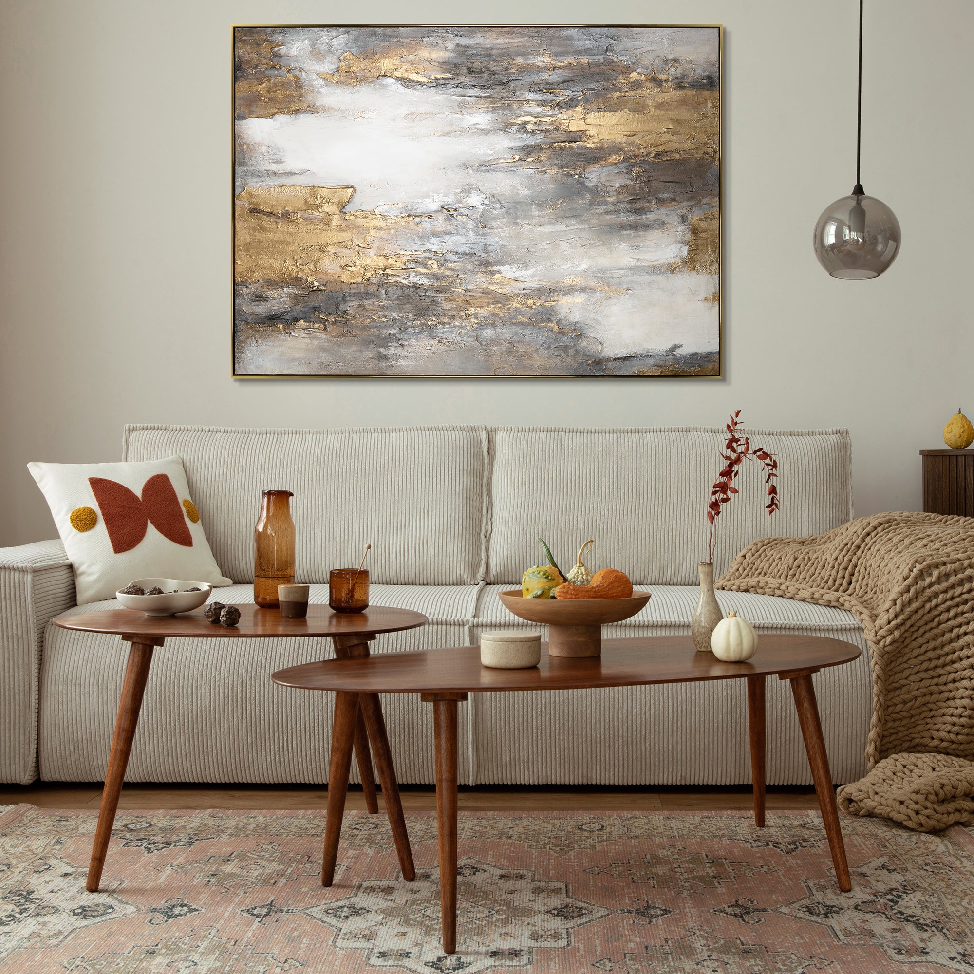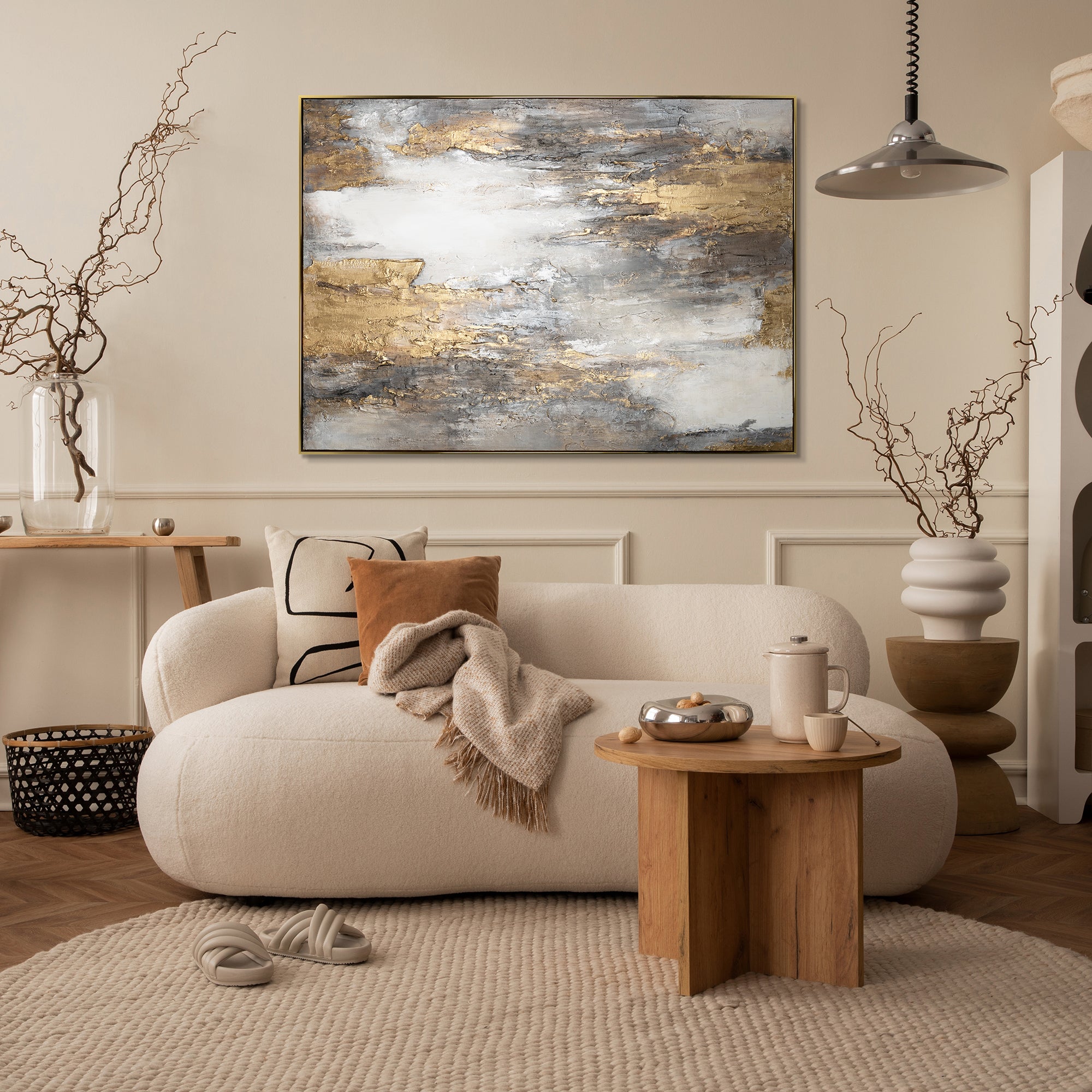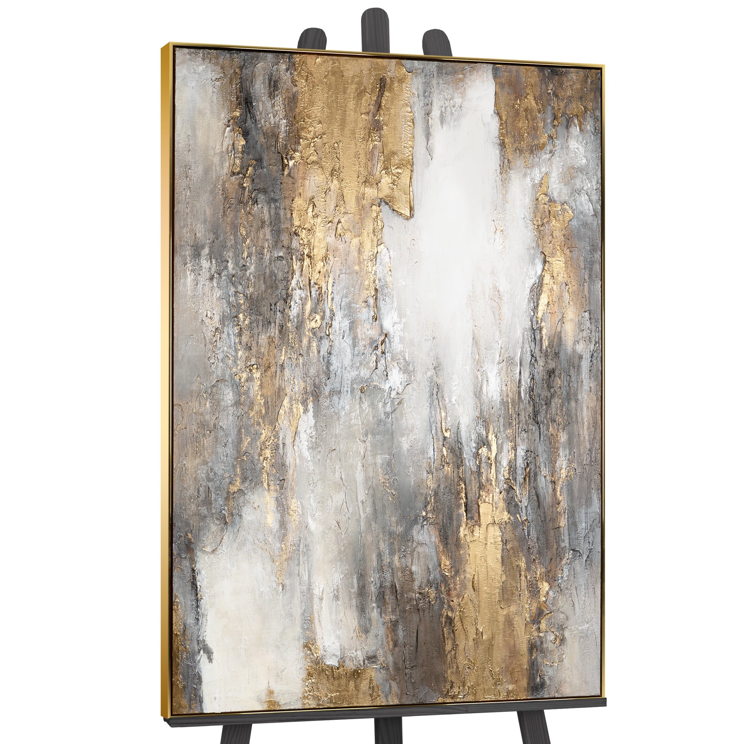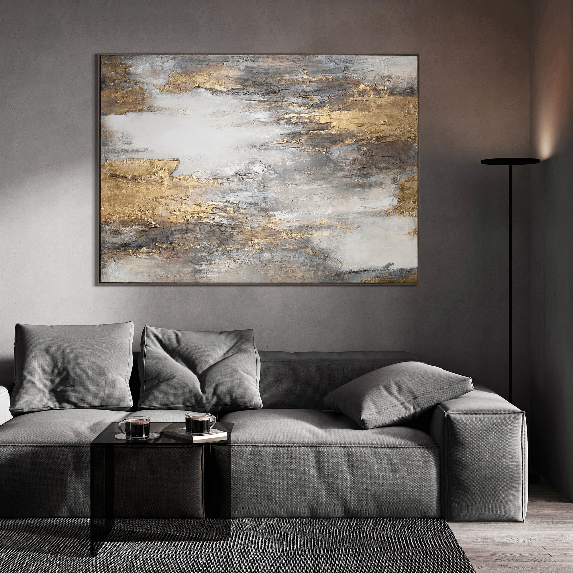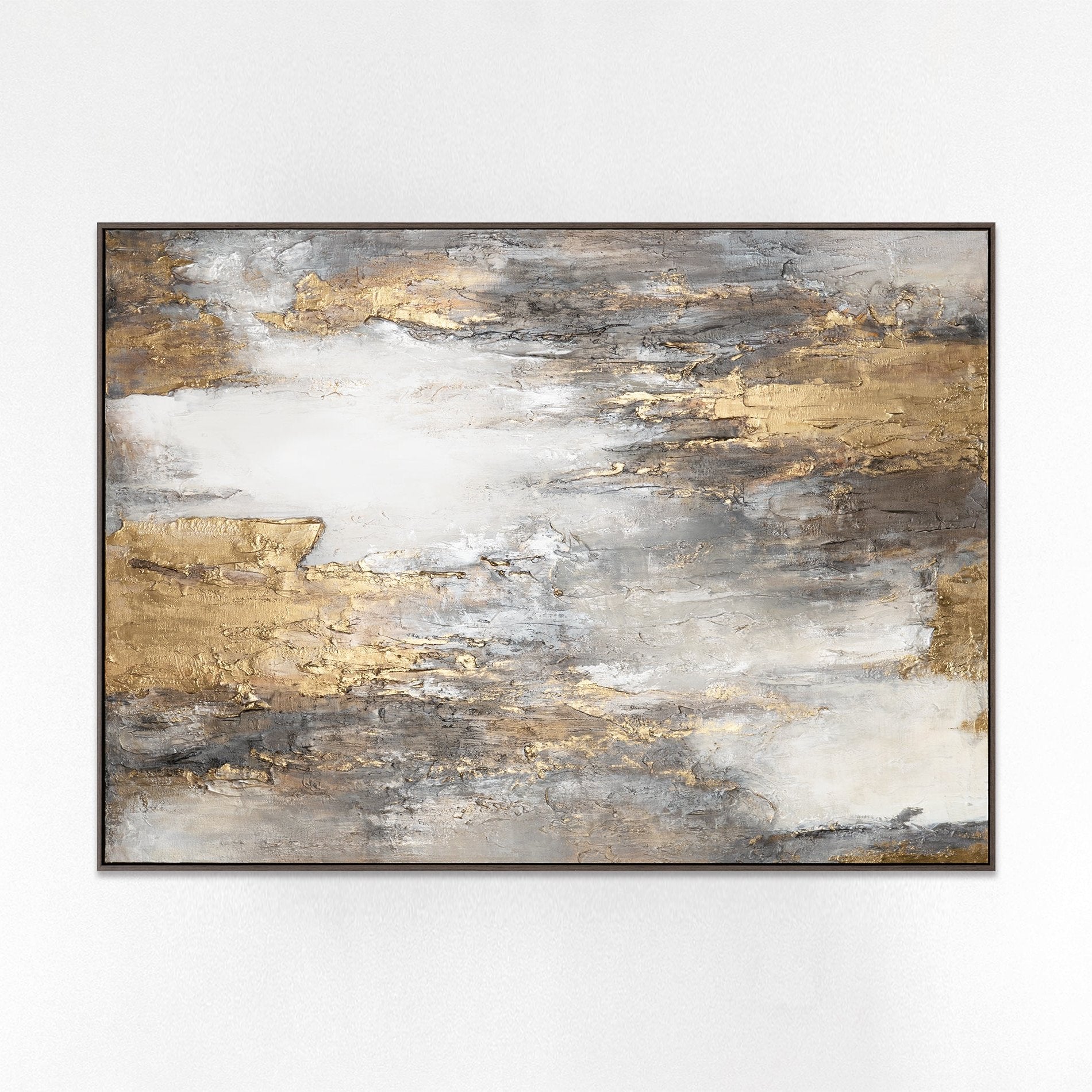 'Elegante Reflexion' ist ein ausdrucksstarkes abstraktes Kunstwerk, das durch seine subtilen Grau- und Cremetöne mit auffälligen Goldakzenten besticht.