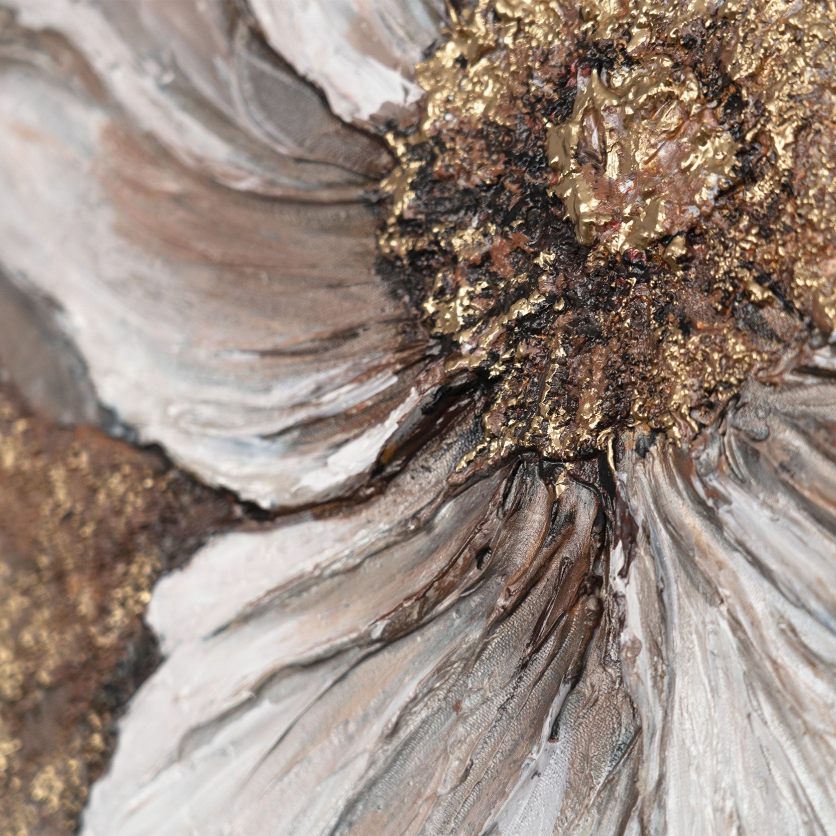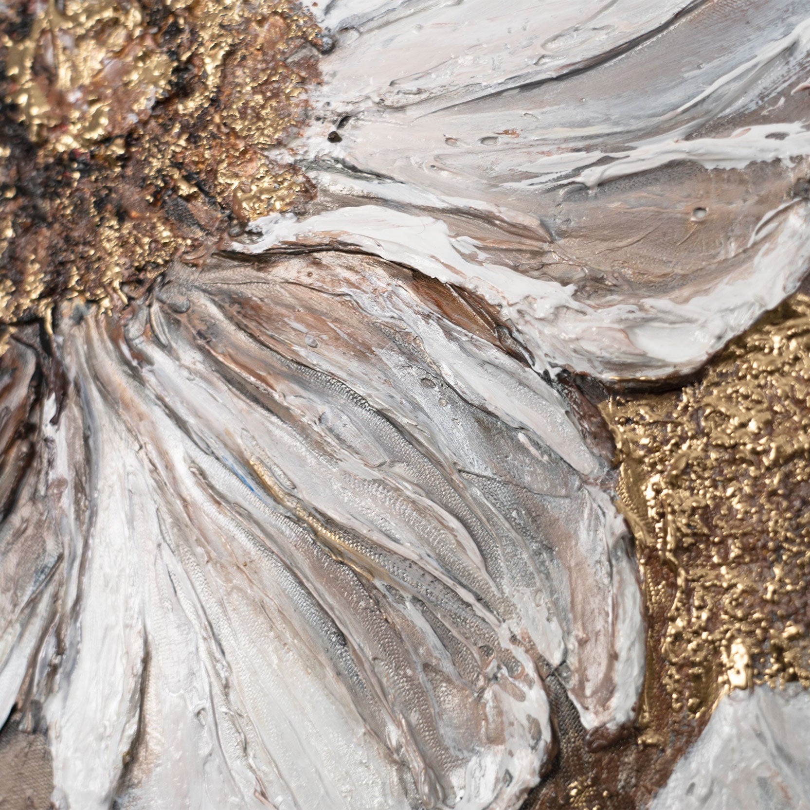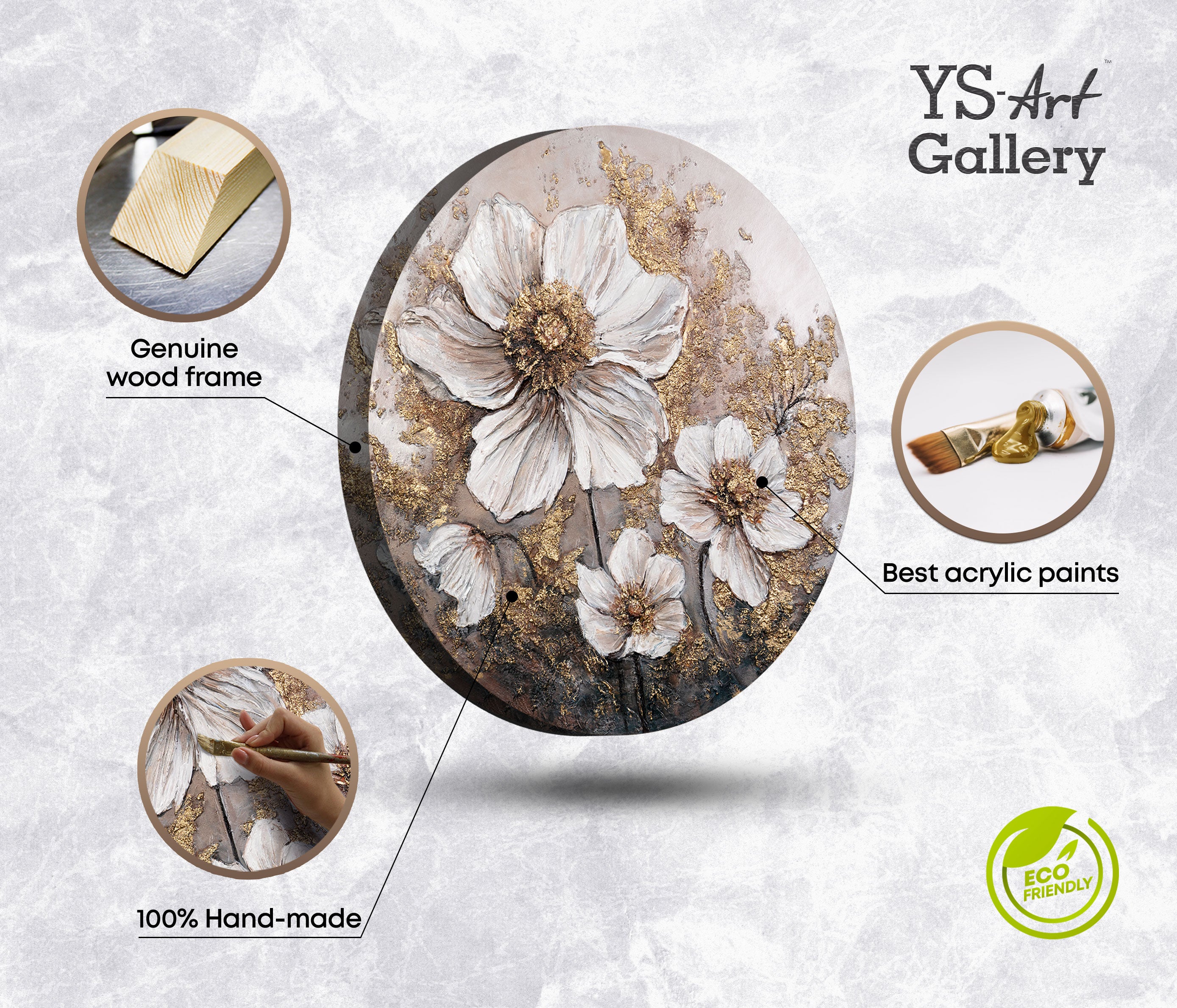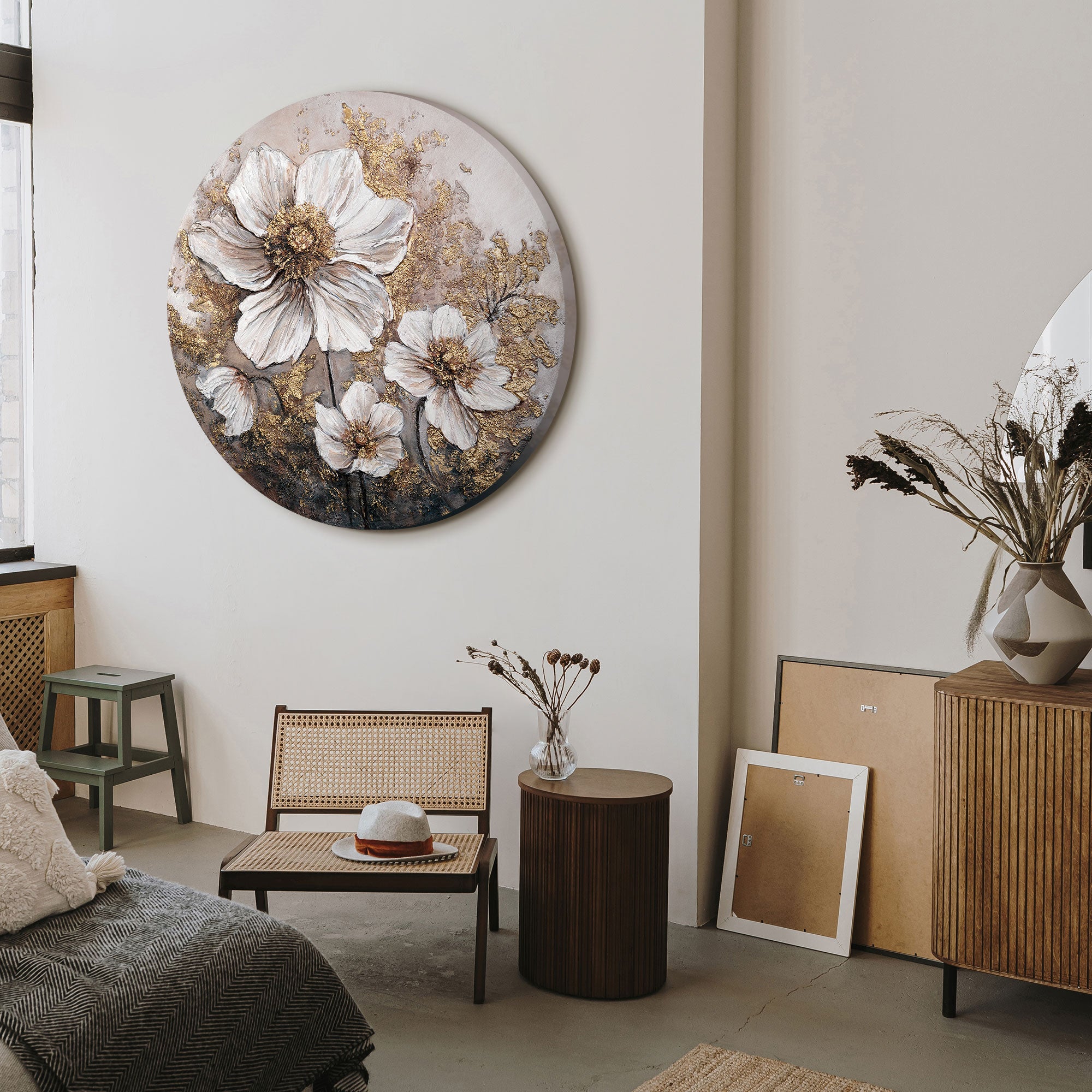 Das Acrylgemälde „Das Glühen der Knospen“ zeigt eine florale Komposition auf runder Leinwand – zarte Blüten in Weiß und Beige, umgeben von glänzenden Golddetails. Die strukturierte Oberfläche verleiht dem Kunstwerk Tiefe und ein taktiles Erlebnis.