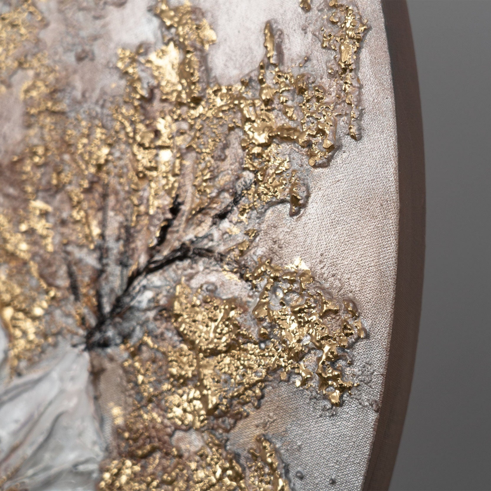 Diese handgemalte runde Wandkunst bringt einen Hauch von Eleganz und Natur in moderne oder klassische Interieurs. Erhältlich in 5 Größen, ist es perfekt als stilvolle Wanddekoration in Wohnzimmer, Schlafzimmer oder Flur.