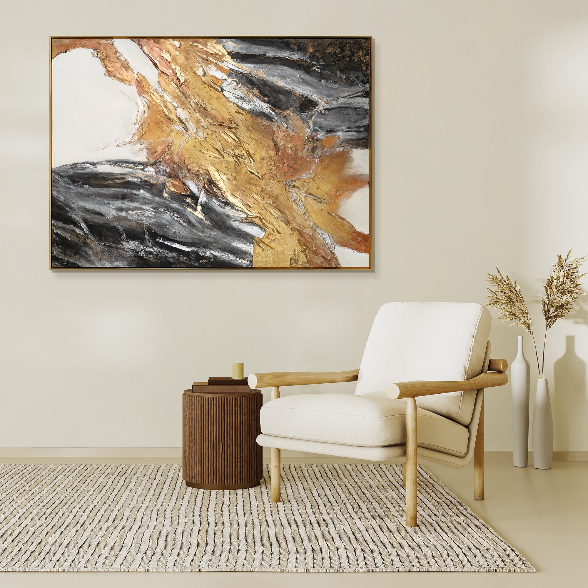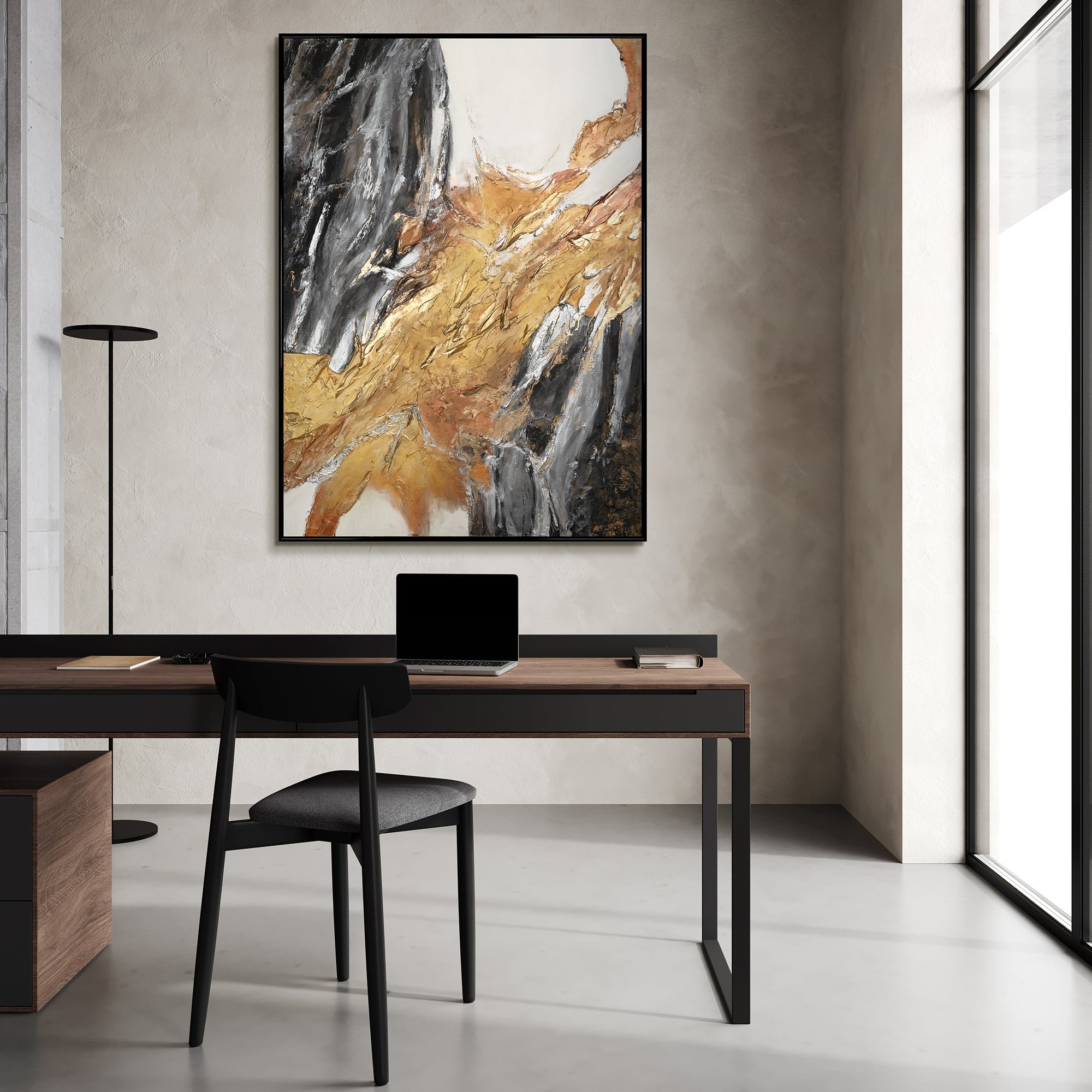 'Goldener Horizont' verführt mit seiner dynamischen Komposition aus kühlen Grautönen und warmen Gold- und Erdtönen. Diese abstrakte Darstellung, handgemalt auf Leinwand, fängt die Essenz natürlicher Landschaften in einer modernen Interpretation ein.