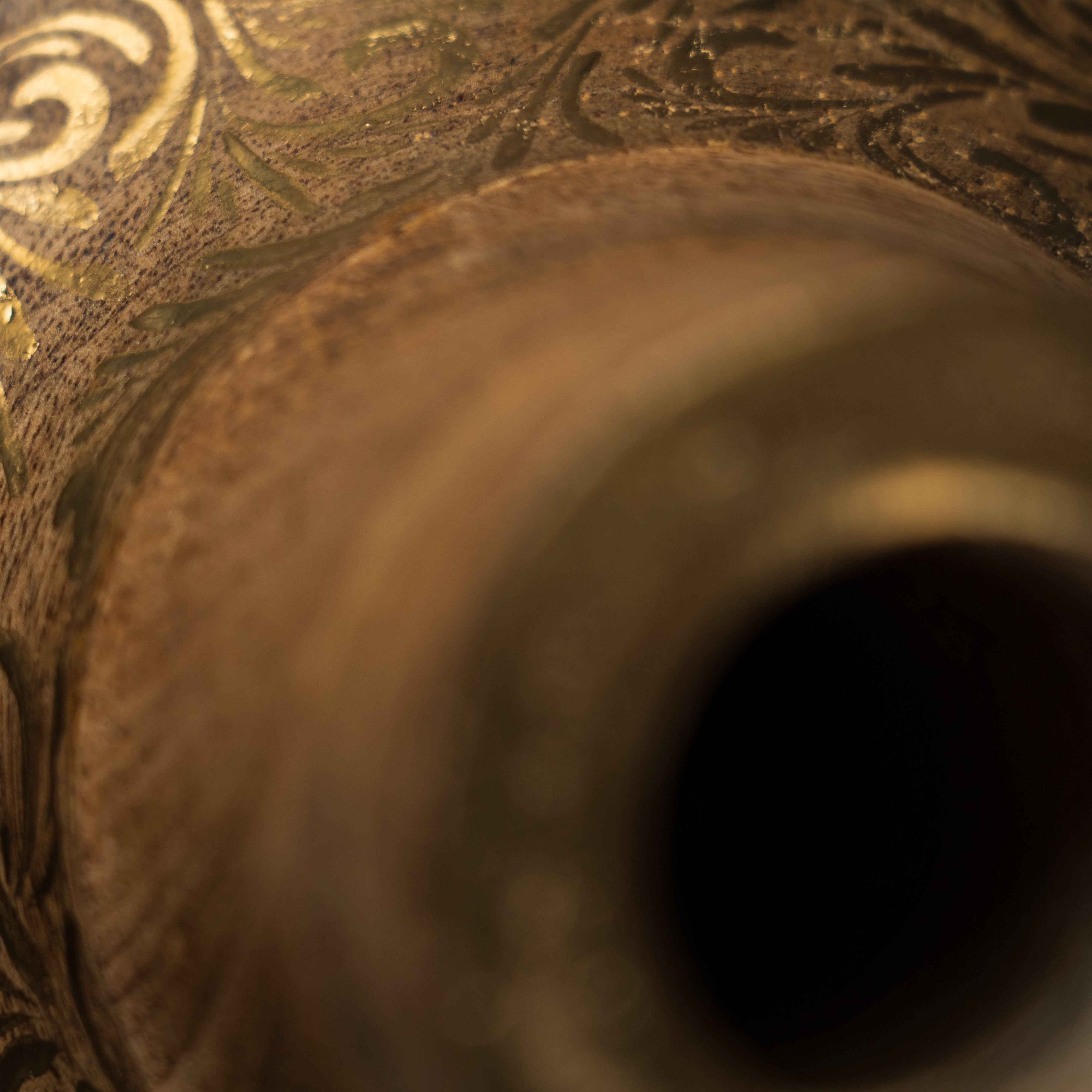 Diese handgefertigte Holzvase vereint die natürliche Wärme des massiven Holzes mit edlen, goldfarbenen Ornamenten. Jeder Unikat-Artikel wird sorgfältig gedrechselt und von Hand verziert – so wird die Vase zum kunstvollen Blickfang in Ihrem Zuhause.