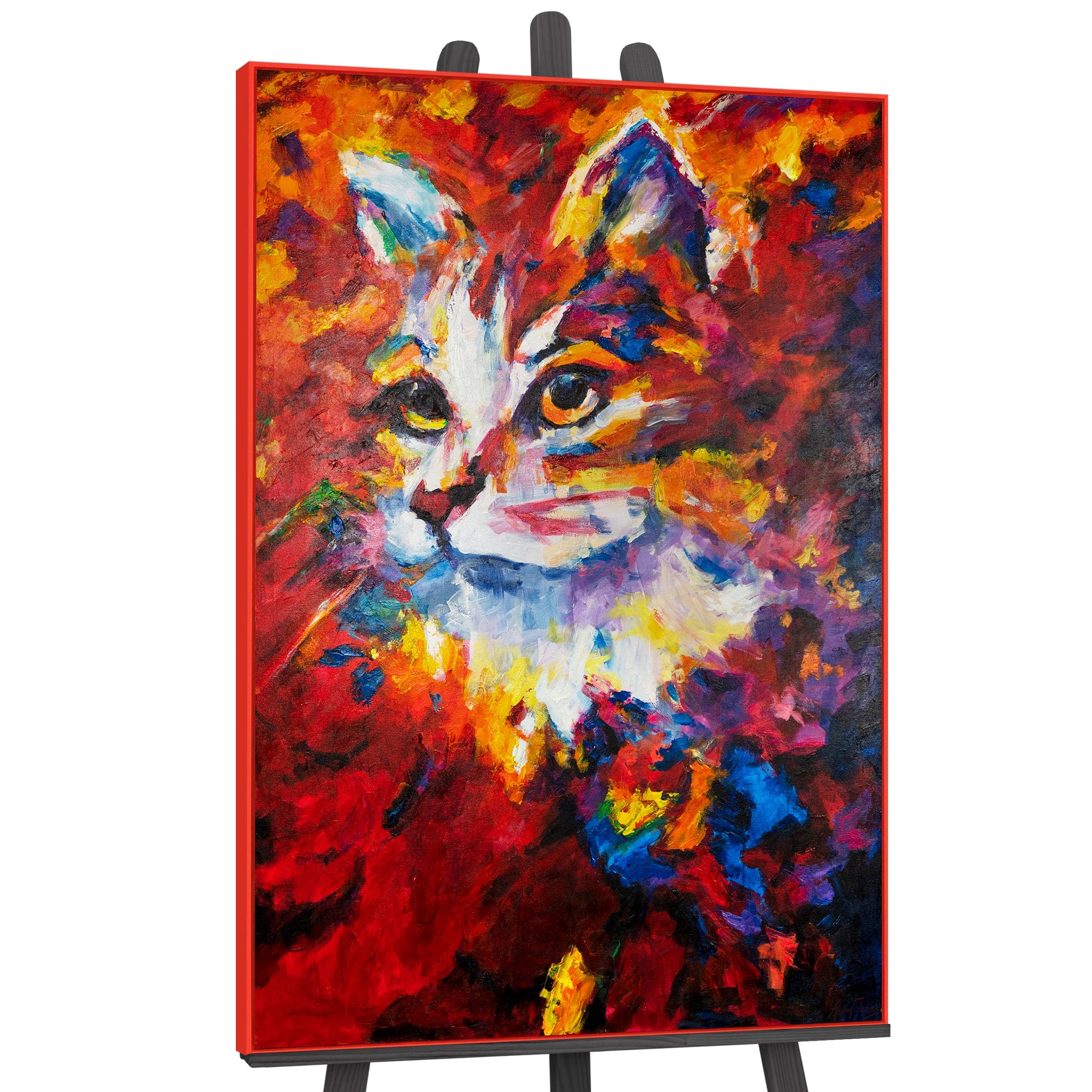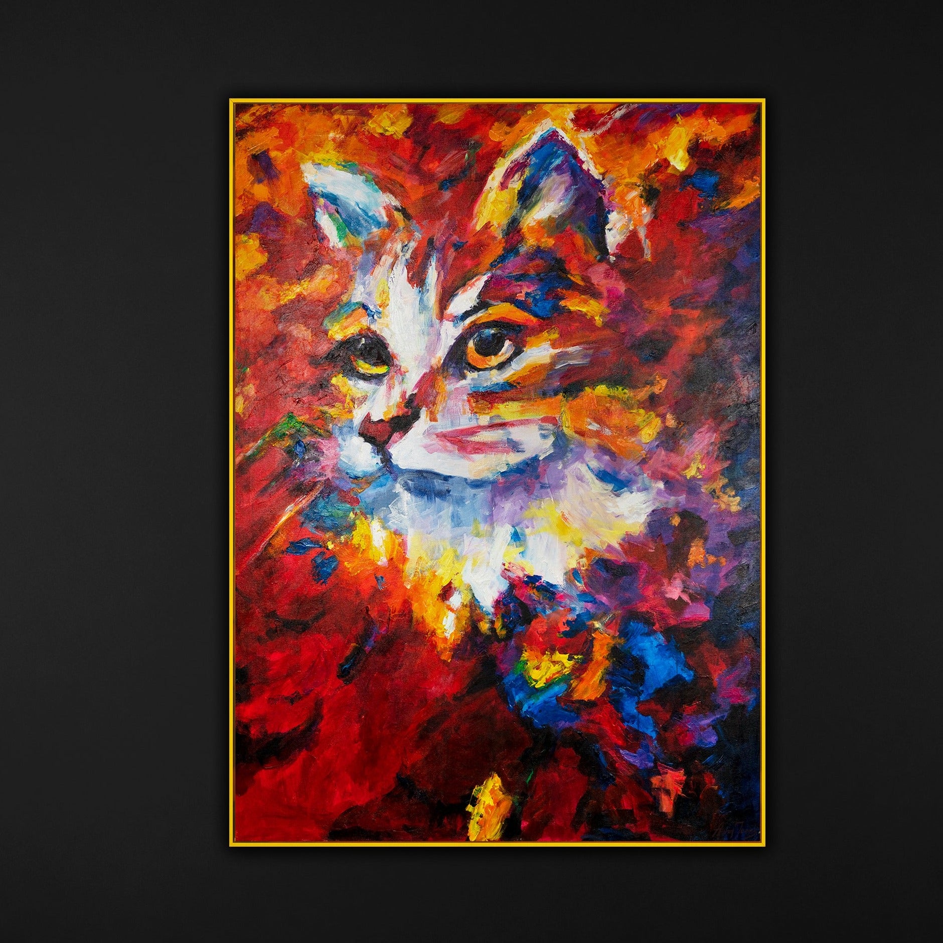 Tauchen Sie ein in die Welt der modernen katzen kunstwerk mit unserem exklusiven Acrylbild der Katze. Jedes Bild in dieser Reihe ist ein handgemaltes Meisterwerk, das mit hochwertigen Acrylfarben auf Leinwand gebracht wurde. Die lebendigen Farben und die beeindruckende Textur geben dem Kunstwerk eine lebensechte Dimension, die jeden Betrachter in ihren Bann zieht. Der solide Rahmen, der das Bild umgibt, verstärkt die Schönheit des Kunstwerks und macht es bereit zum Aufhängen in Ihrem Zuhause oder Büro.