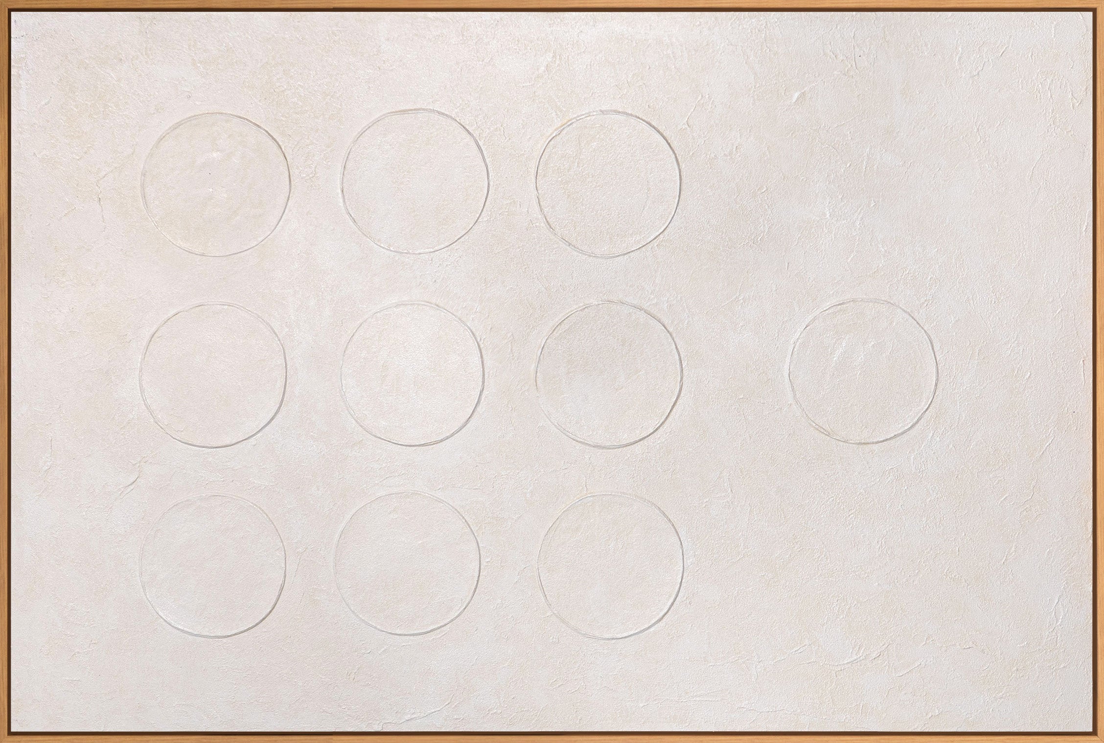 « White Code » est une peinture acrylique abstraite minimaliste qui utilise des formes circulaires subtiles, une texture fine et une palette blanche apaisante. Les reliefs discrets créent profondeur et harmonie sans dominer visuellement l'espace.