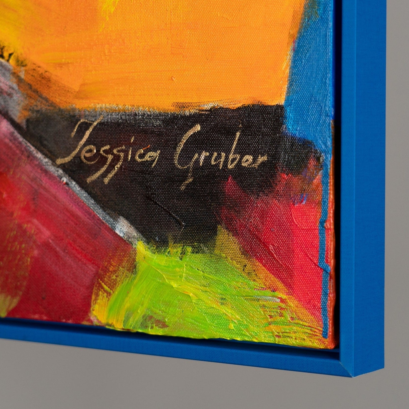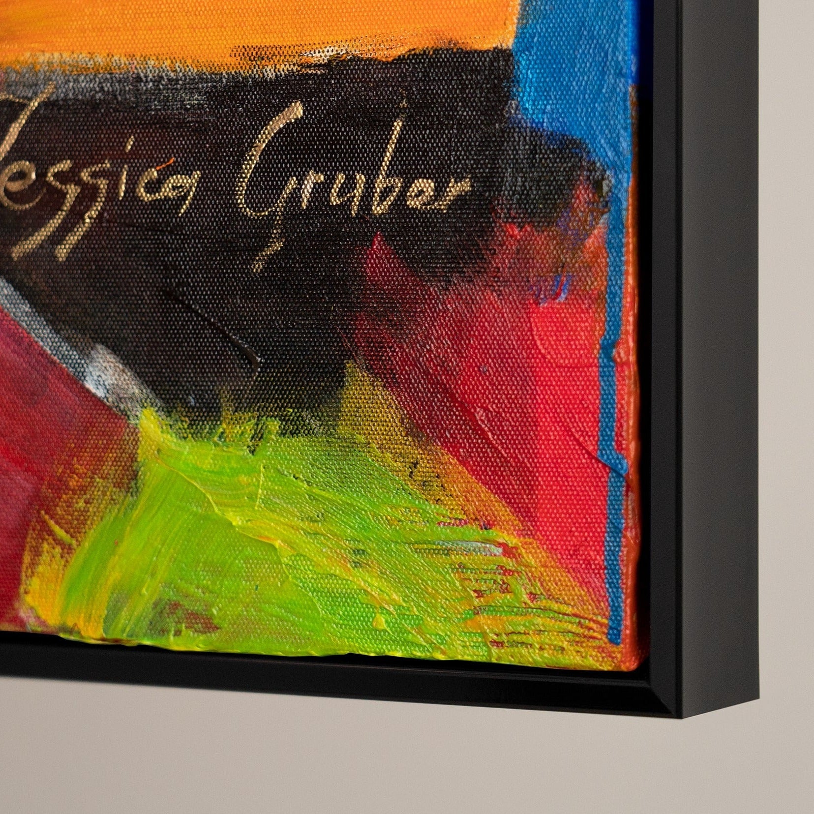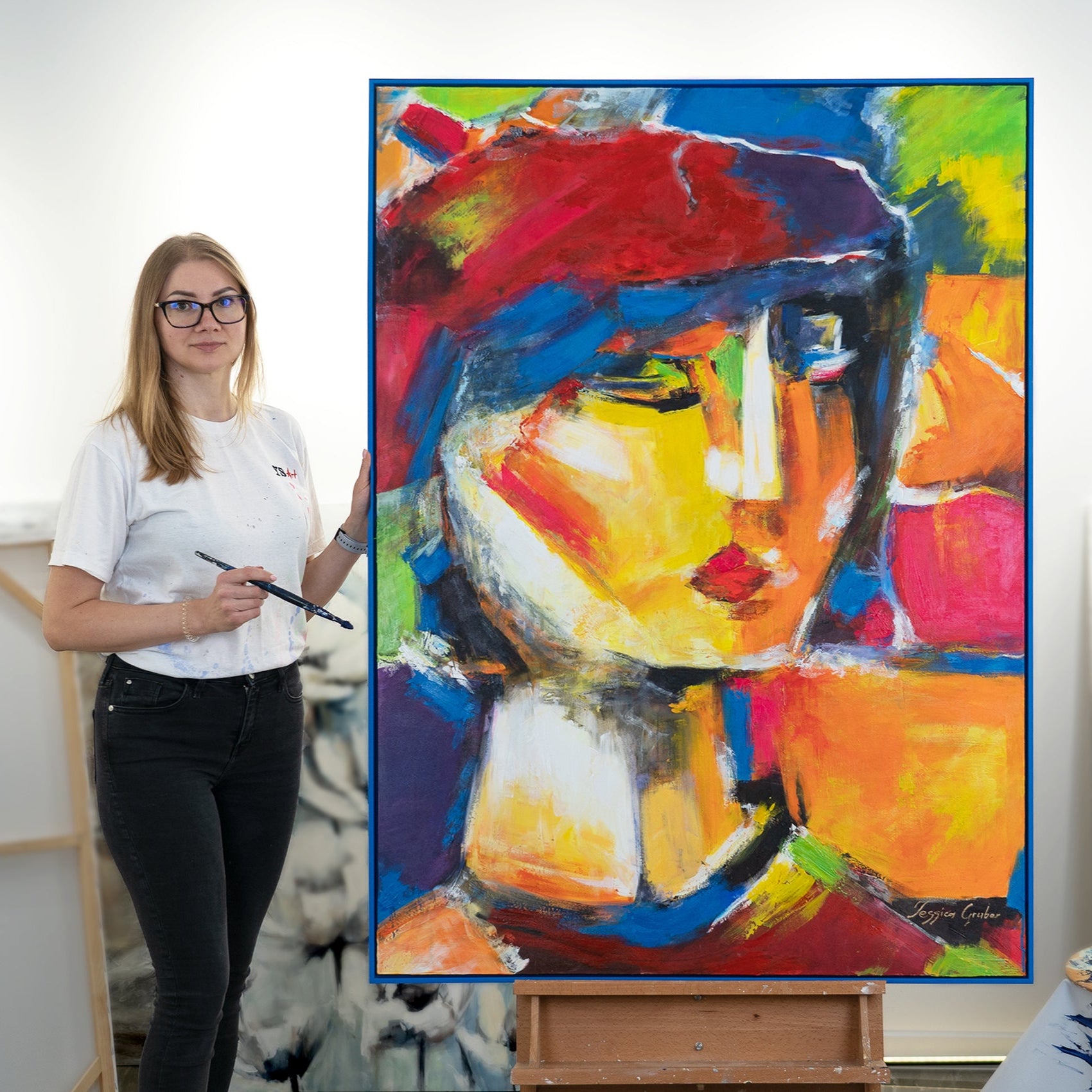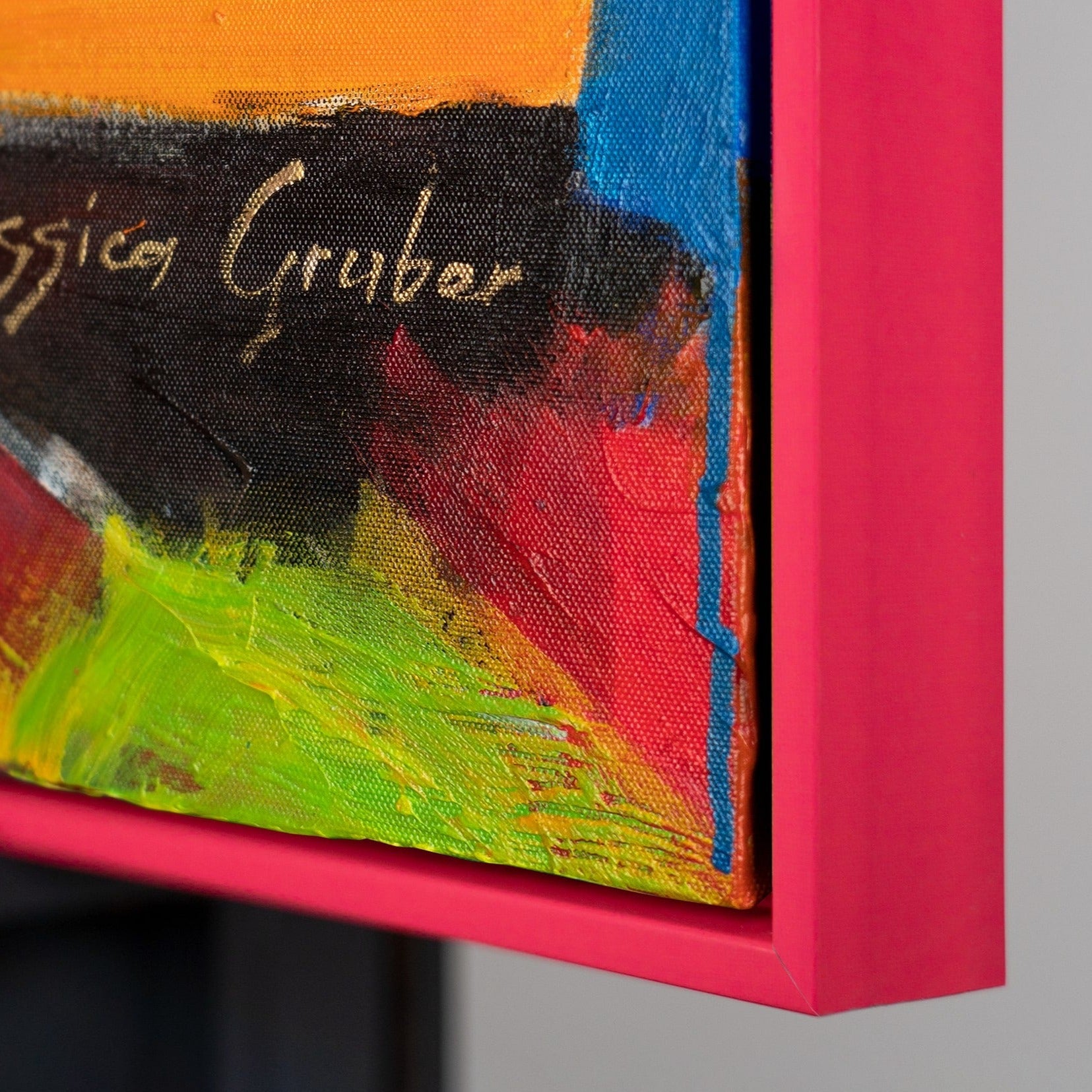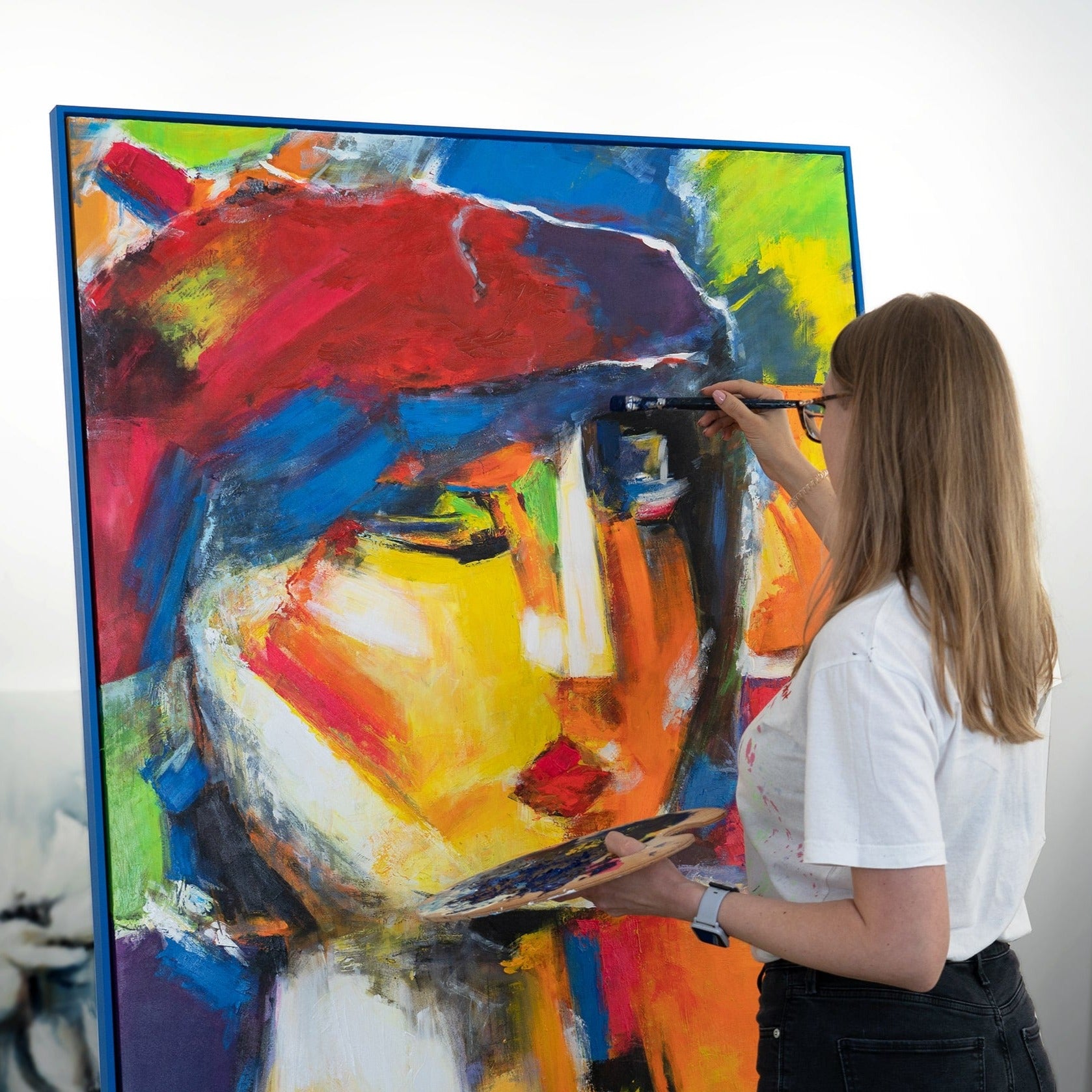 Bereichern Sie Ihr Zuhause mit diesem farbenfrohen, abstrakten Kunstwerk, das ein lebhaftes und farbenfrohes Porträt darstellt. Das Bild besticht durch kräftige Farbtöne und dynamische Pinselstriche. Es ist 100% handgemalt und wird durch einen eleganten Rahmen hervorgehoben.