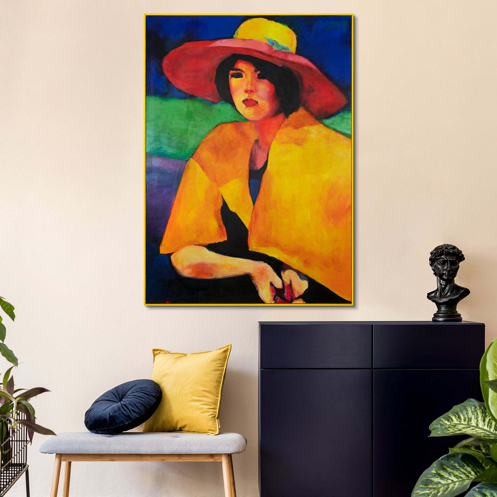 Das handgemalte Acrylbild „Frau mit Hut“ bringt die Lebendigkeit abstrakter Kunst in Ihr Zuhause. In kräftigen Farben dargestellt, fängt es den Ausdruck und die Eleganz einer Frau in einer modernen Interpretation ein.