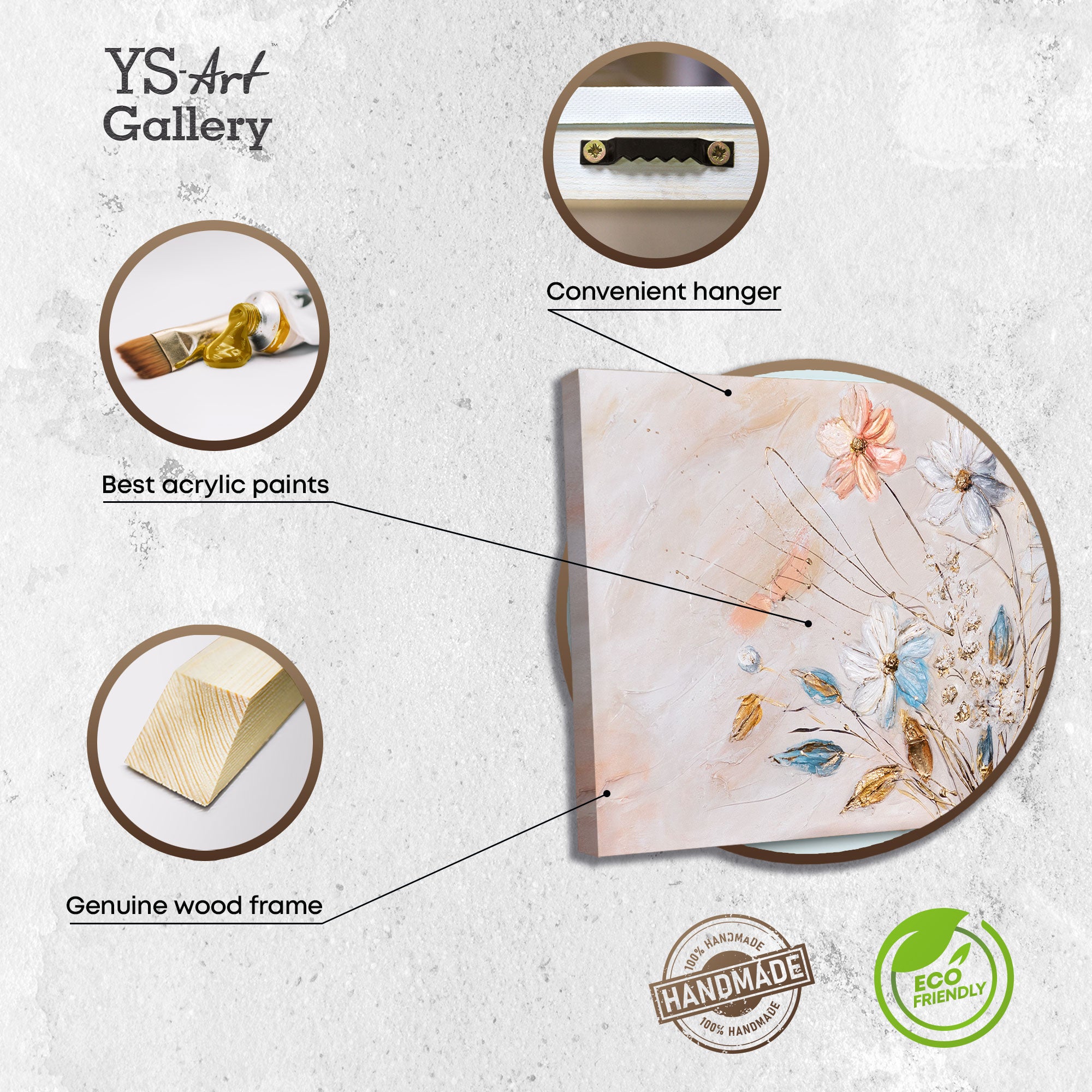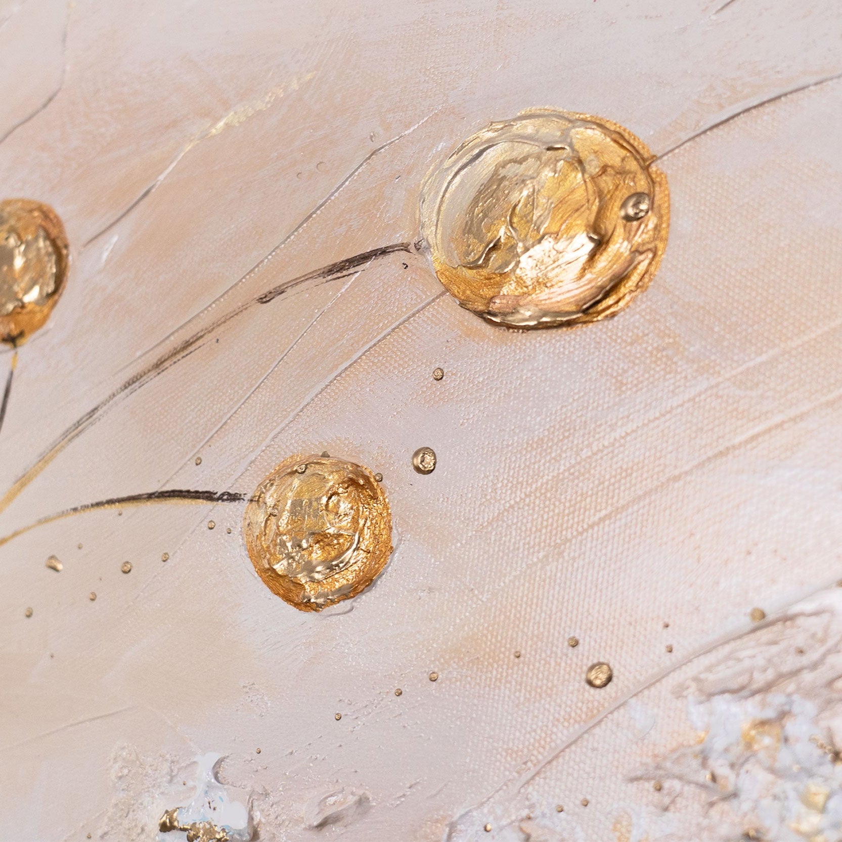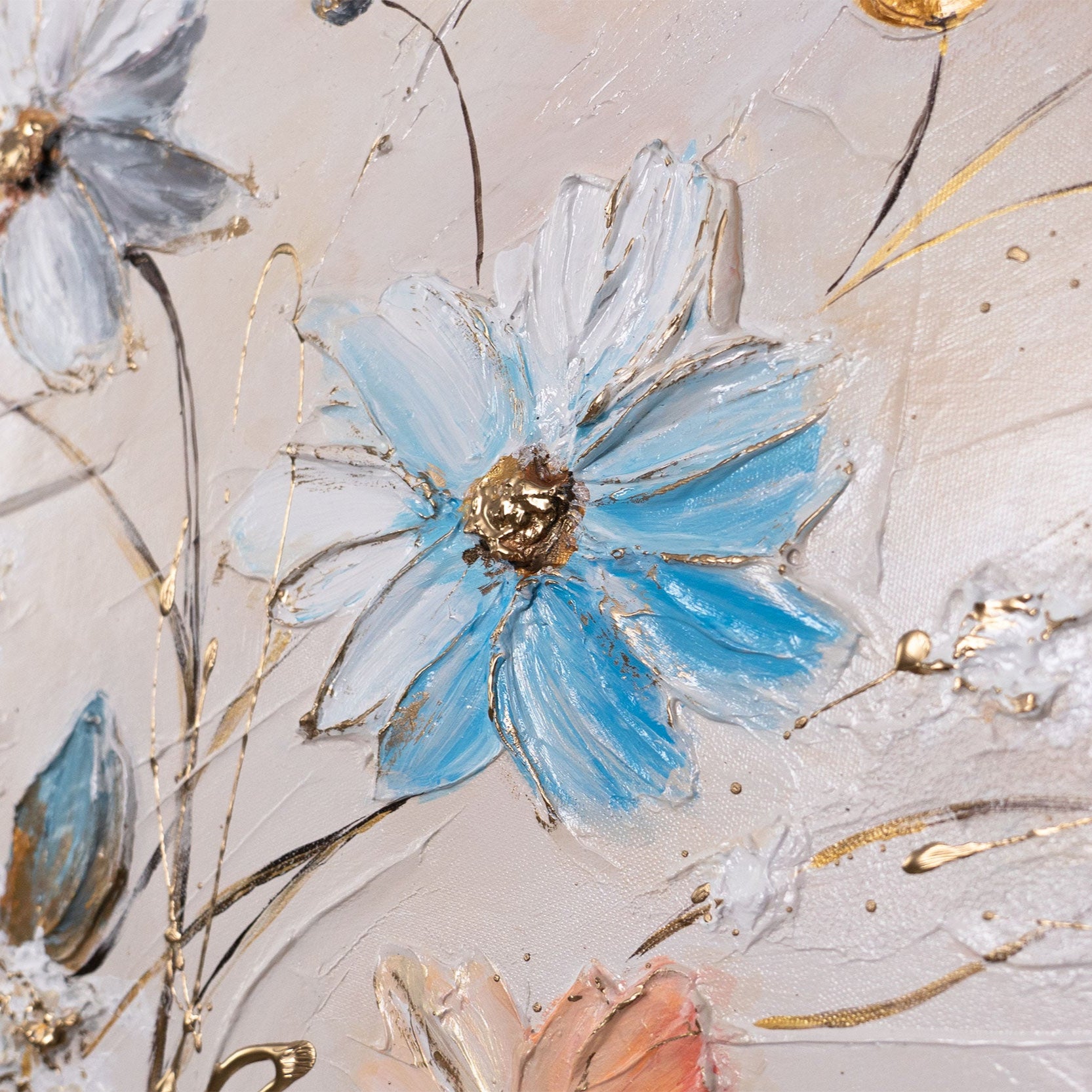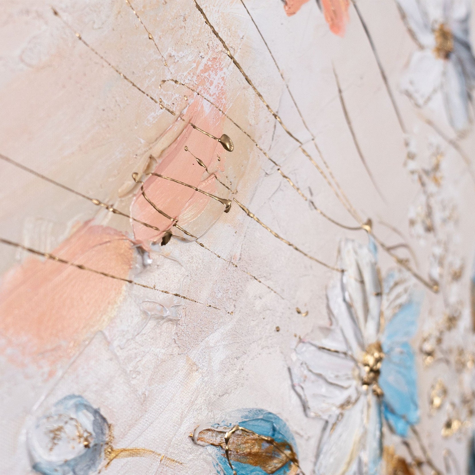 „Sonnige Blumen“ ist ein handgemaltes Acrylbild mit floralen Elementen in sanften Pastellfarben und goldenen Akzenten. Die strukturierte Oberfläche und die feinen Pinselstriche verleihen dem Kunstwerk Tiefe und eine besondere Lebendigkeit. Zarte Blüten in Rosa, Blau und Weiß wirken wie ein luftig-leichtes Bouquet auf ruhigem Untergrund.