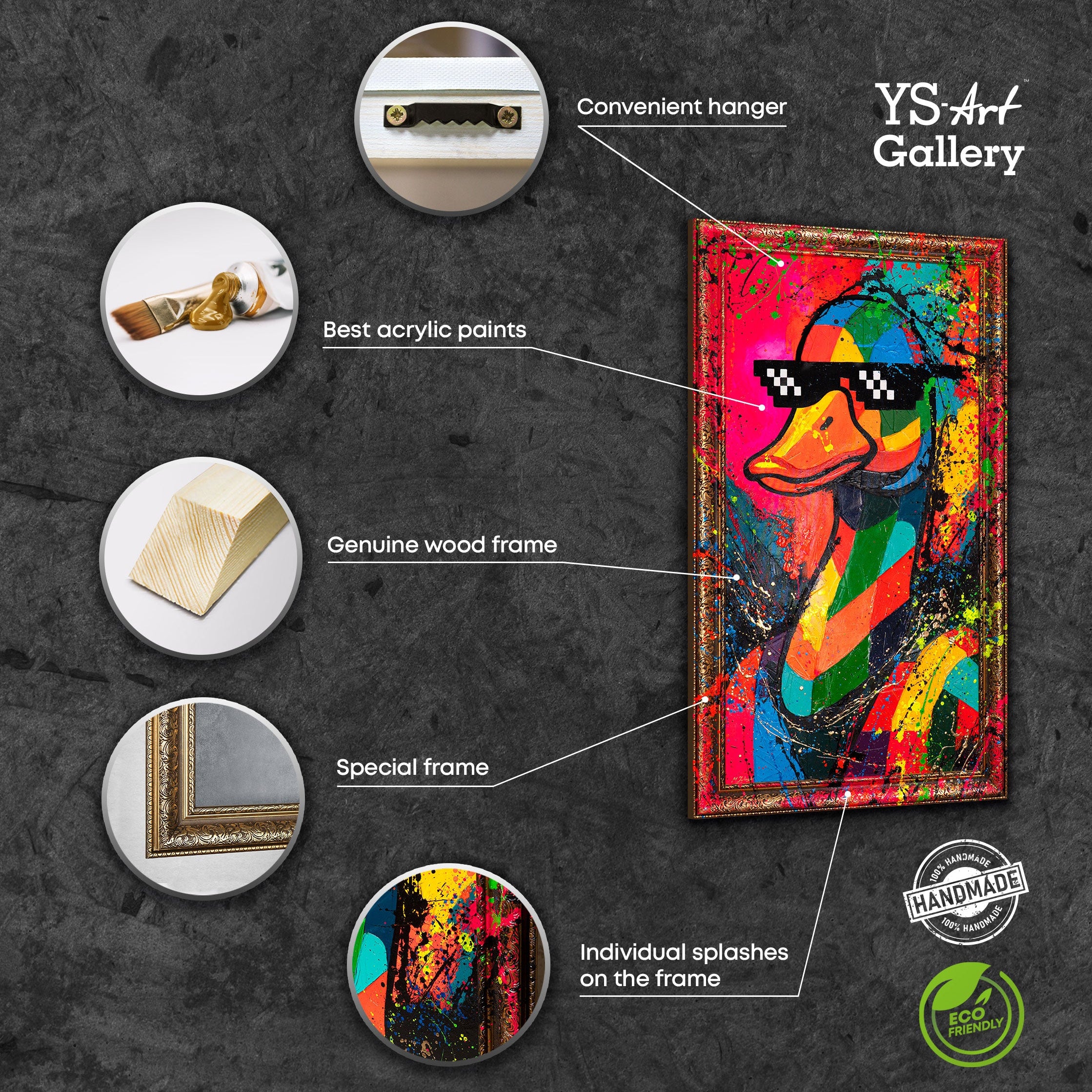 Dieses farbenfrohe Leinwandbild ist ein echtes Statement: Ein Pop-Art-Entchen mit ikonischer Sonnenbrille in leuchtenden Farben, umgeben von energiegeladenen Spritzern. Jeder Pinselstrich ist handgemalt und macht das Werk zu einem absoluten Unikat – voller Humor, Mut und urbanem Lifestyle.