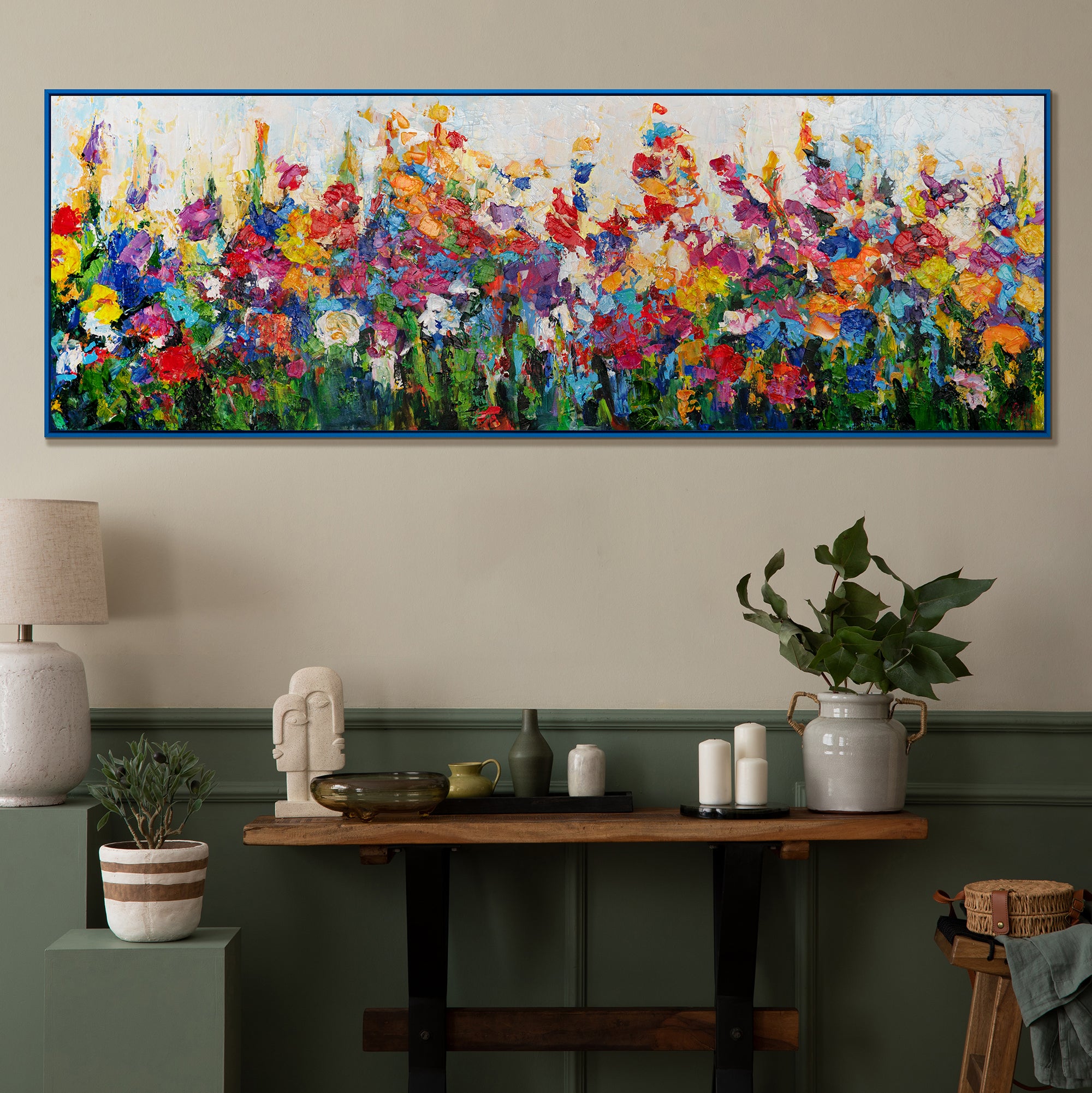 Ein ausdrucksstarkes Leinwandbild, das mit einem dichten Wirbel aus Farben, Formen und floraler Abstraktion fasziniert. „Wirbelwind der Feldfarben“ versprüht eine energiegeladene Dynamik, in der sich kräftiges Pink, Blau, Gelb und Grün zu einem leuchtenden Blumenmeer vereinen. Die pastose Struktur und die kraftvollen Pinselstriche verleihen der Komposition Tiefe und Bewegung – ein echtes Highlight an jeder Wand.