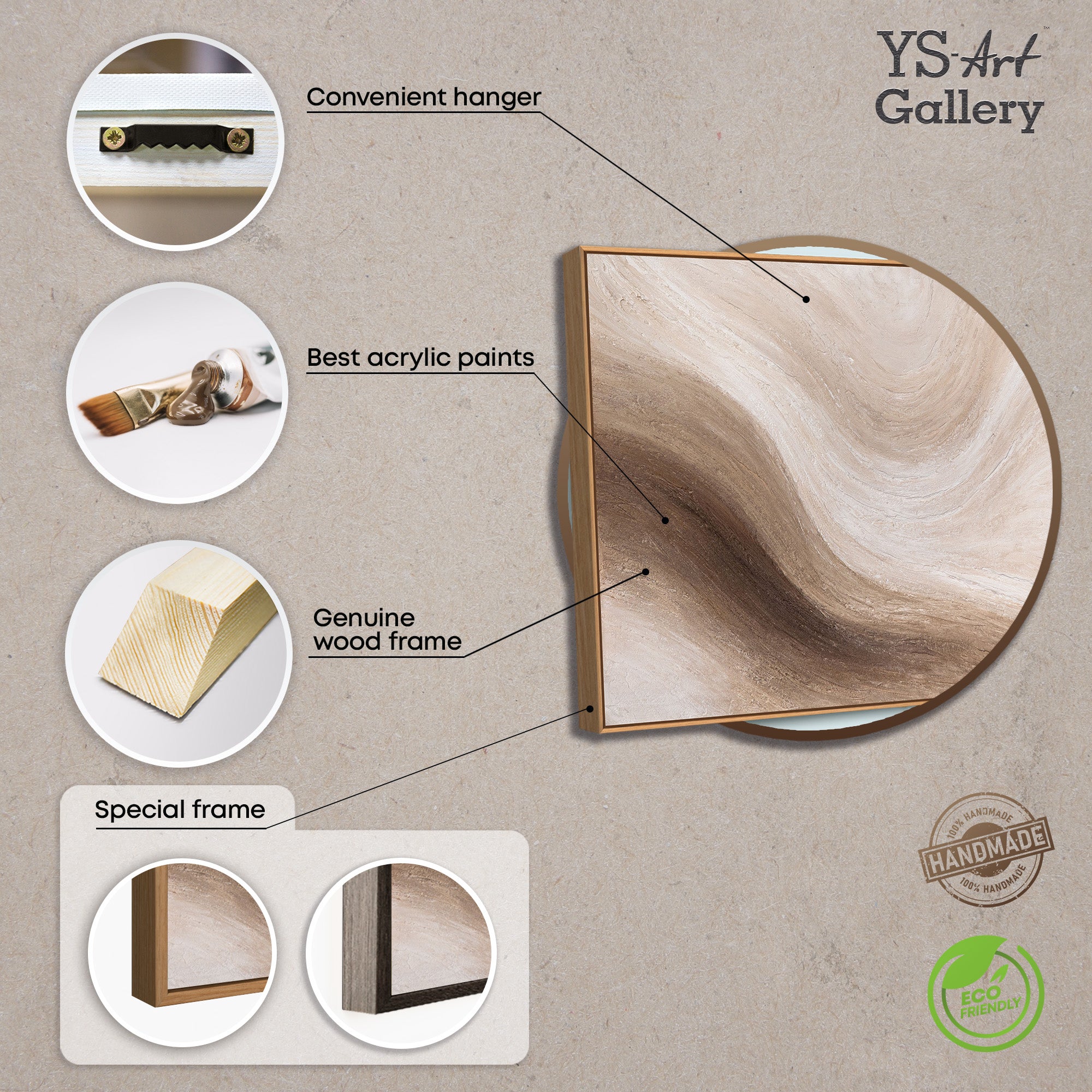 La toile peinte à la main est présentée dans un cadre et convient parfaitement comme décoration murale moderne pour le salon, la chambre à coucher ou les espaces de travail calmes. Les couleurs chaudes ont un effet apaisant et s'intègrent harmonieusement dans les intérieurs naturels et minimalistes.