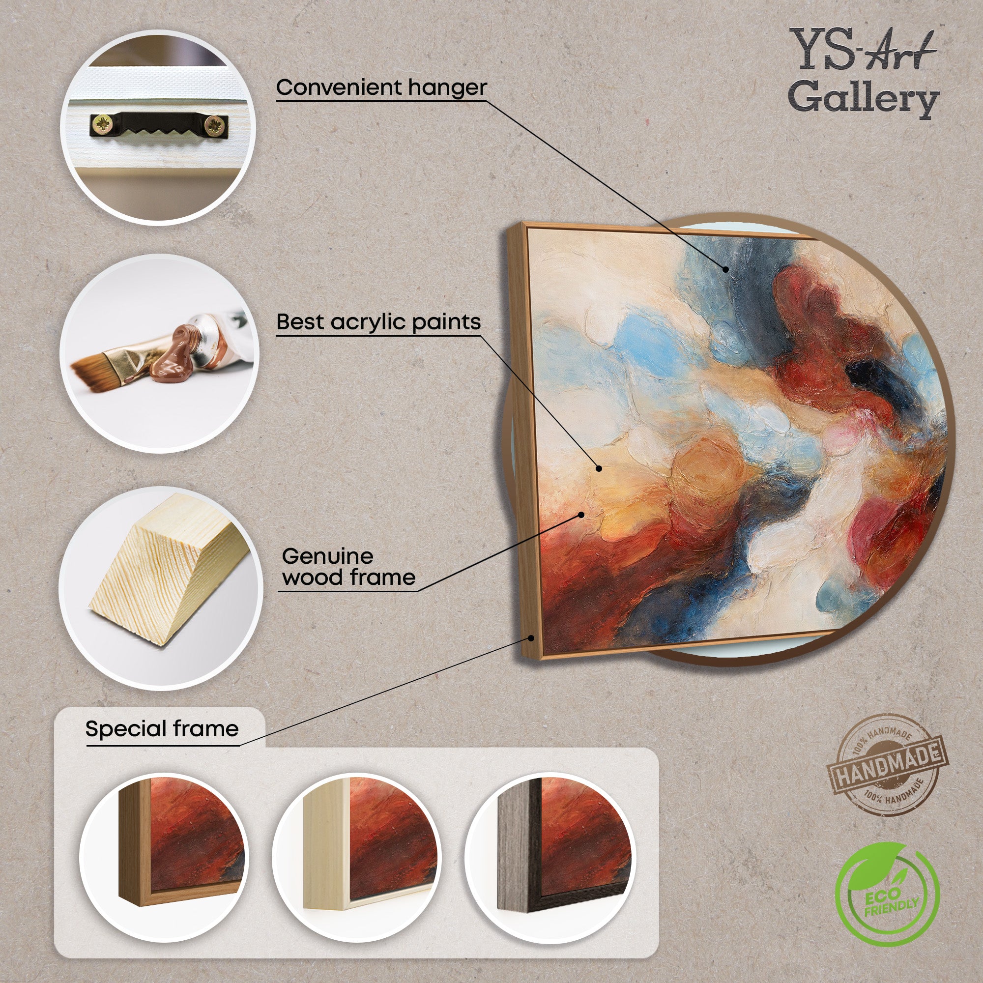 « Musique en Couleurs » est une peinture acrylique abstraite et vibrante qui crée un effet visuel rythmé grâce à des dégradés de couleurs dynamiques et des textures puissantes. Des rouges chauds et des tons terreux côtoient des nuances froides de bleu et de crème, formant une composition à plusieurs niveaux d'un mouvement palpable. La surface en impasto et les coups de pinceau apparents soulignent le caractère artisanal de cette œuvre.