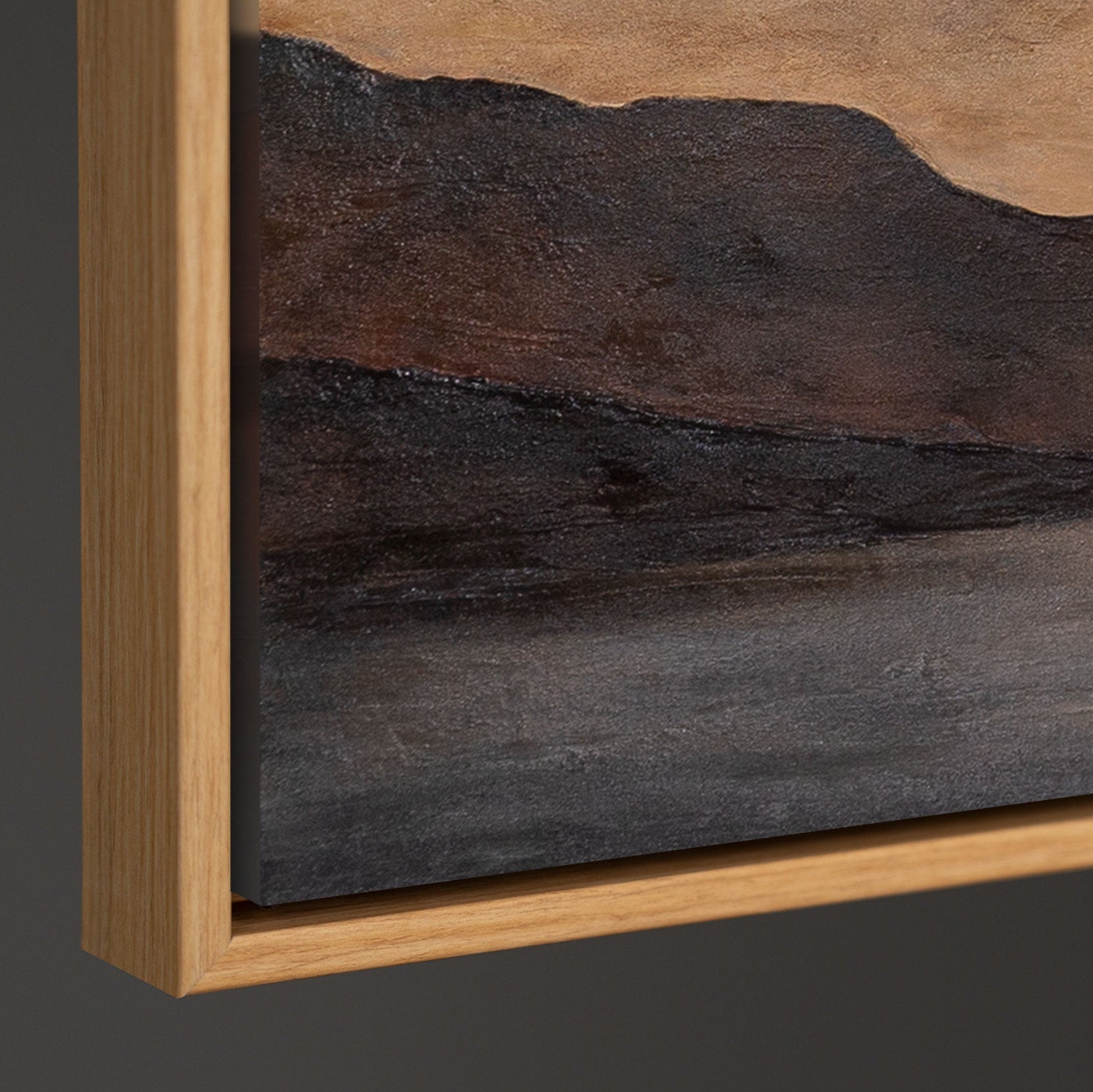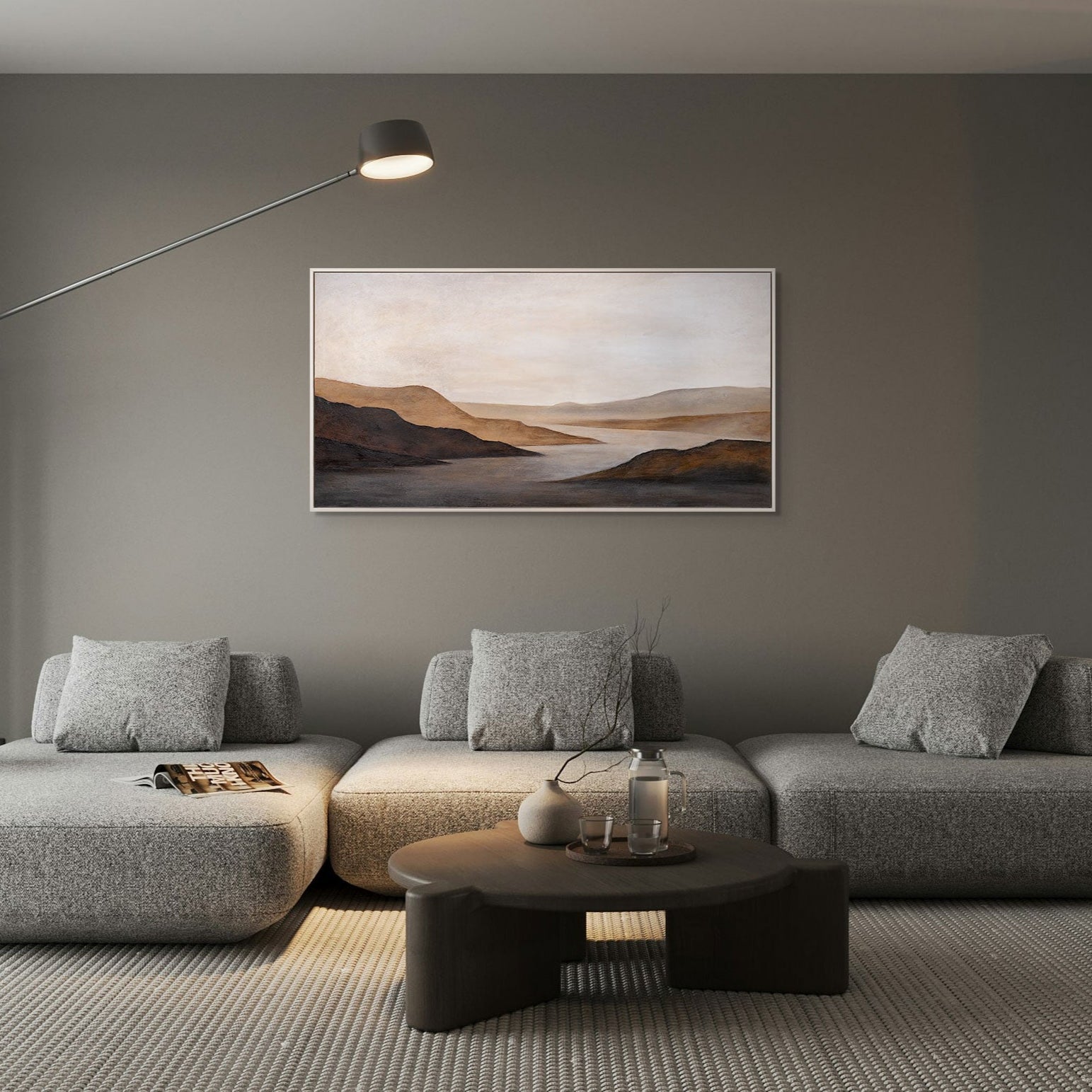 Appréciez l'atmosphère calme de la peinture sur toile réalisée à la main "Douce Levée du Soleil". Des tons terreux chaleureux de beige, brun et gris se fondent doucement pour créer un paysage harmonieux qui capture le début d'une nouvelle journée, empreint de calme et de sérénité. La surface texturée donne de la profondeur à l'œuvre, faisant de cette peinture un élégant point focal.