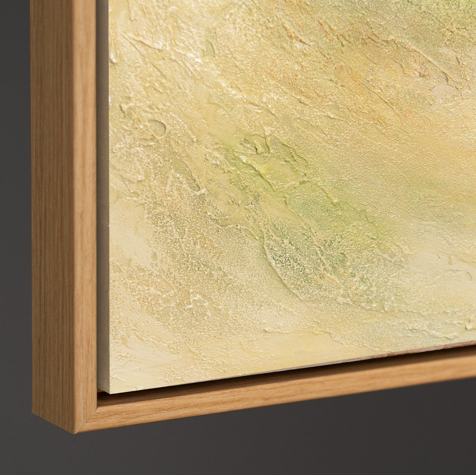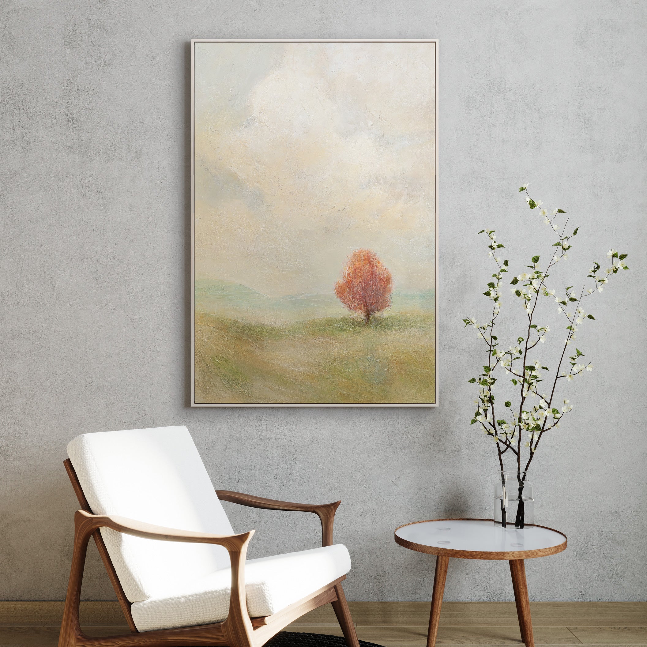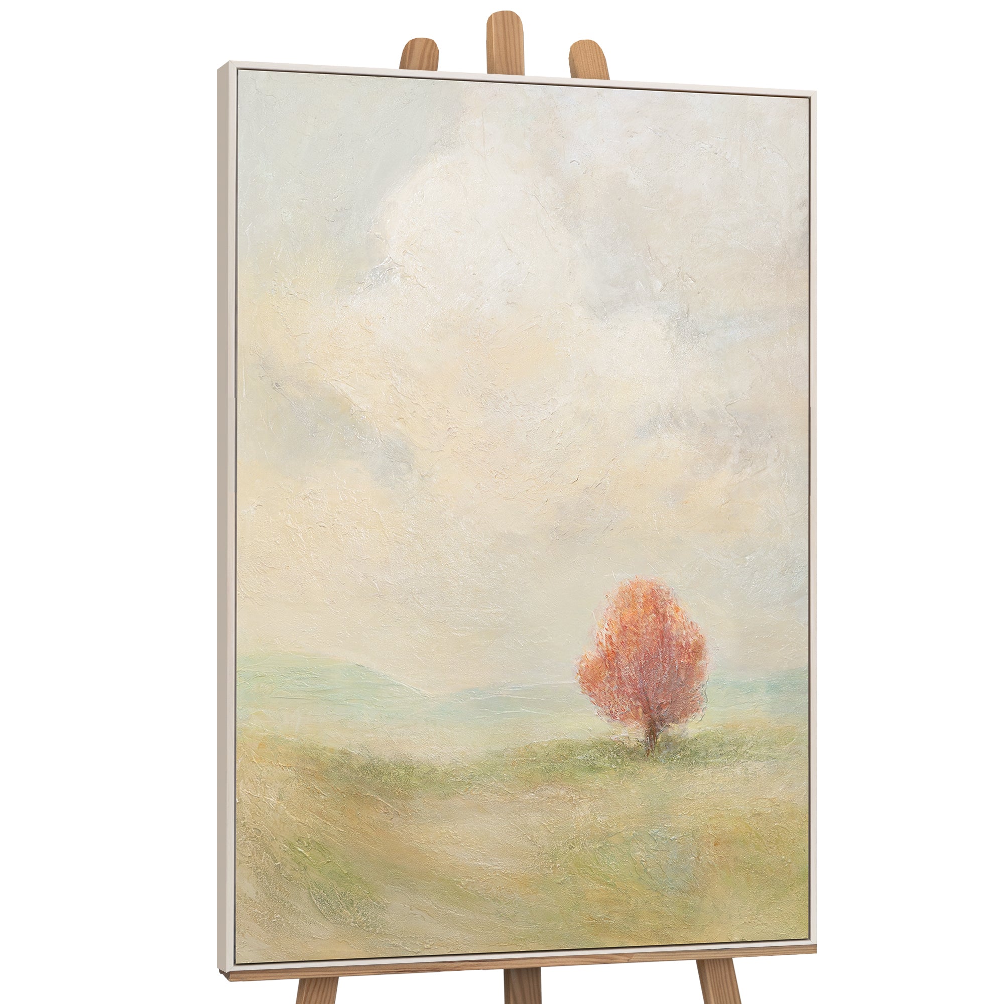 « Étendues Chaleureuses » vous transporte dans un paysage paisible et lumineux, où un arbre solitaire aux douces teintes abricot occupe le devant de la scène. Les subtiles transitions de beige, de vert et de crème créent une atmosphère de sérénité et de sécurité, tandis que la texture fine de la toile donne vie à l'œuvre.