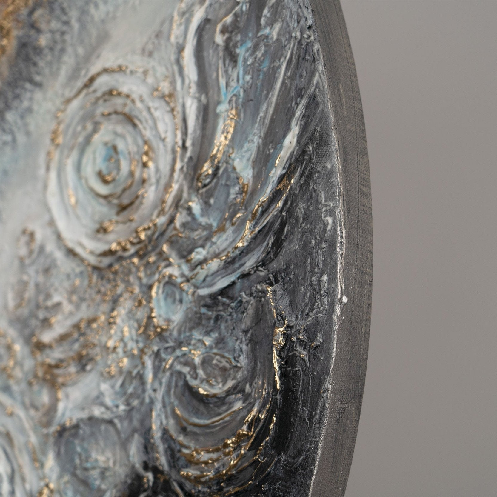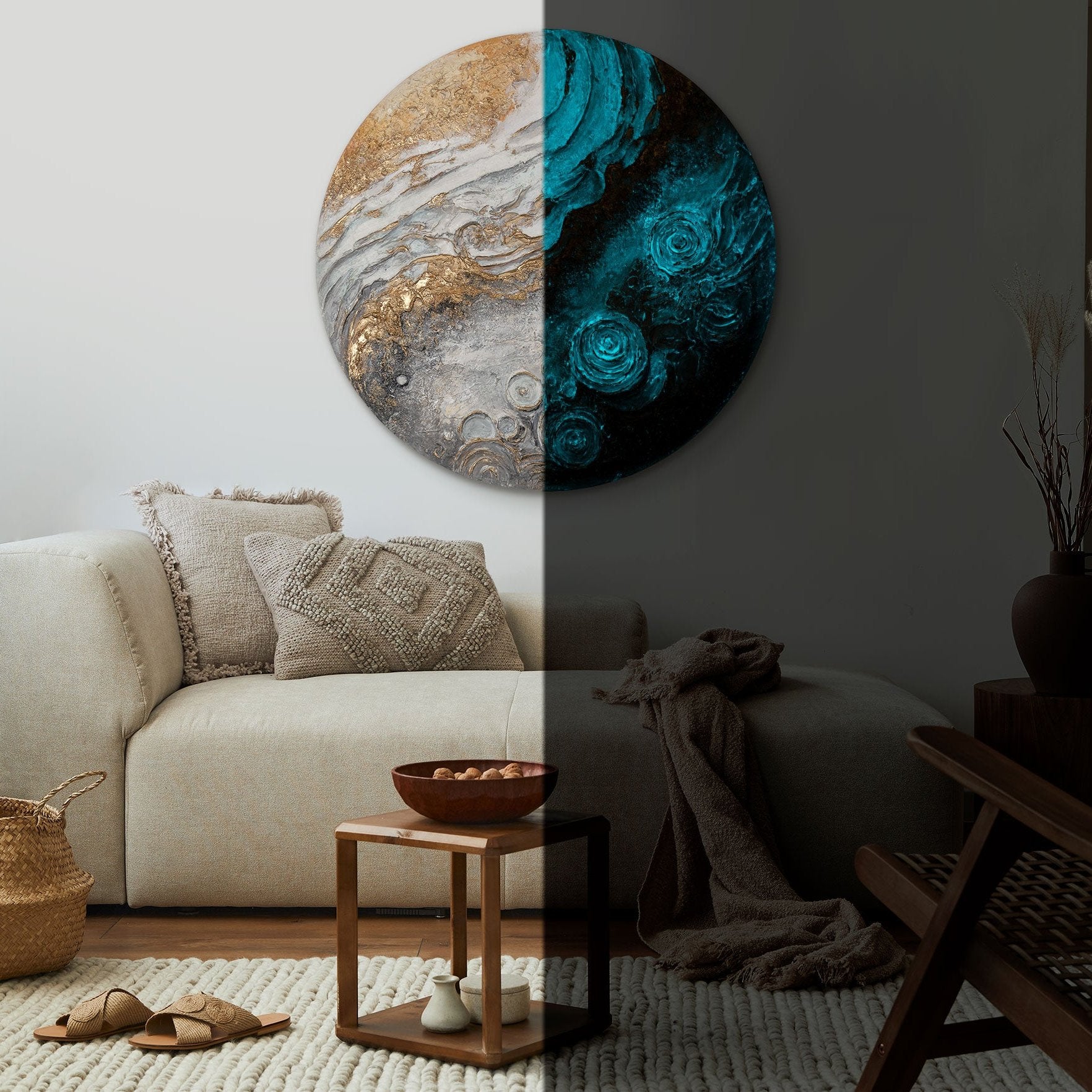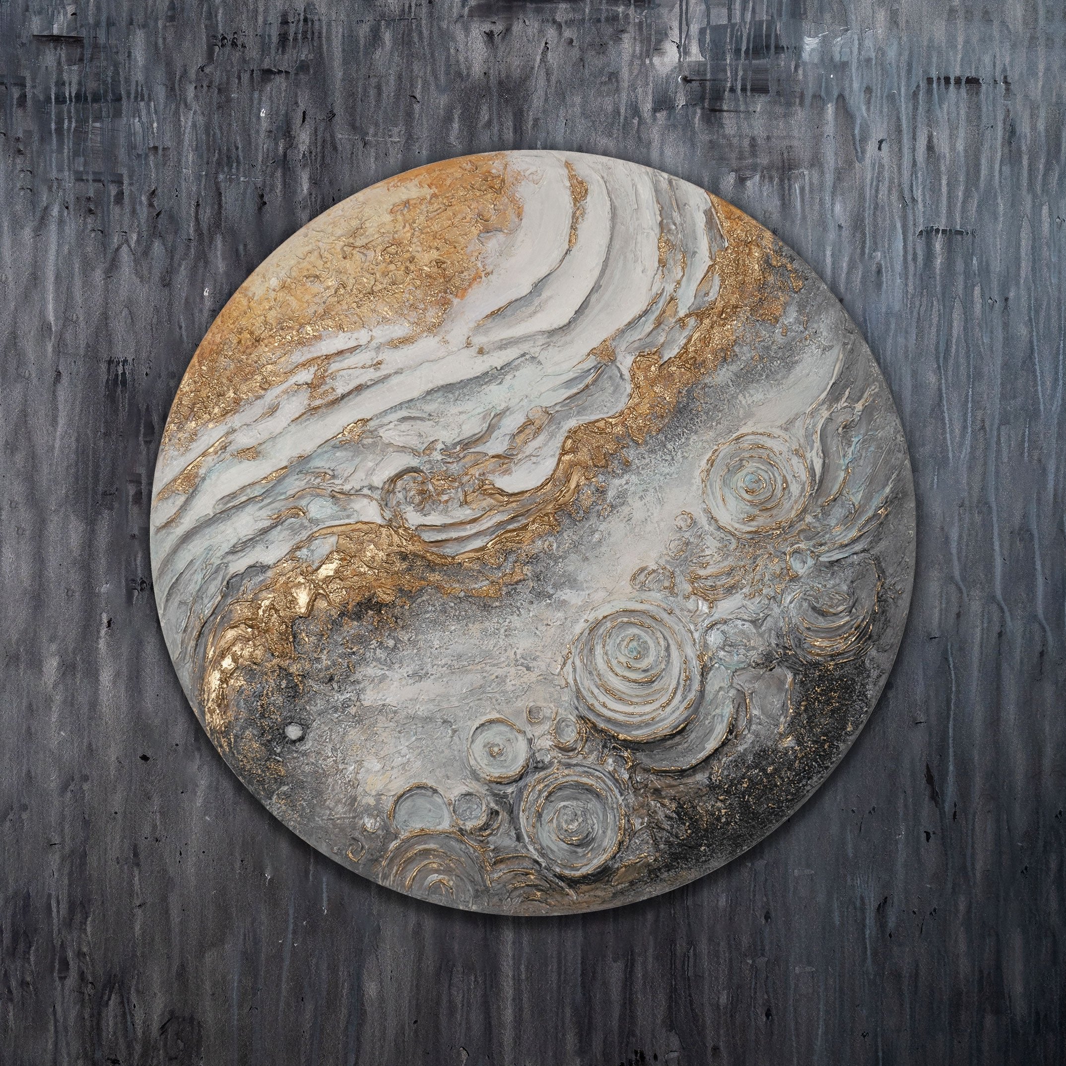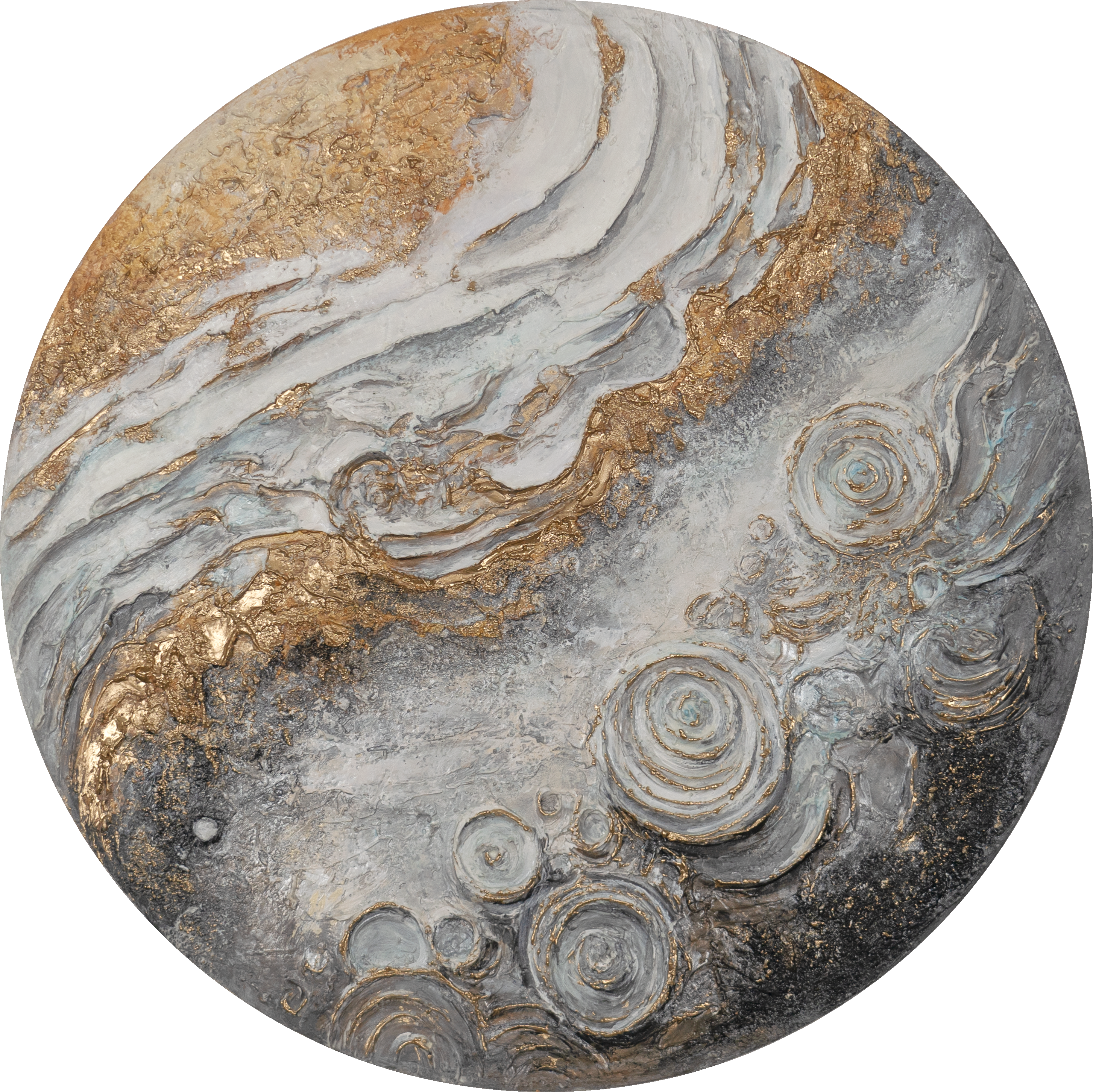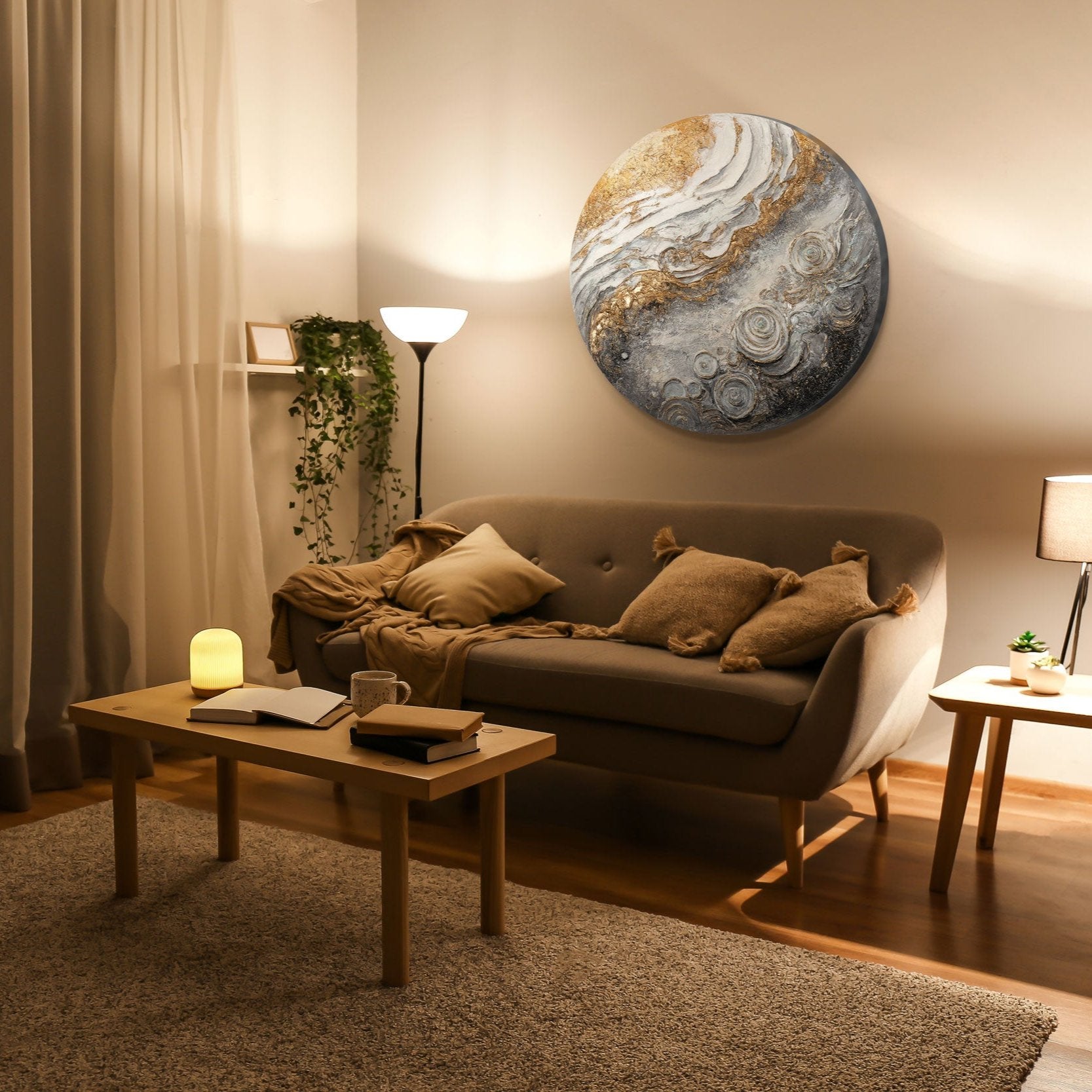 "Sirius" vereint abstrakte Kunst und hochwertige Handwerkskunst. Die leuchtenden Farben und die planetarische Form schaffen eine harmonische und dynamische Umgebung – ideal für Ihre Wohn- oder Büroräume.