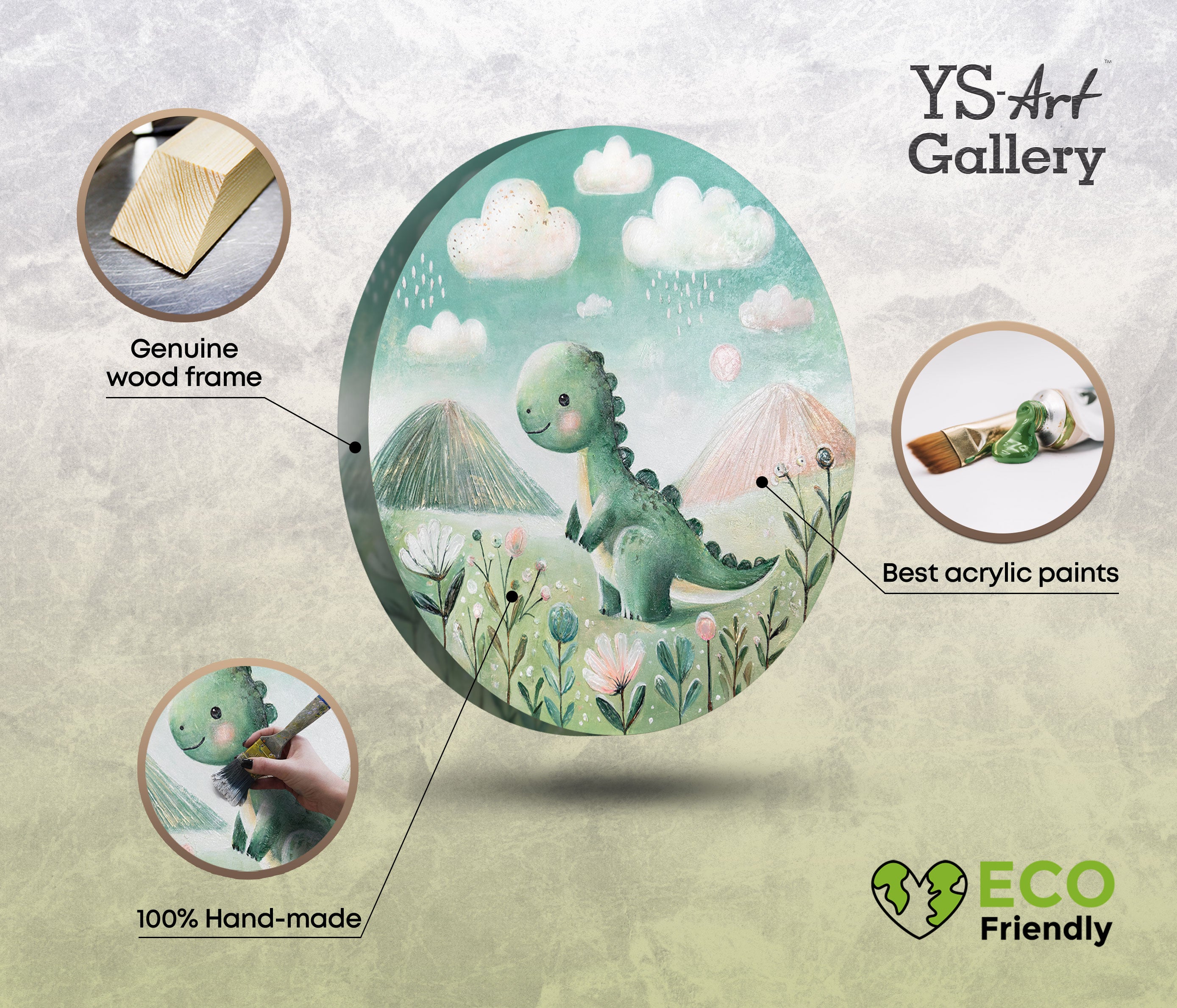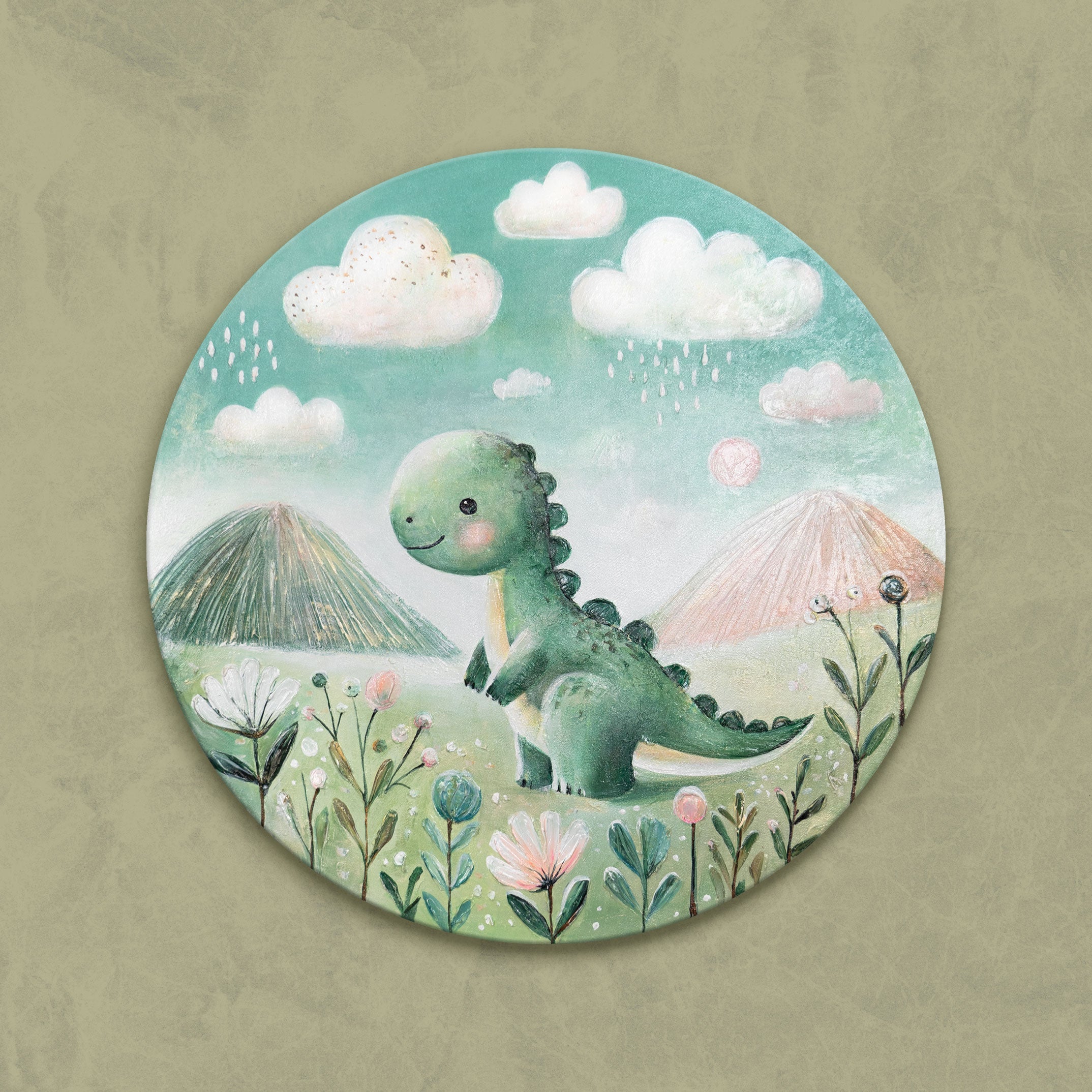 „Dinosaurier“ ist ein rundes, handgemaltes Acrylbild mit einem niedlichen Dino inmitten einer fantasievollen Landschaft. Umgeben von pastellfarbenen Blüten, sanften Wolken und grünen Hügeln, zaubert das Werk eine warme, spielerische Atmosphäre ins Kinderzimmer. Die liebevolle Darstellung fördert Kreativität und Geborgenheit – perfekt für kleine Entdecker.