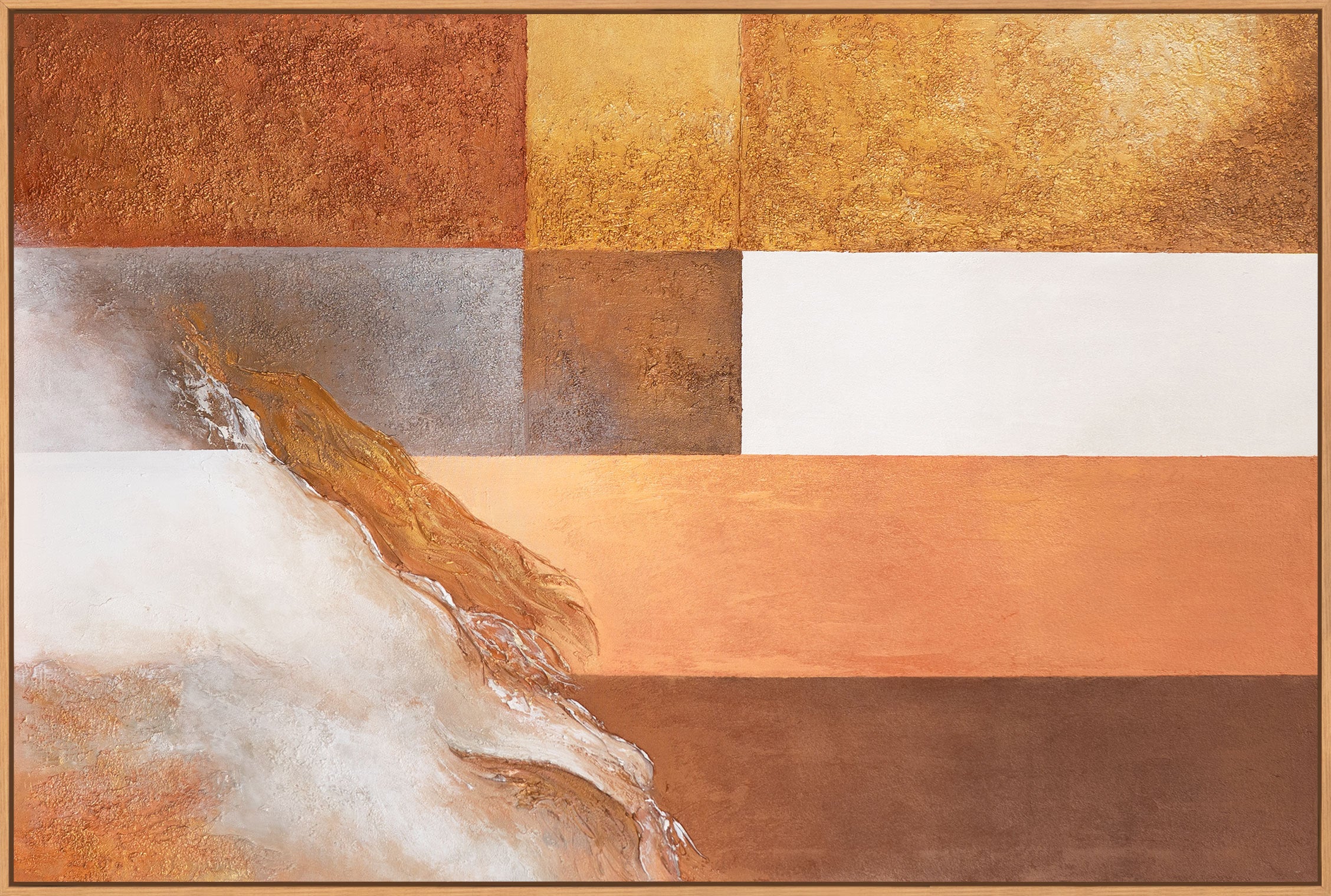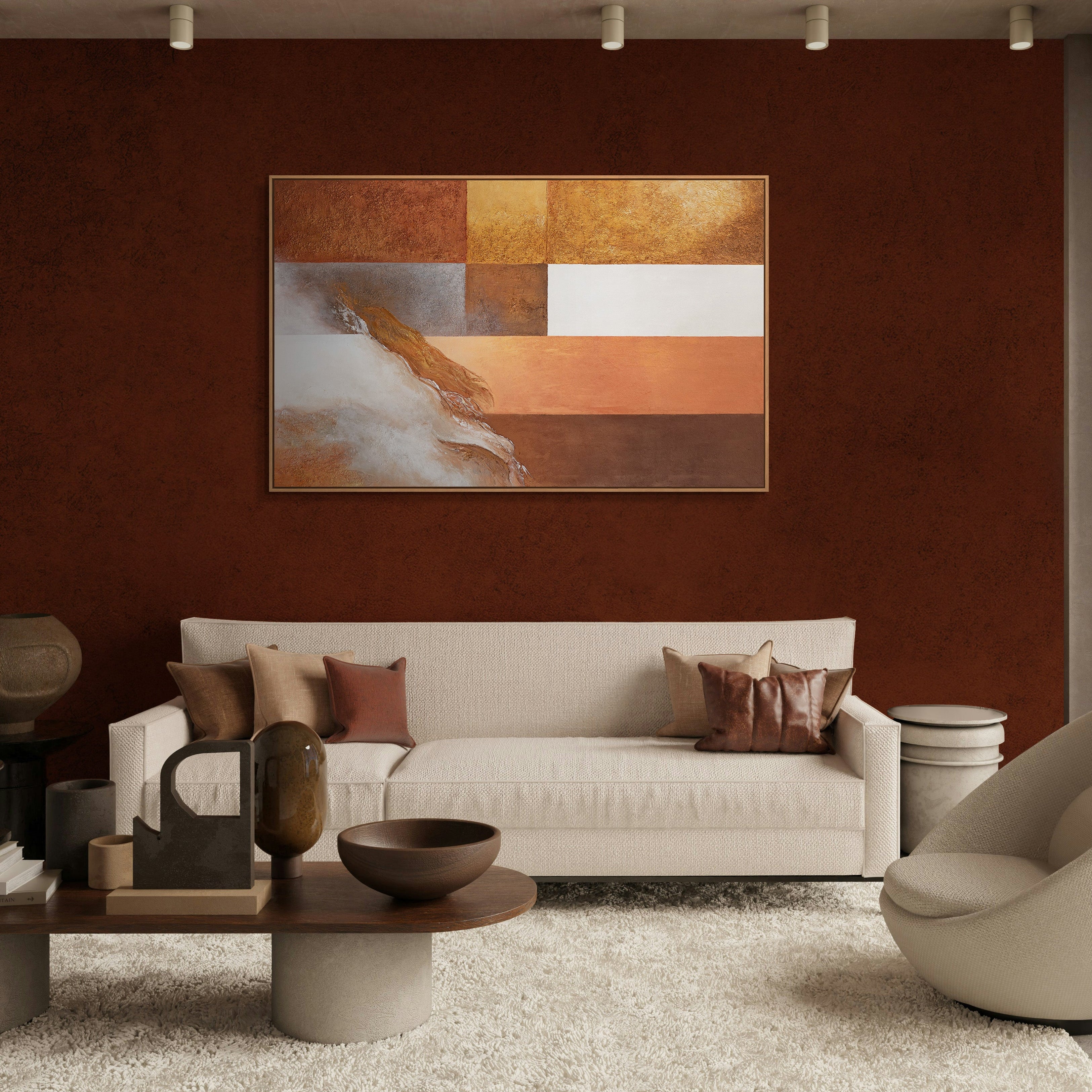« Harmonie des formes » est une peinture acrylique abstraite qui joue avec des surfaces de couleurs claires, des transitions douces et une structure géométrique équilibrée. Des tons chauds de beige, d'ocre et de brun s'associent à des surfaces claires pour former une composition harmonieuse.